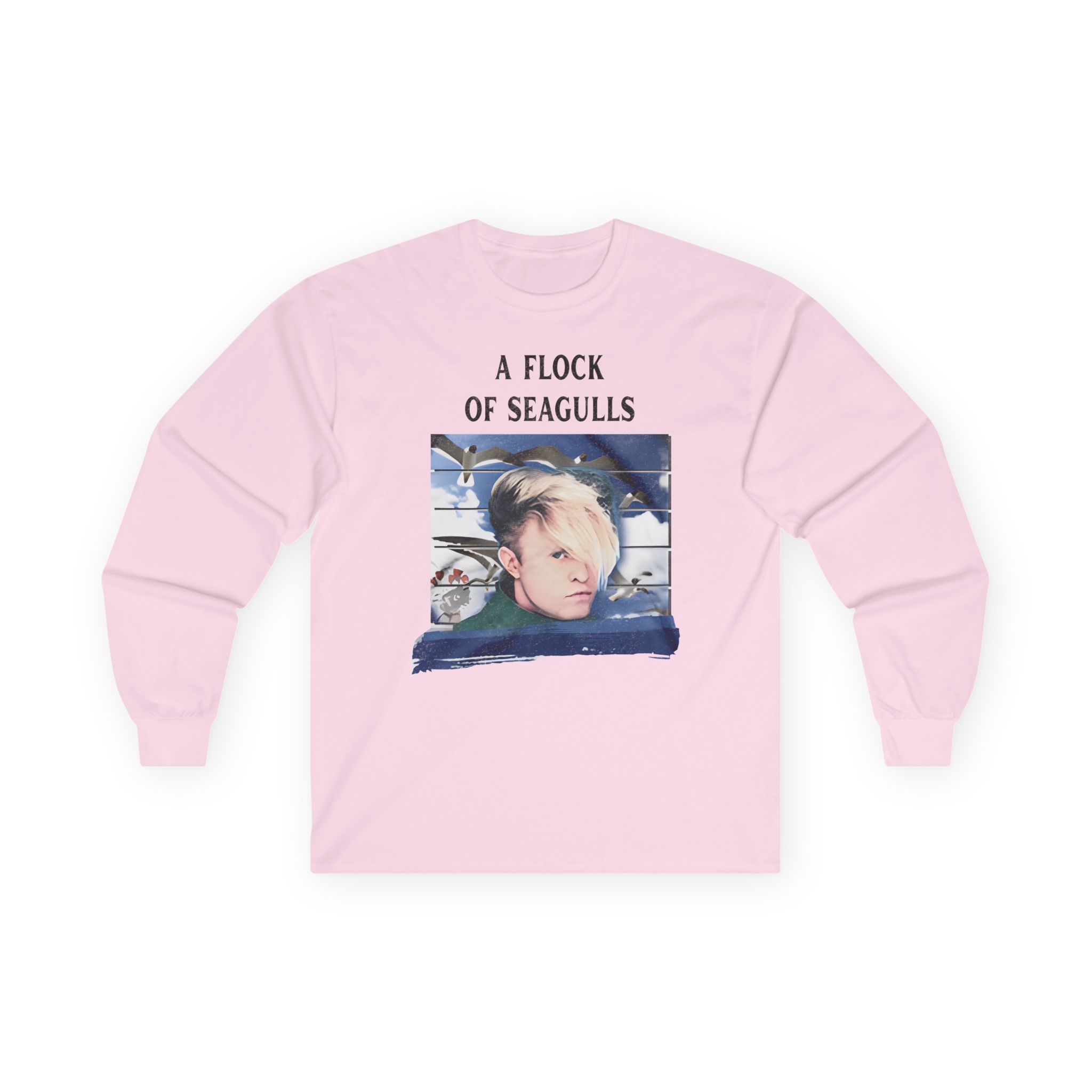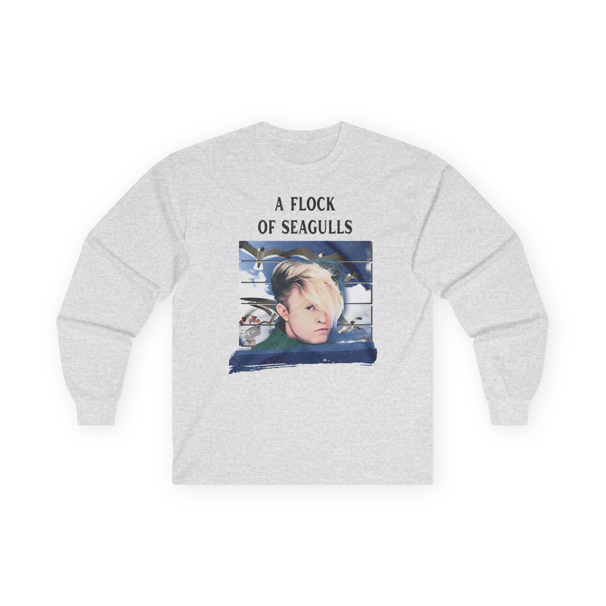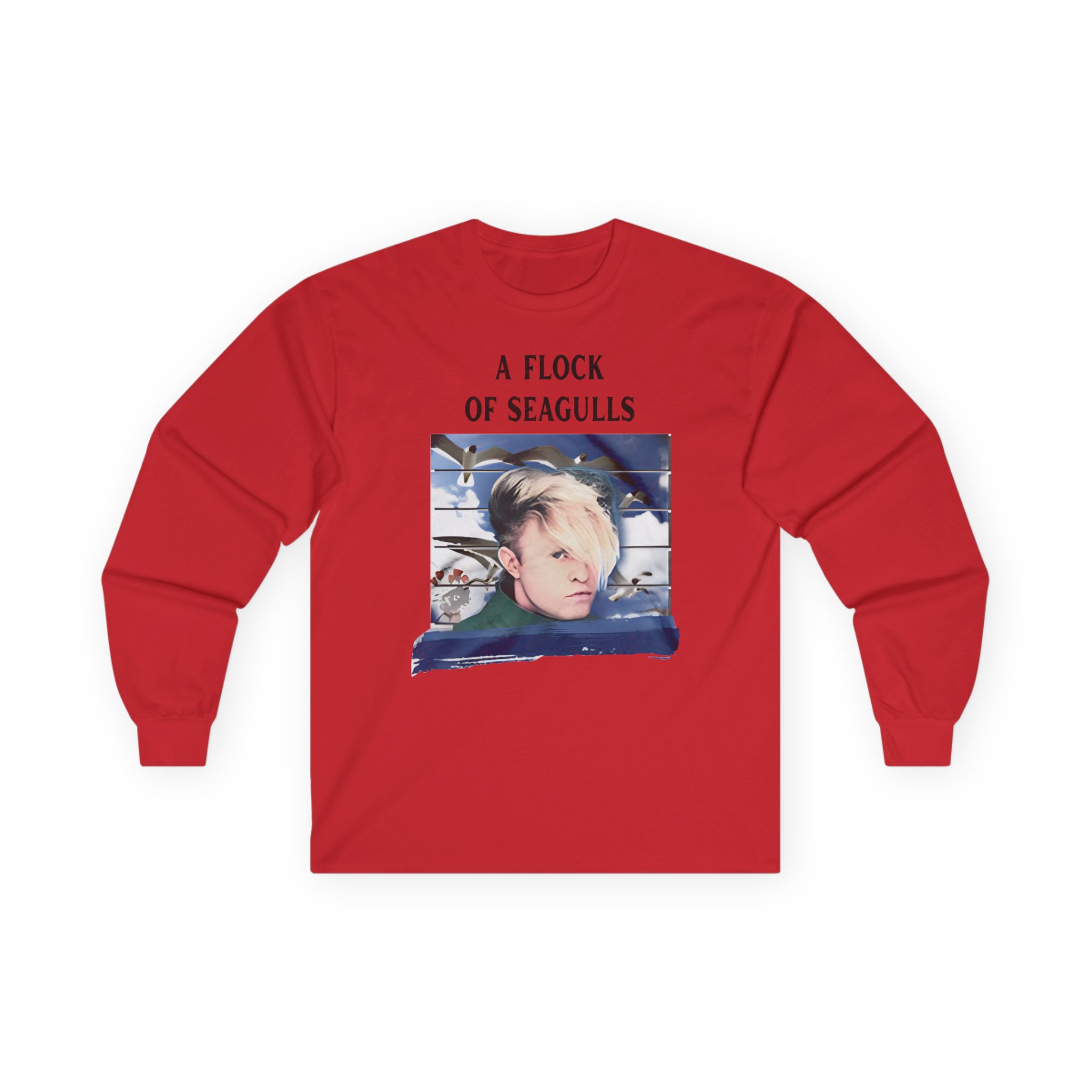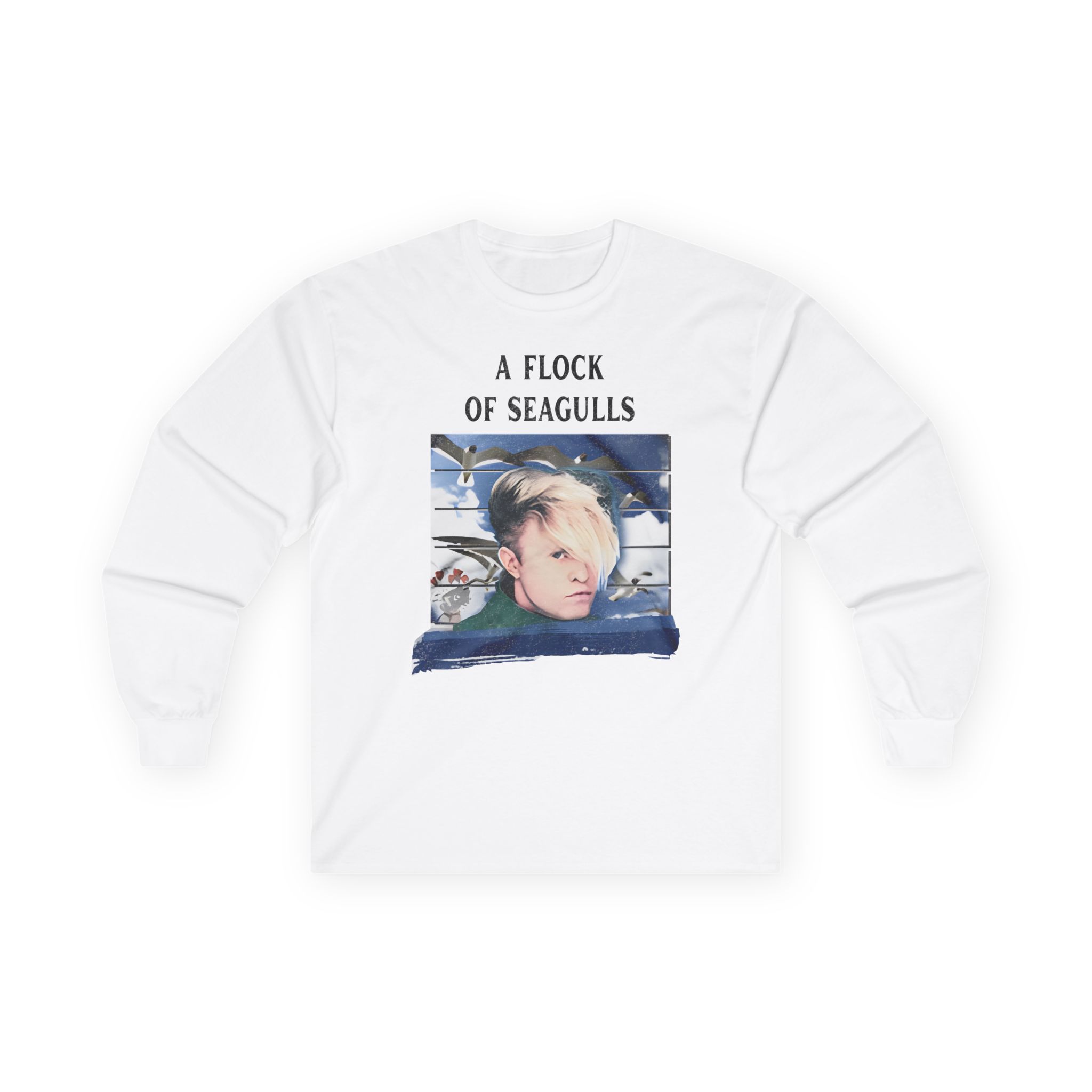 This A Flock of Seagulls Birds in Flight long-sleeve tee brings vintage concert vibes to everyday wear. Soft yet substantial cotton and a classic, slightly boxy fit create a lived-in feel that layers well under jackets or stands alone. The front art—bold mirrored sunglasses, a painted blue nose and red lips—feels like a snapshot from an ’80s tour poster. Wear it to record-store hangs, low-key gigs, or when you want a guarded nod to music history without shouting. It’s the kind of shirt that feels like it already remembers a hundred nights out.