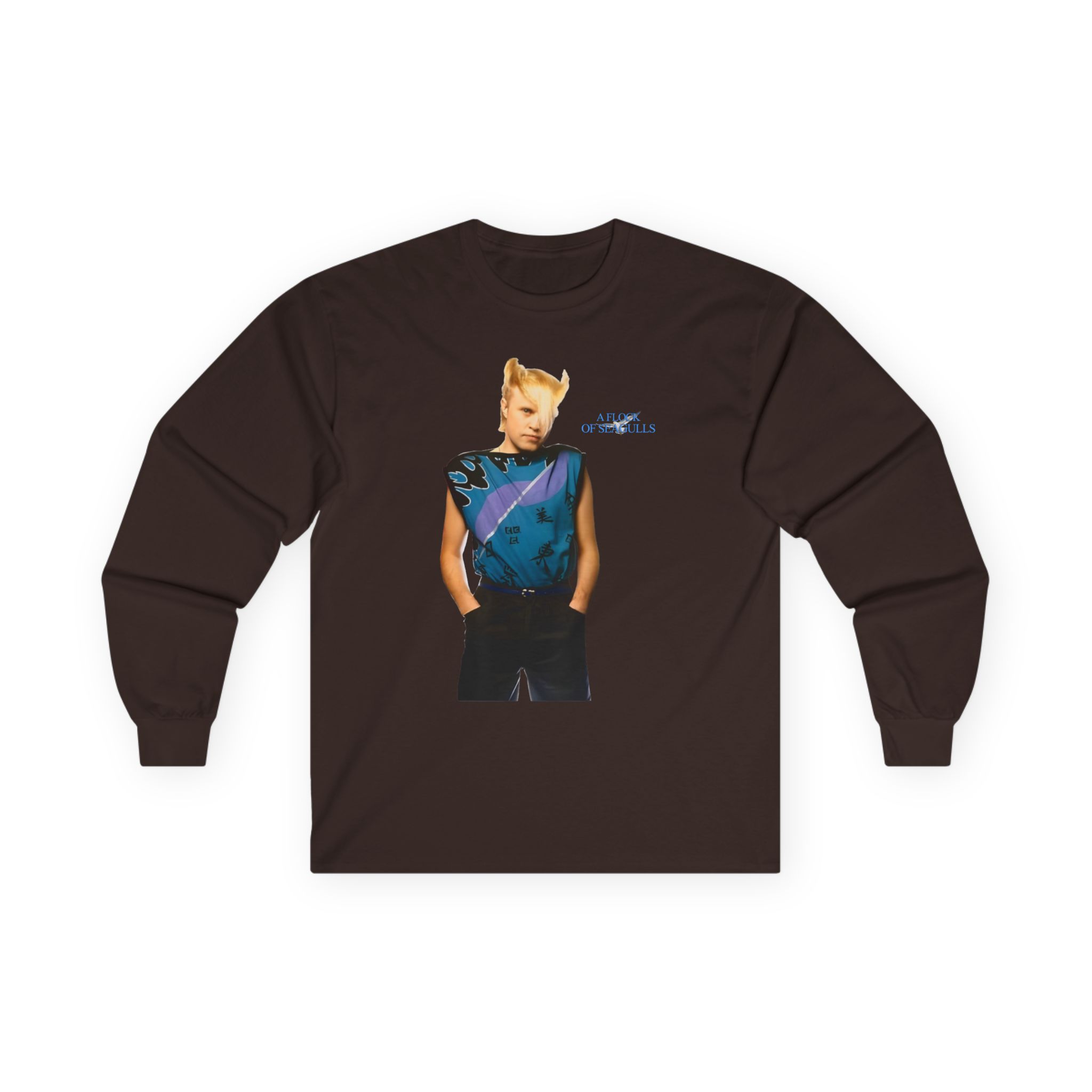 This A Flock of Seagulls Mike Score long-sleeve tee brings vintage concert vibes to everyday wear. Soft yet substantial cotton and a classic, slightly boxy fit create a lived-in feel that layers well under jackets or stands alone. The front art—bold mirrored sunglasses, a painted blue nose and red lips—feels like a snapshot from an ’80s tour poster. Wear it to record-store hangs, low-key gigs, or when you want a guarded nod to music history without shouting. It’s the kind of shirt that feels like it already remembers a hundred nights out.
