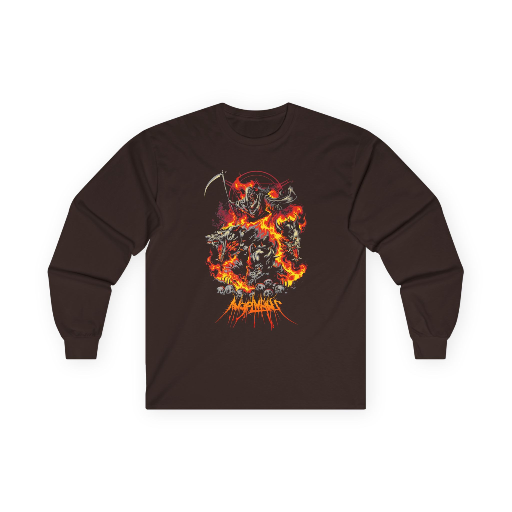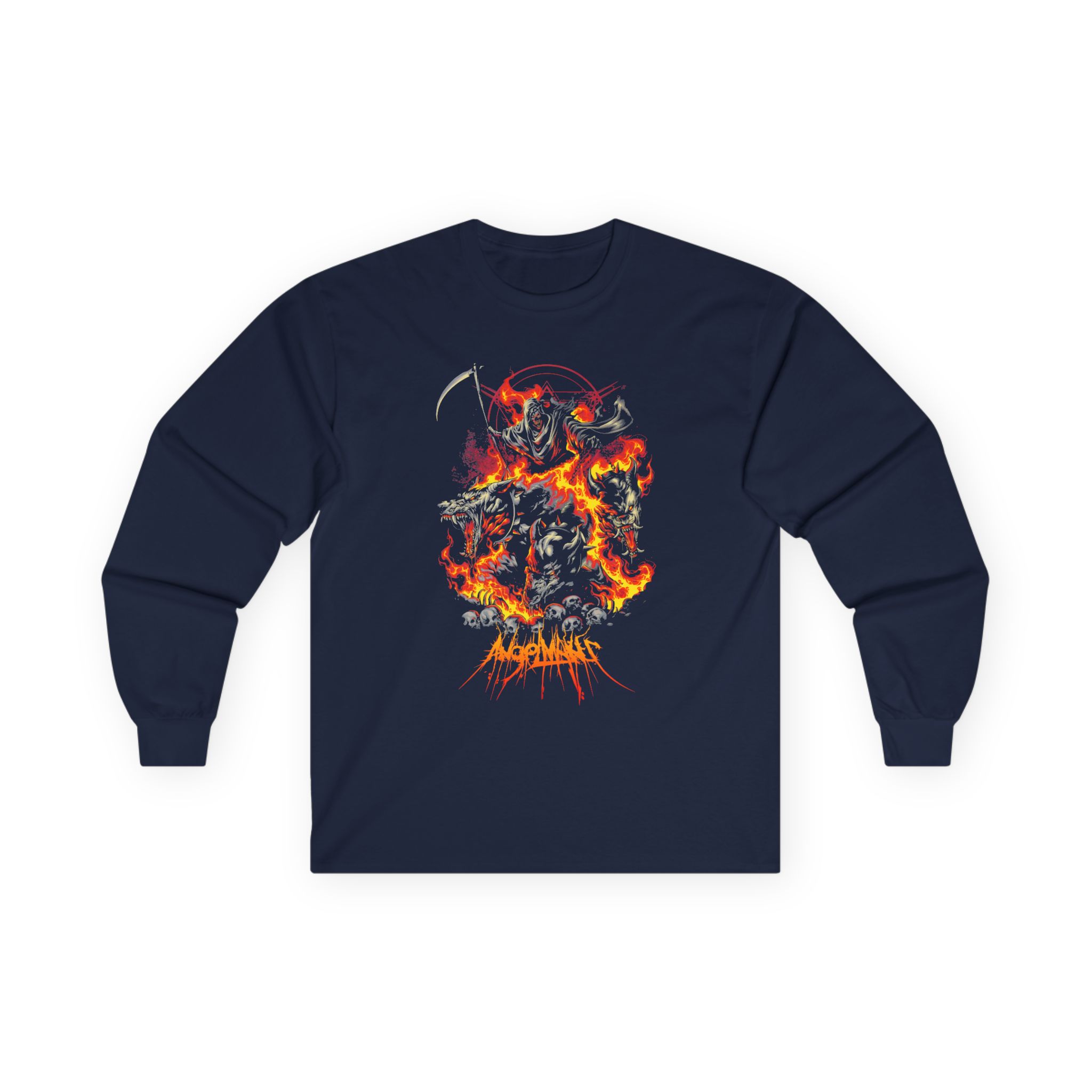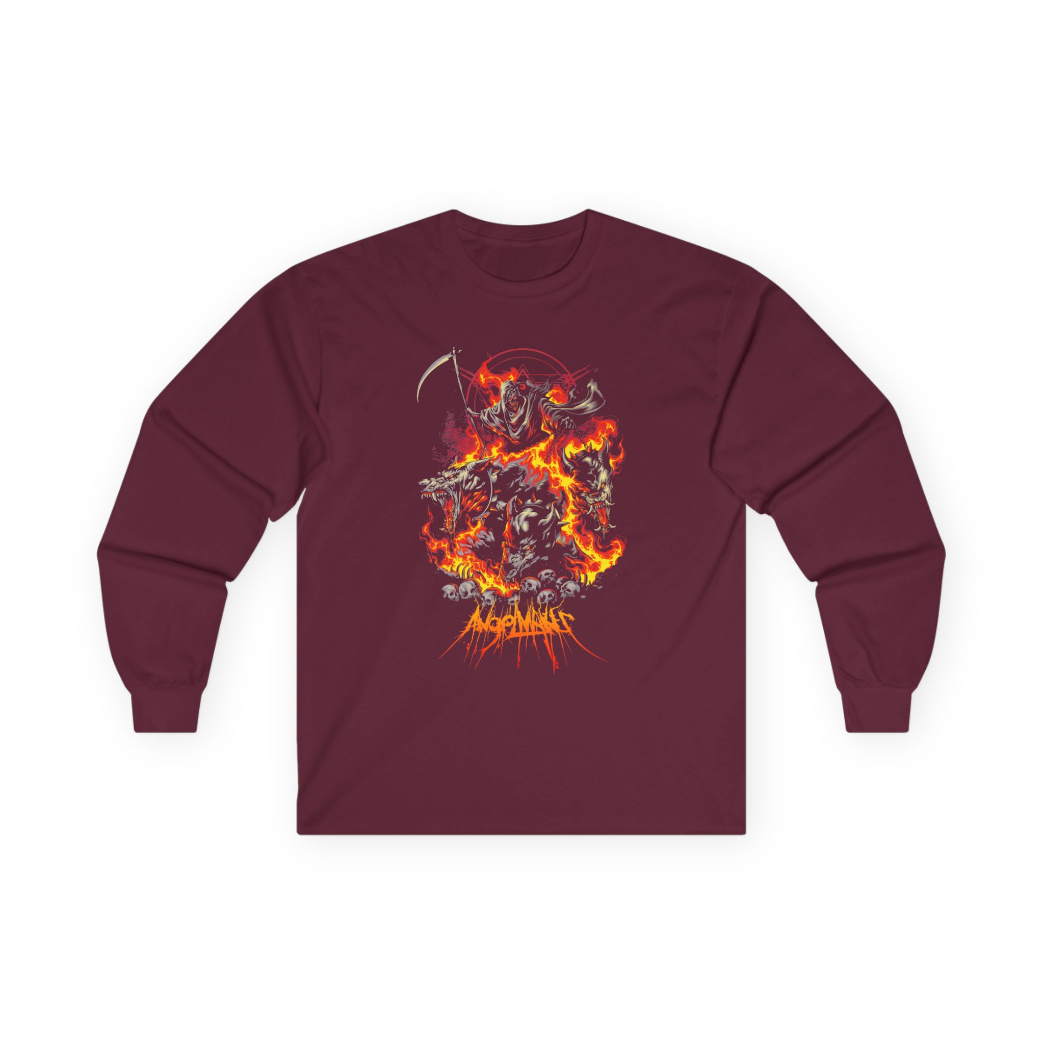 This Angelmaker Hellhound long-sleeve tee brings vintage concert vibes to everyday wear. Soft yet substantial cotton and a classic, slightly boxy fit create a lived-in feel that layers well under jackets or stands alone. The front art—bold mirrored sunglasses, a painted blue nose and red lips—feels like a snapshot from an ’80s tour poster. Wear it to record-store hangs, low-key gigs, or when you want a guarded nod to music history without shouting. It’s the kind of shirt that feels like it already remembers a hundred nights out.