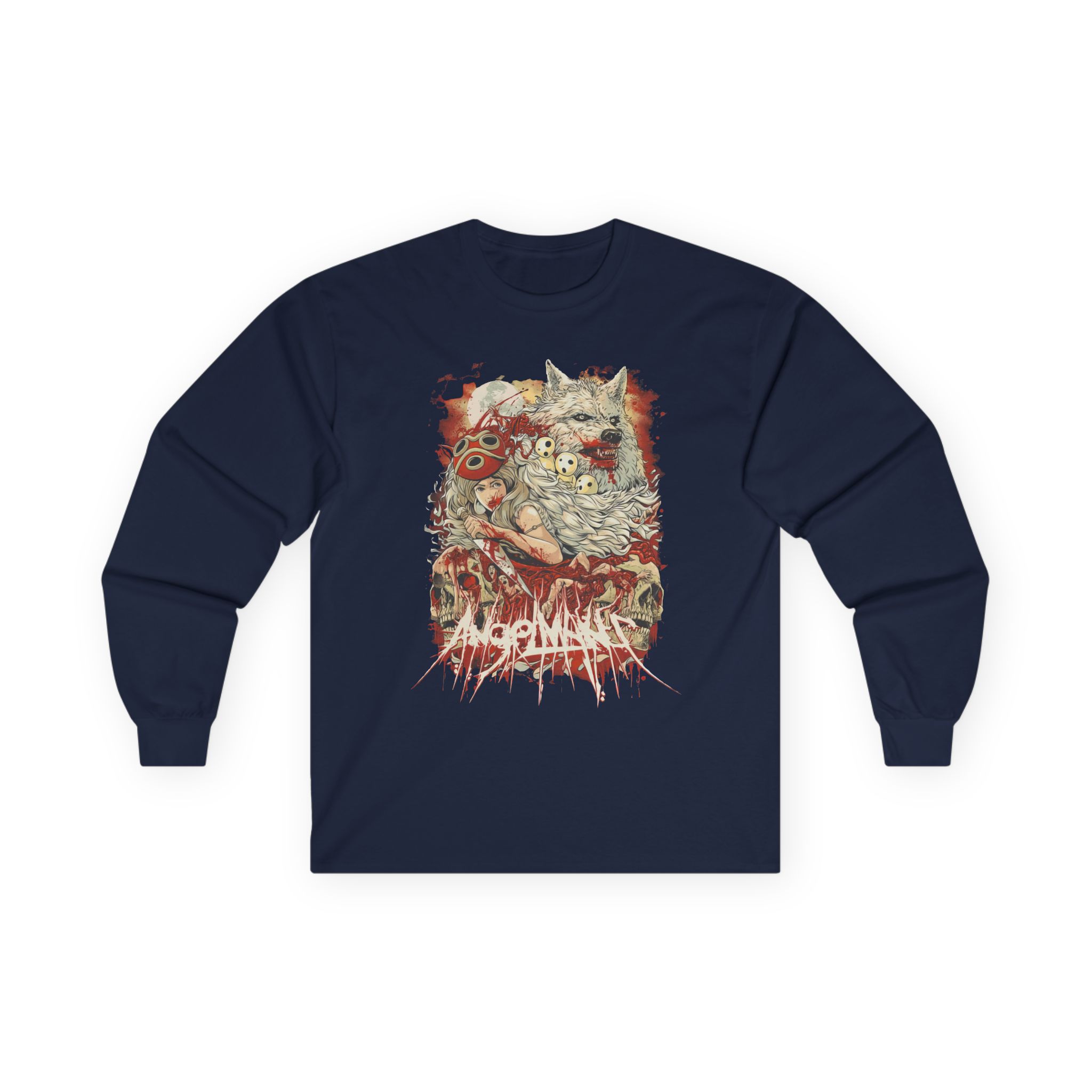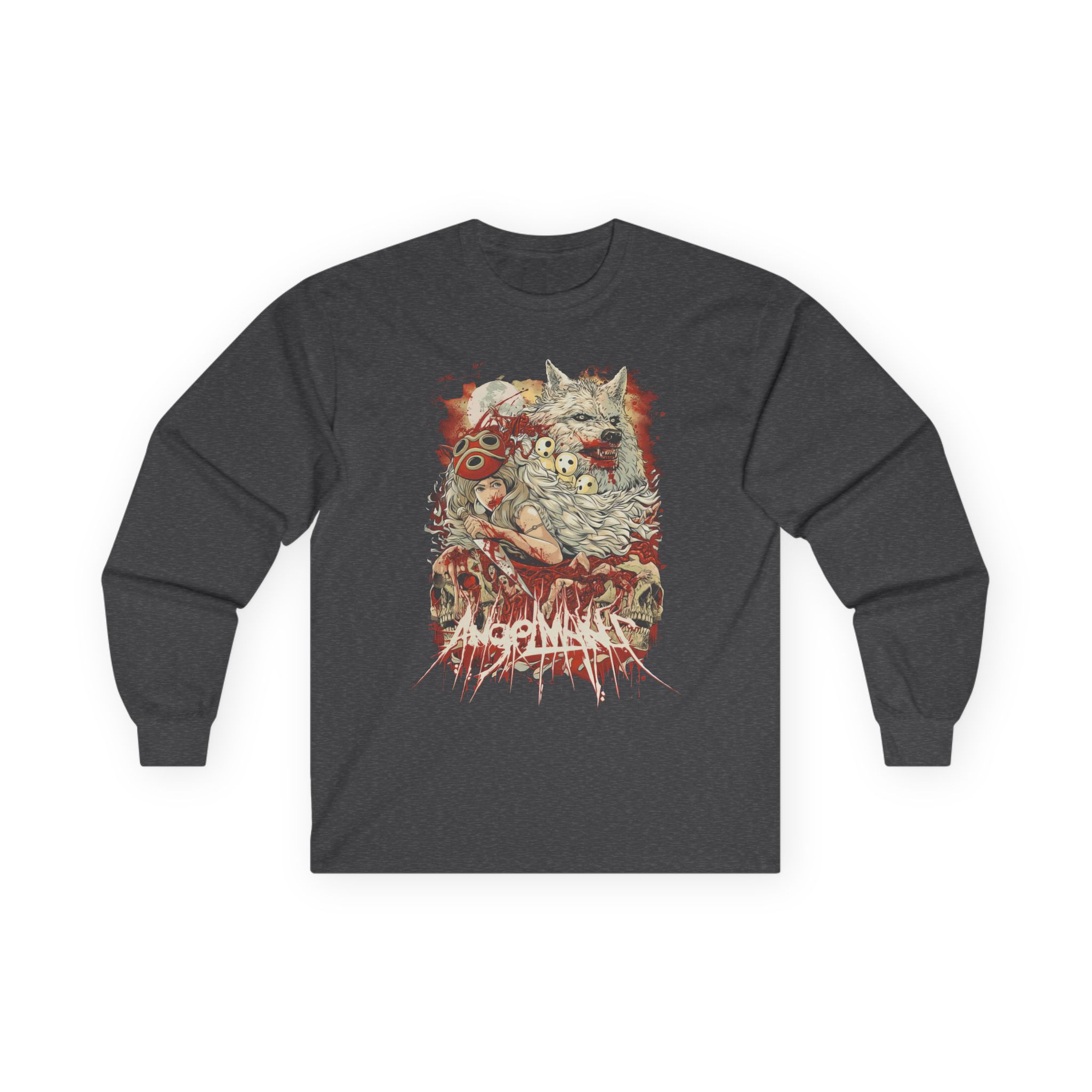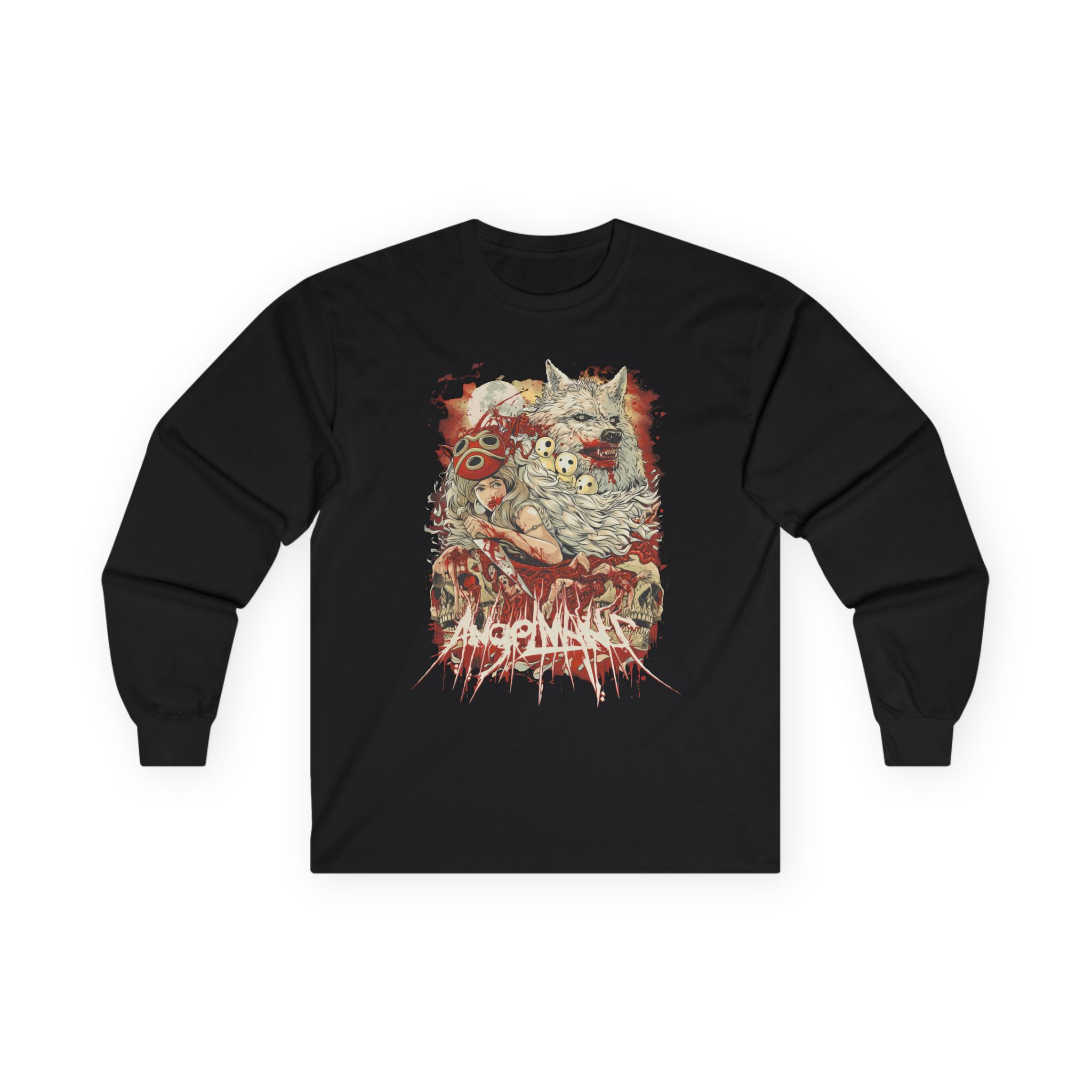 This Angelmaker Mononoke long-sleeve tee brings vintage concert vibes to everyday wear. Soft yet substantial cotton and a classic, slightly boxy fit create a lived-in feel that layers well under jackets or stands alone. The front art—bold mirrored sunglasses, a painted blue nose and red lips—feels like a snapshot from an ’80s tour poster. Wear it to record-store hangs, low-key gigs, or when you want a guarded nod to music history without shouting. It’s the kind of shirt that feels like it already remembers a hundred nights out.