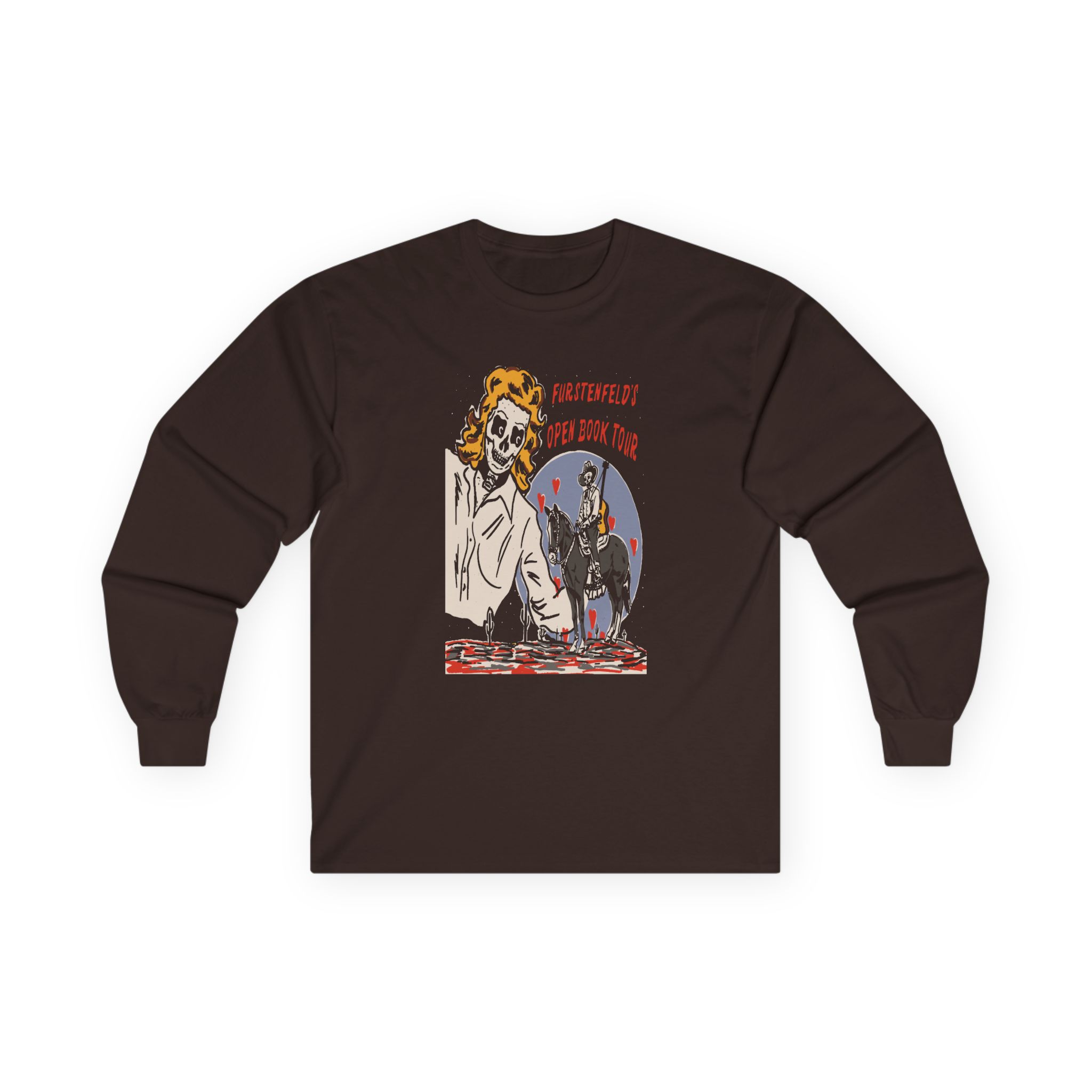 This Blue October Open Book Skeleton Cowboy long-sleeve tee brings vintage concert vibes to everyday wear. Soft yet substantial cotton and a classic, slightly boxy fit create a lived-in feel that layers well under jackets or stands alone. The front art—bold mirrored sunglasses, a painted blue nose and red lips—feels like a snapshot from an ’80s tour poster. Wear it to record-store hangs, low-key gigs, or when you want a guarded nod to music history without shouting. It’s the kind of shirt that feels like it already remembers a hundred nights out.