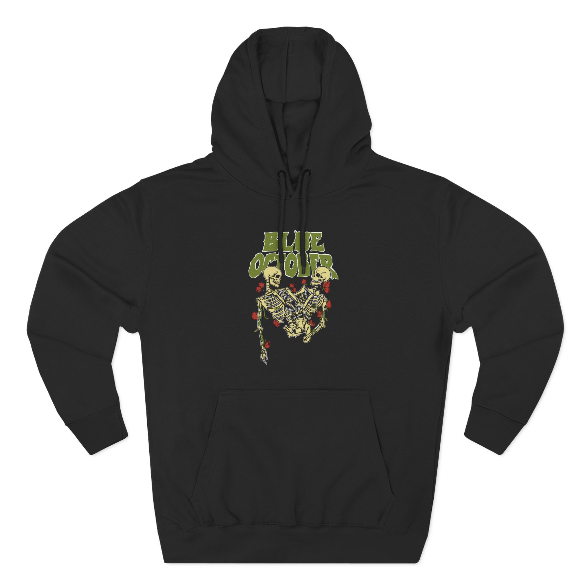 This Blue October Skeleton Buddies charcoal fleece hoodie settles into your rotation like an old friend — soft, weighty, and quietly bold. The three-panel hood and adjustable drawcord frame your face on blustery mornings. A roomy kangaroo pocket keeps hands warm and holds what you need for a quick walk or a late-night errand. The front artwork sits low and distressed, giving the piece a lived-in, slightly rebellious vibe that works whether you’re heading to a gig, a practice, or a coffee run. Built with sturdy double-needle seams and a soft 3-end fleece interior, it wears well over years of wear and washes while keeping its shape.