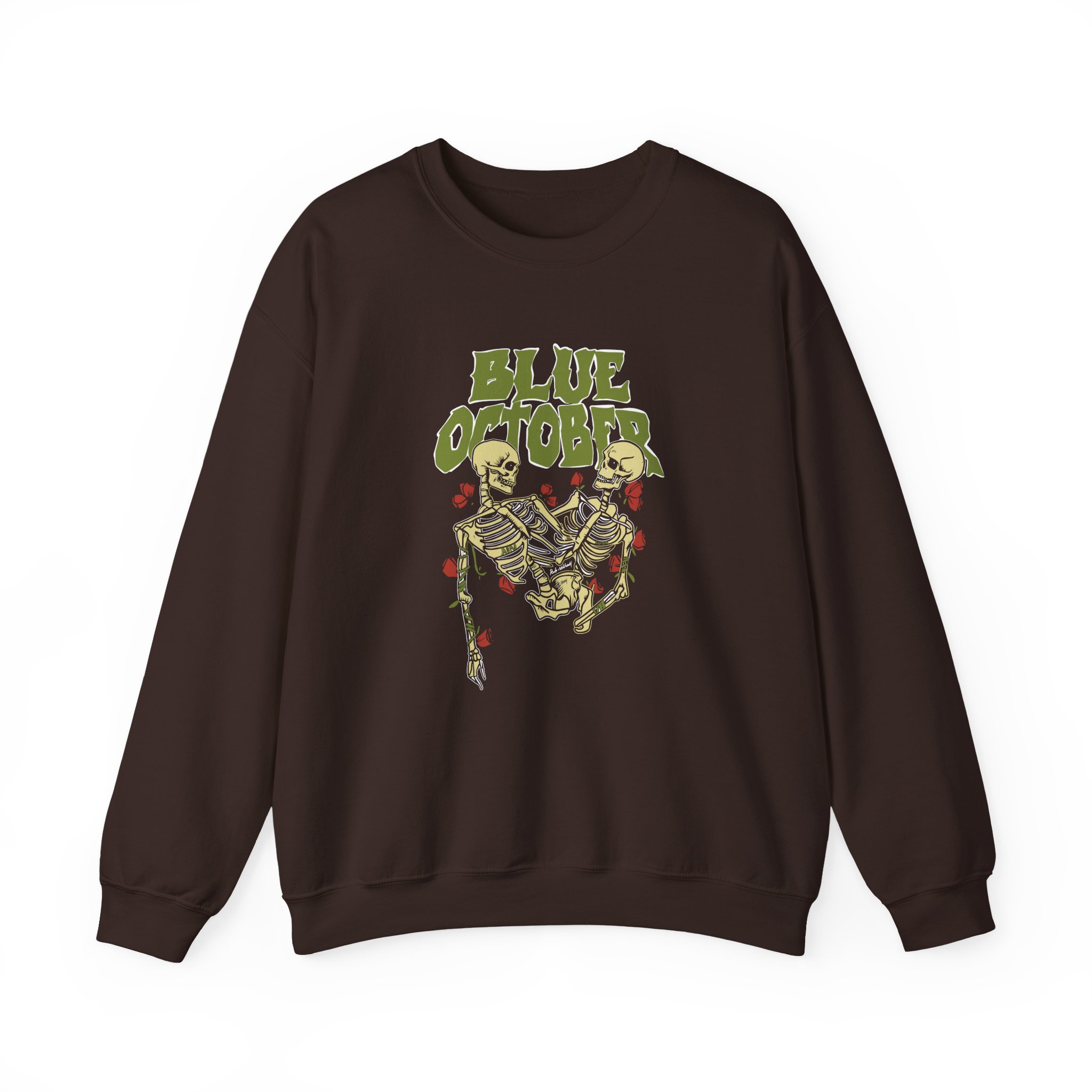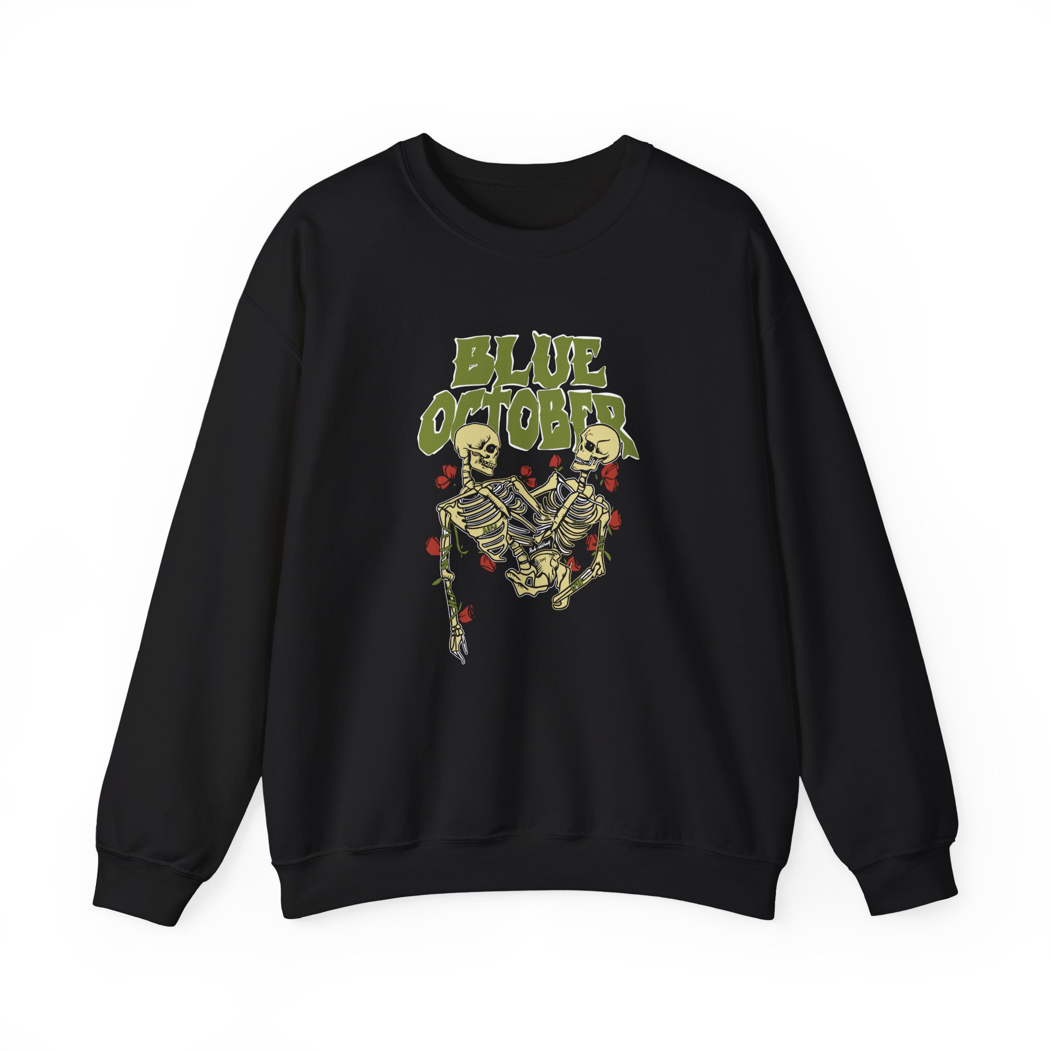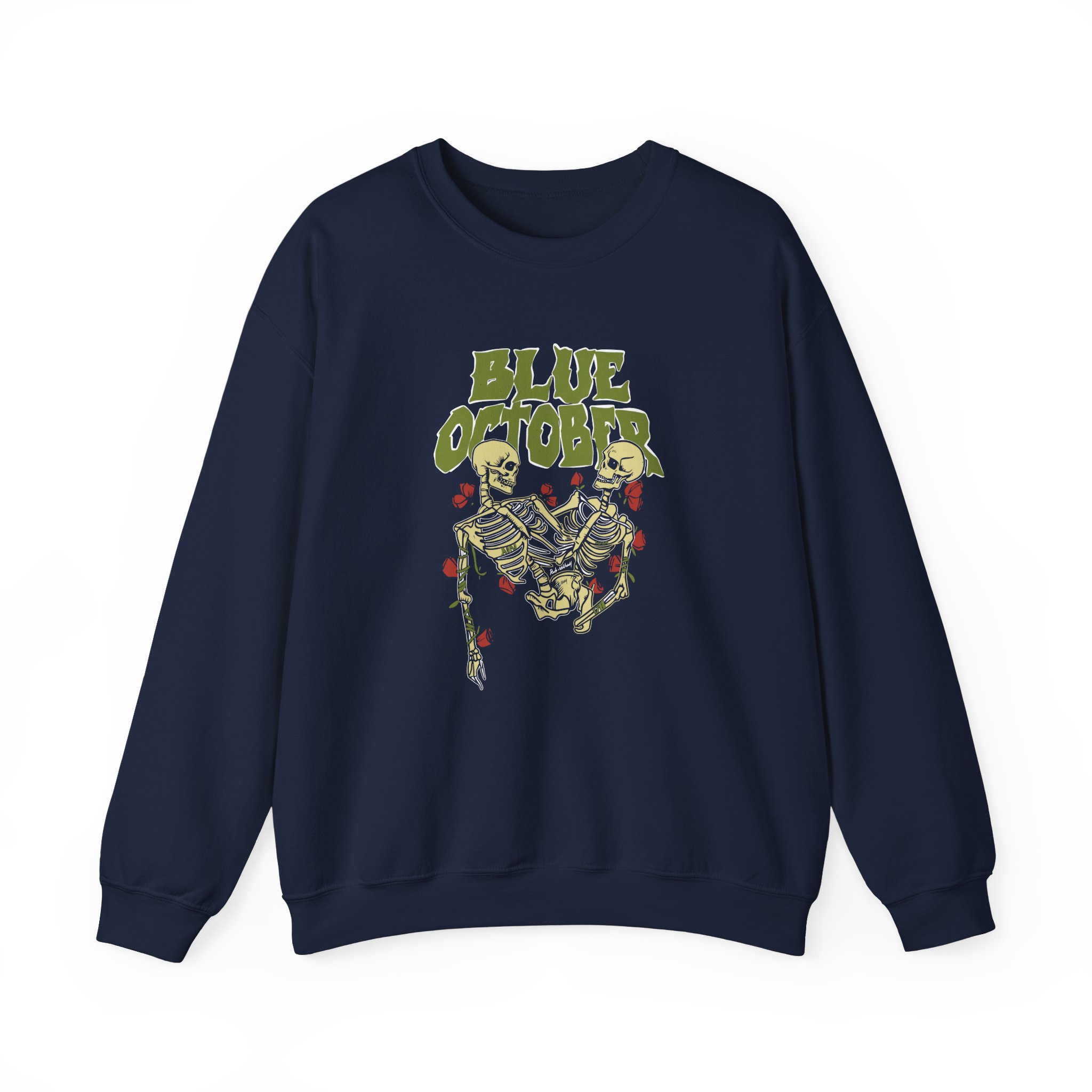 The Gildan 18000 sweatshirt is a Blue October Skeleton Buddies unisex heavy blend crewneck made from a 50/50 cotton-polyester fabric, combining softness with lasting durability. Its smooth surface supports crisp, vibrant prints and embroidery, while the ribbed-knit collar and reinforced cuffs help it keep its shape over time. A seamless body design reduces irritation and adds to overall comfort. Practical, sturdy, and print-friendly, the Gildan 18000 sweatshirt remains a top choice for custom apparel.