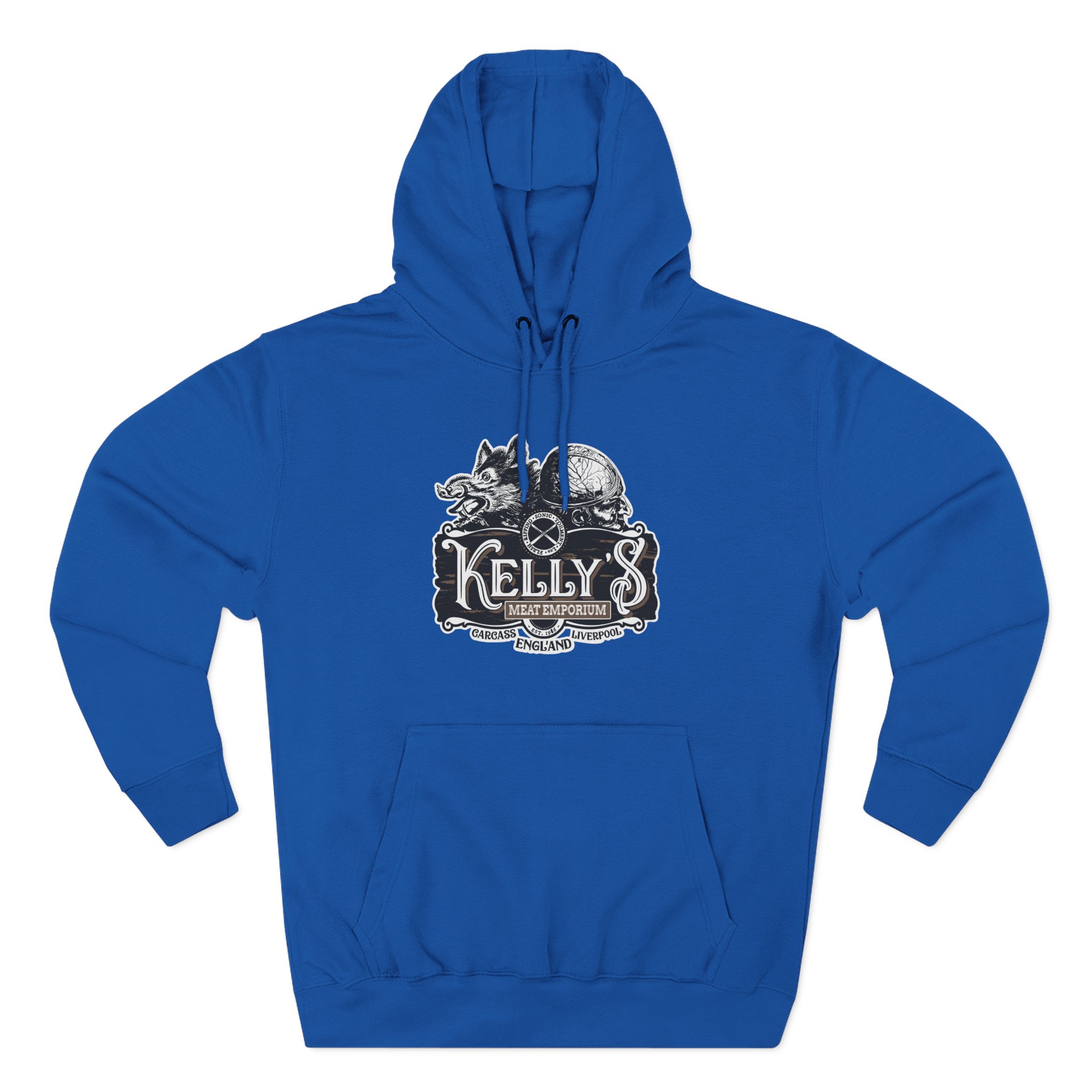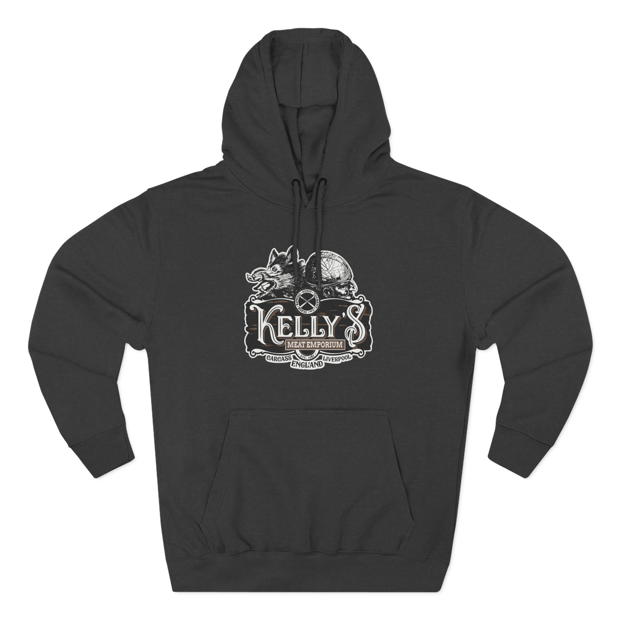 This Carcass Kelly's Meat Emporium charcoal fleece hoodie settles into your rotation like an old friend — soft, weighty, and quietly bold. The three-panel hood and adjustable drawcord frame your face on blustery mornings. A roomy kangaroo pocket keeps hands warm and holds what you need for a quick walk or a late-night errand. The front artwork sits low and distressed, giving the piece a lived-in, slightly rebellious vibe that works whether you’re heading to a gig, a practice, or a coffee run. Built with sturdy double-needle seams and a soft 3-end fleece interior, it wears well over years of wear and washes while keeping its shape.