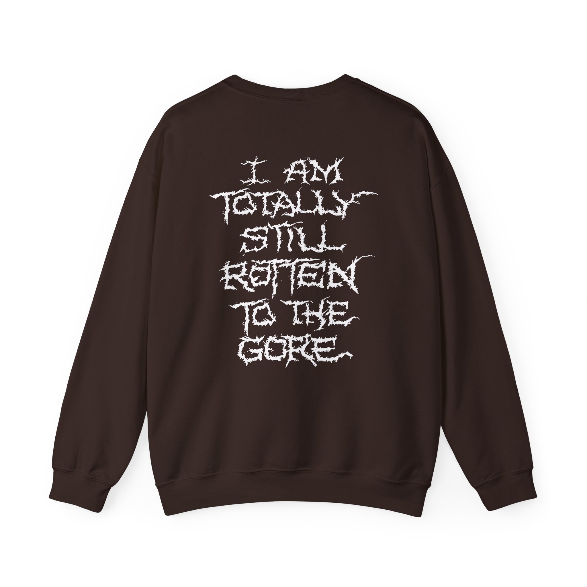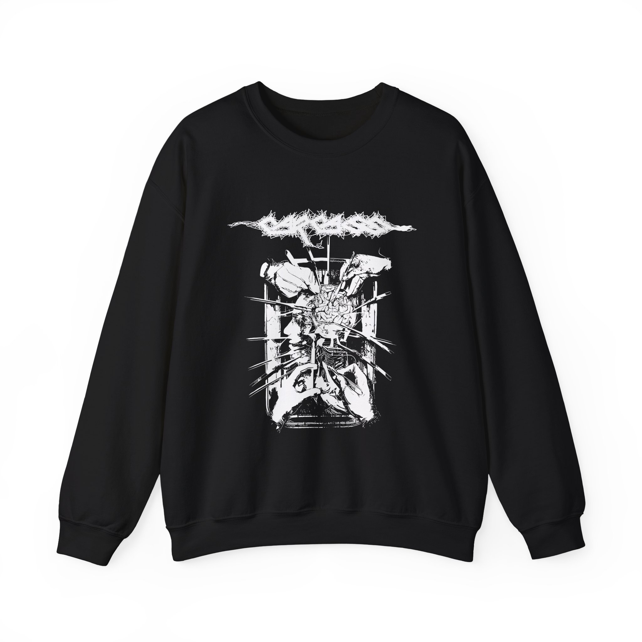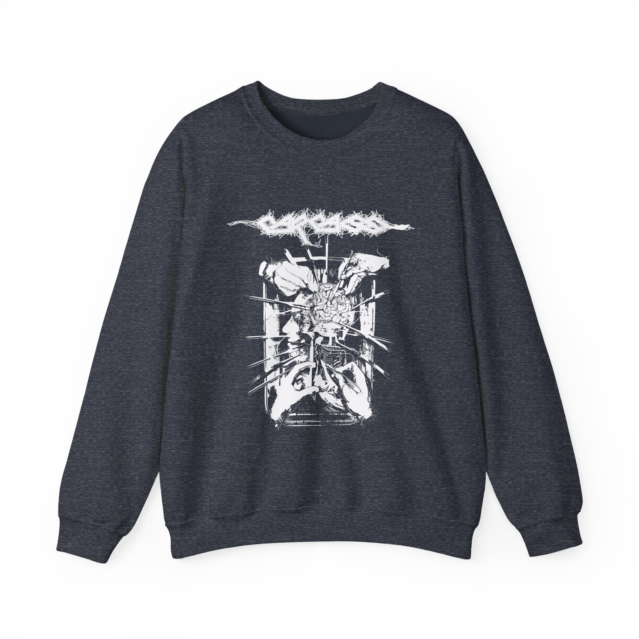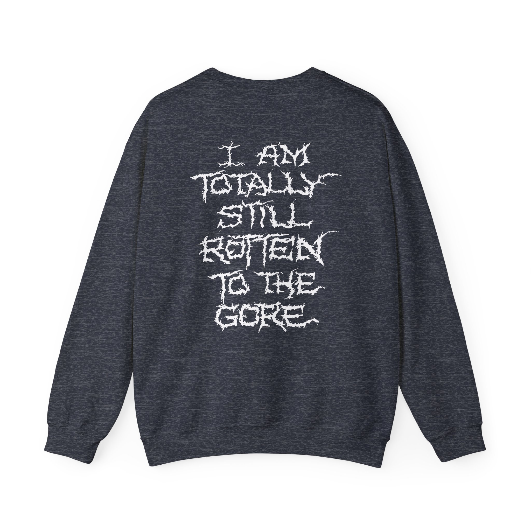The Gildan 18000 sweatshirt is a Carcass Rotten to the Gore unisex heavy blend crewneck made from a 50/50 cotton-polyester fabric, combining softness with lasting durability. Its smooth surface supports crisp, vibrant prints and embroidery, while the ribbed-knit collar and reinforced cuffs help it keep its shape over time. A seamless body design reduces irritation and adds to overall comfort. Practical, sturdy, and print-friendly, the Gildan 18000 sweatshirt remains a top choice for custom apparel.