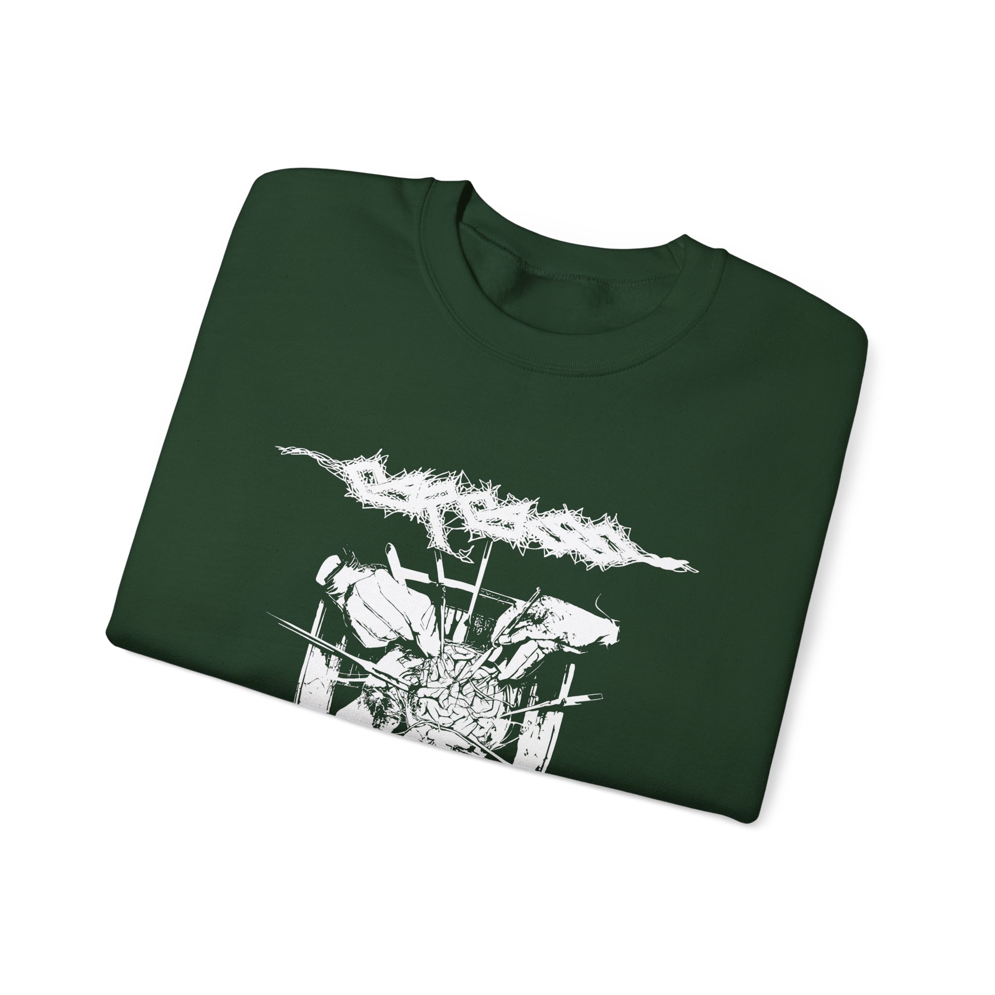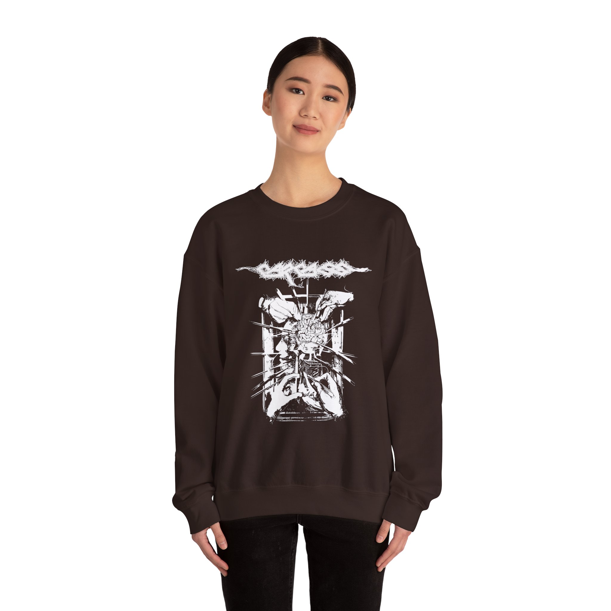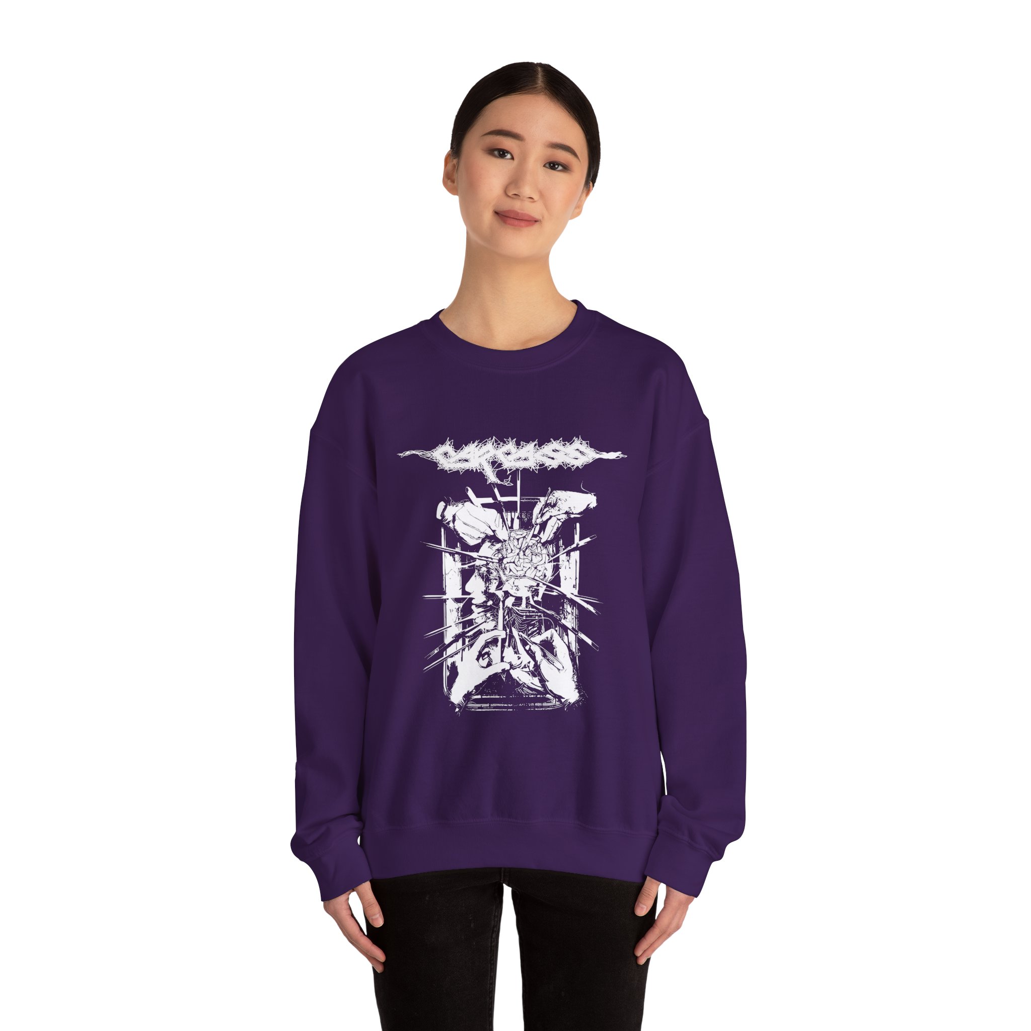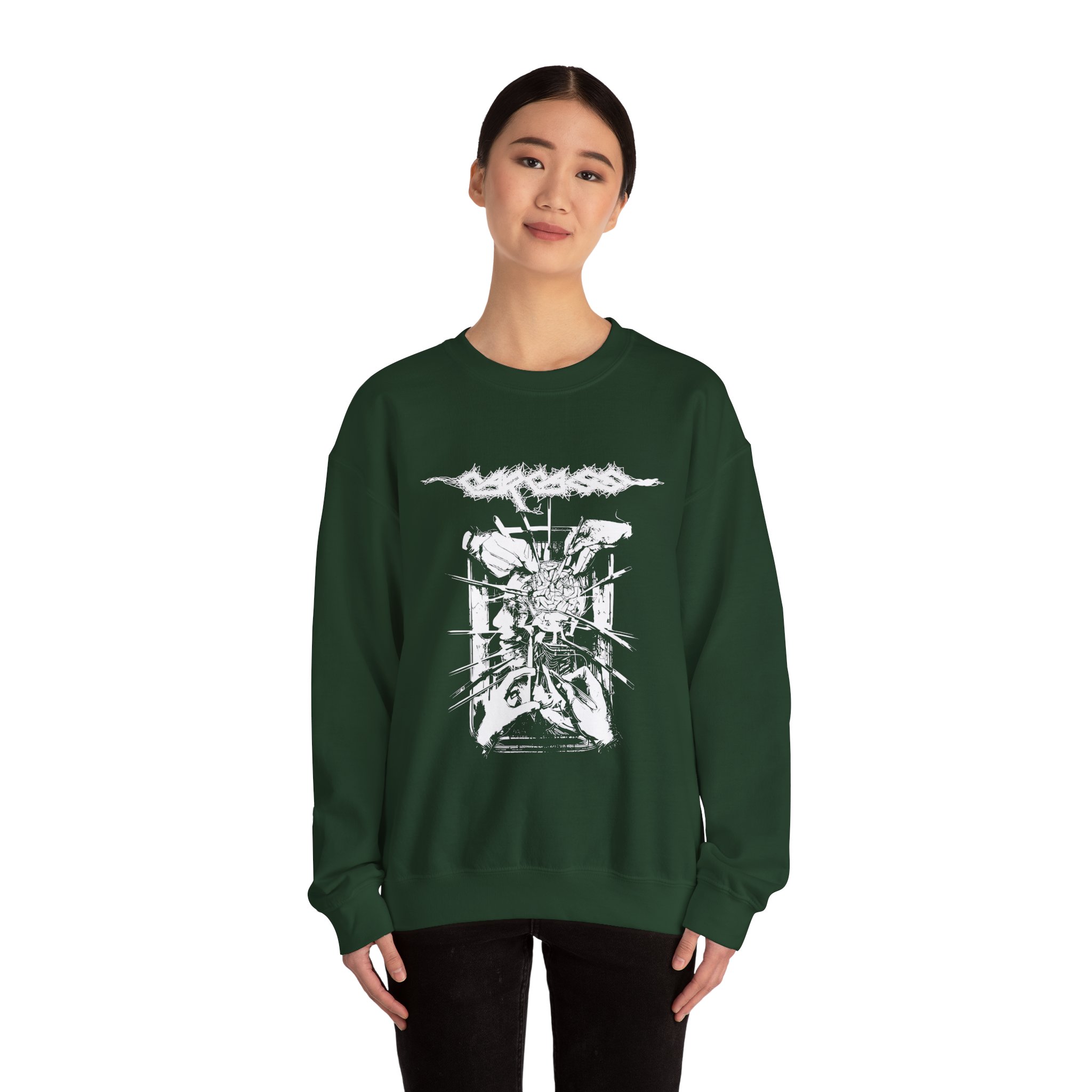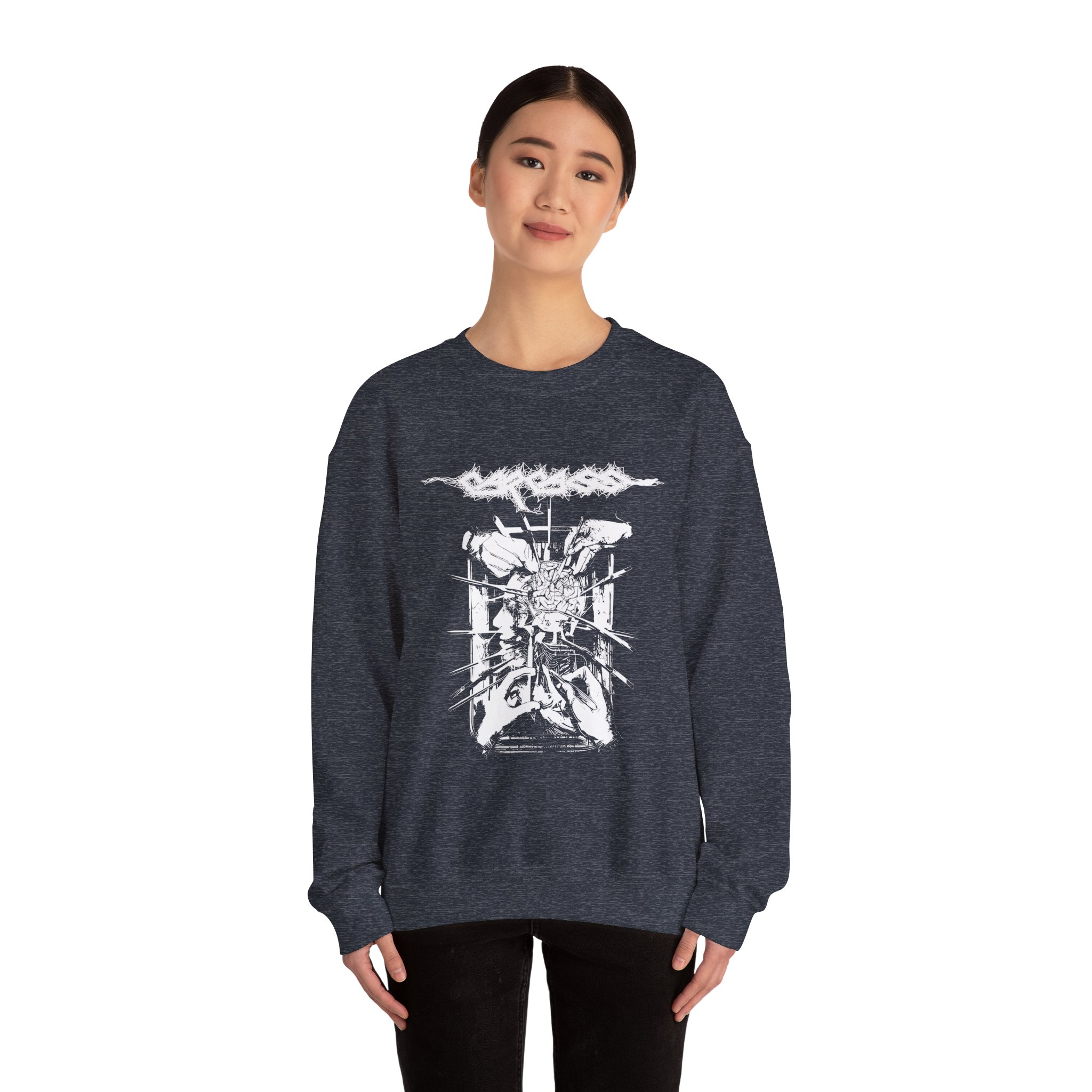 The Gildan 18000 sweatshirt is a Carcass Rotten to the Gore unisex heavy blend crewneck made from a 50/50 cotton-polyester fabric, combining softness with lasting durability. Its smooth surface supports crisp, vibrant prints and embroidery, while the ribbed-knit collar and reinforced cuffs help it keep its shape over time. A seamless body design reduces irritation and adds to overall comfort. Practical, sturdy, and print-friendly, the Gildan 18000 sweatshirt remains a top choice for custom apparel.