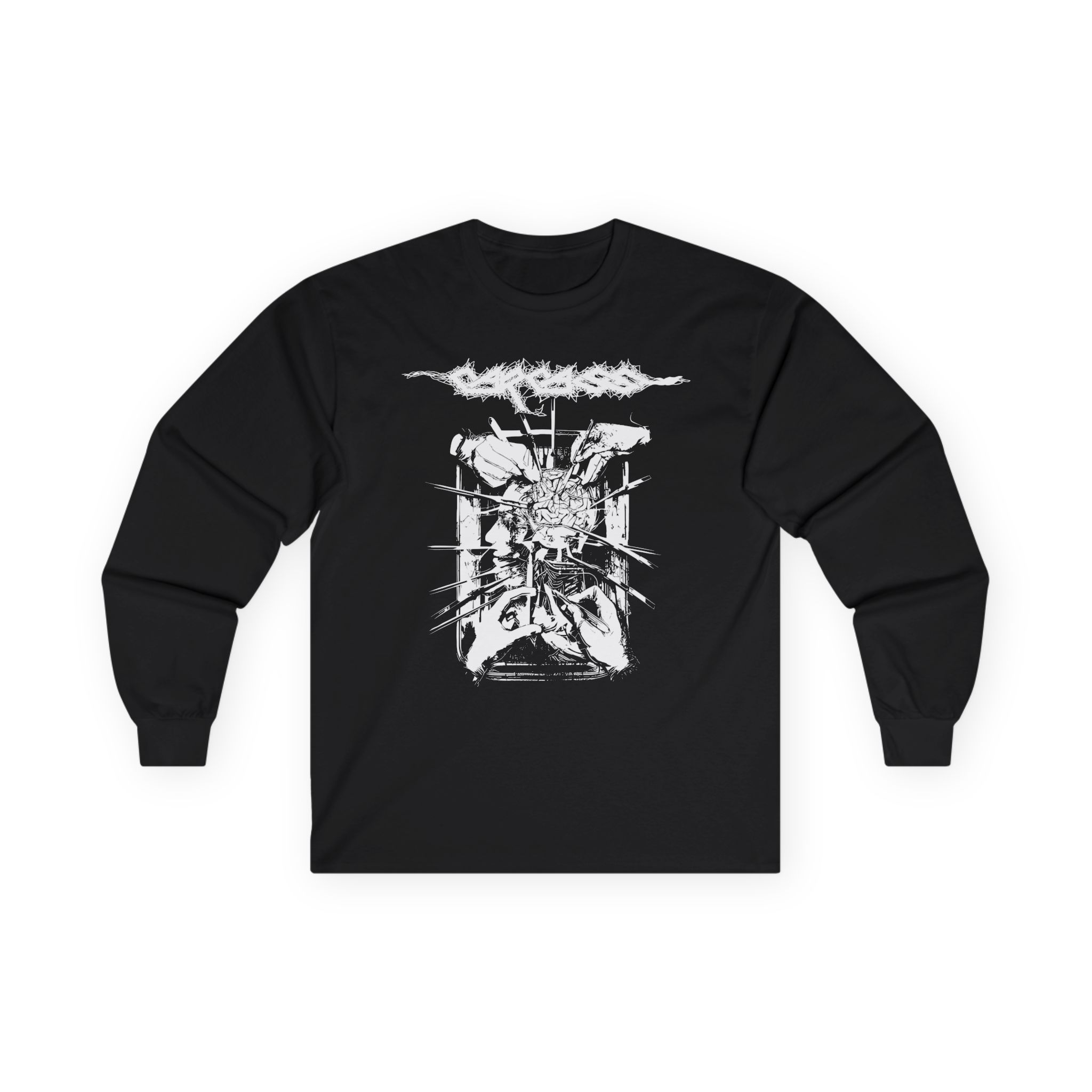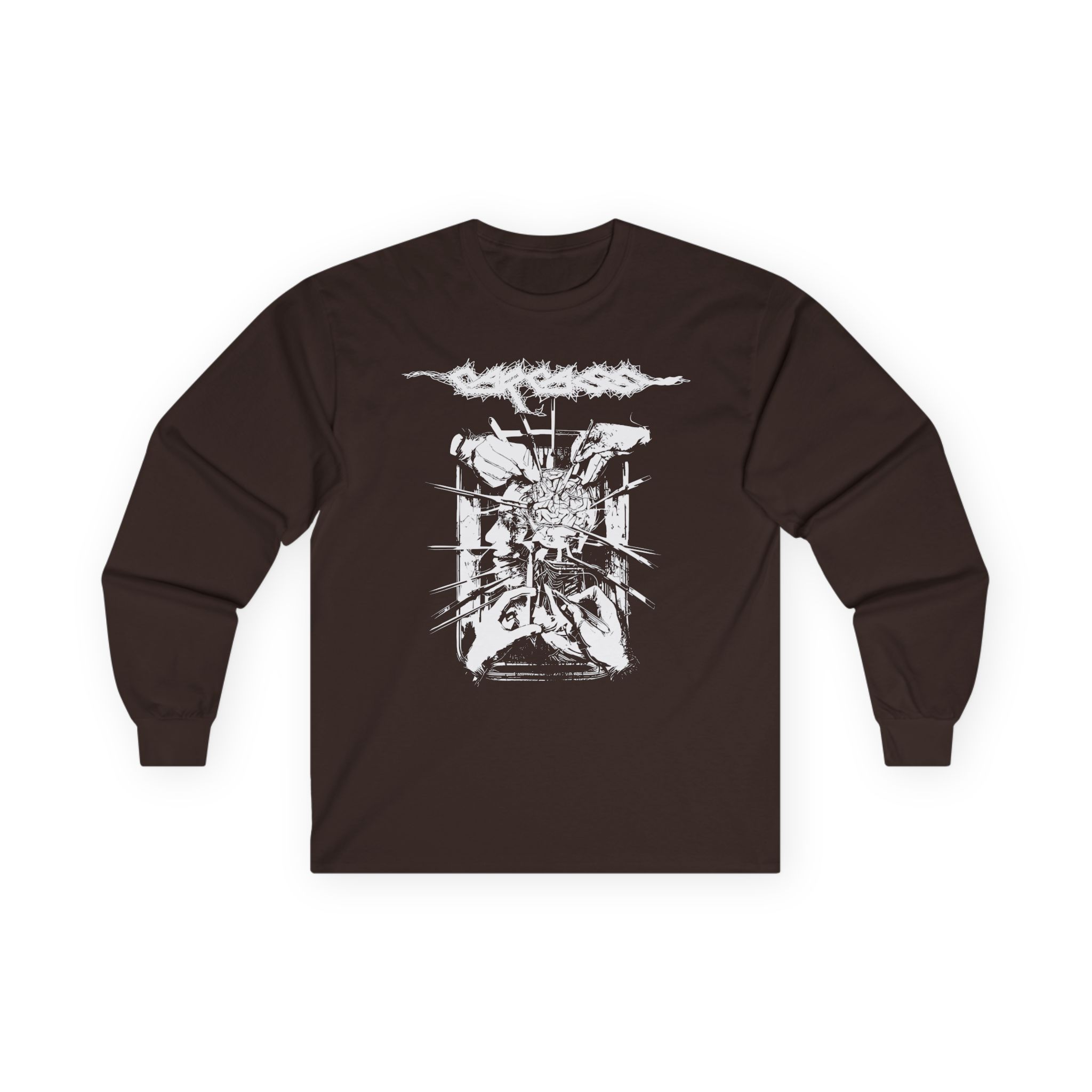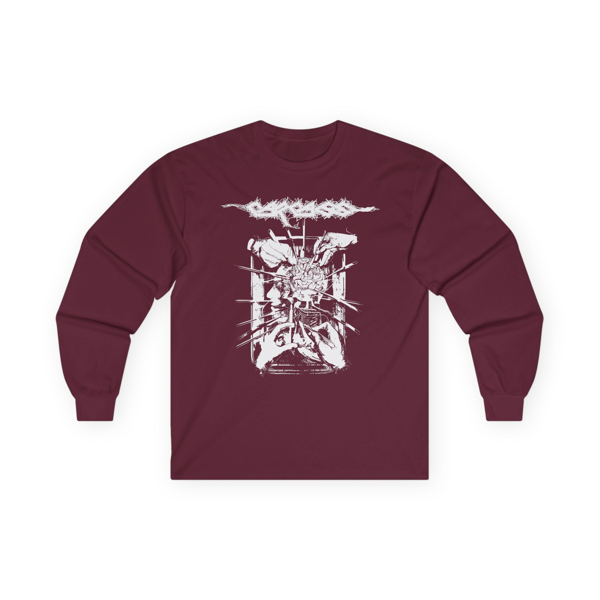 This Carcass Rotten to the Gore long-sleeve tee brings vintage concert vibes to everyday wear. Soft yet substantial cotton and a classic, slightly boxy fit create a lived-in feel that layers well under jackets or stands alone. The front art—bold mirrored sunglasses, a painted blue nose and red lips—feels like a snapshot from an ’80s tour poster. Wear it to record-store hangs, low-key gigs, or when you want a guarded nod to music history without shouting. It’s the kind of shirt that feels like it already remembers a hundred nights out.
