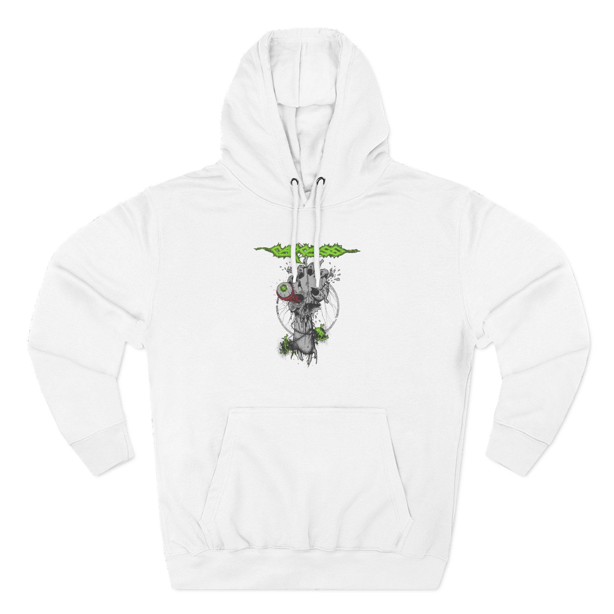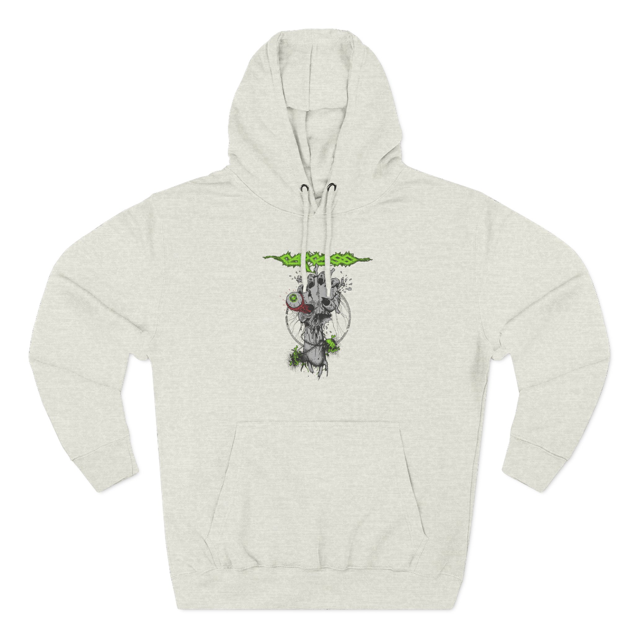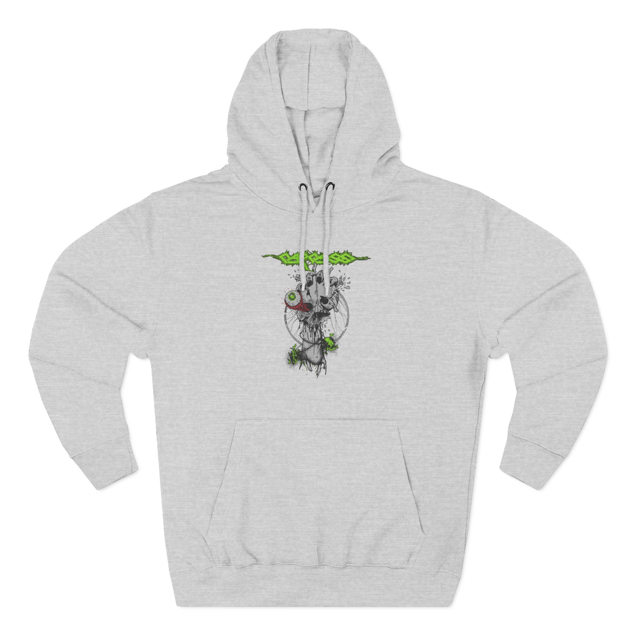This Carcass charcoal fleece hoodie settles into your rotation like an old friend — soft, weighty, and quietly bold. The three-panel hood and adjustable drawcord frame your face on blustery mornings. A roomy kangaroo pocket keeps hands warm and holds what you need for a quick walk or a late-night errand. The front artwork sits low and distressed, giving the piece a lived-in, slightly rebellious vibe that works whether you’re heading to a gig, a practice, or a coffee run. Built with sturdy double-needle seams and a soft 3-end fleece interior, it wears well over years of wear and washes while keeping its shape.