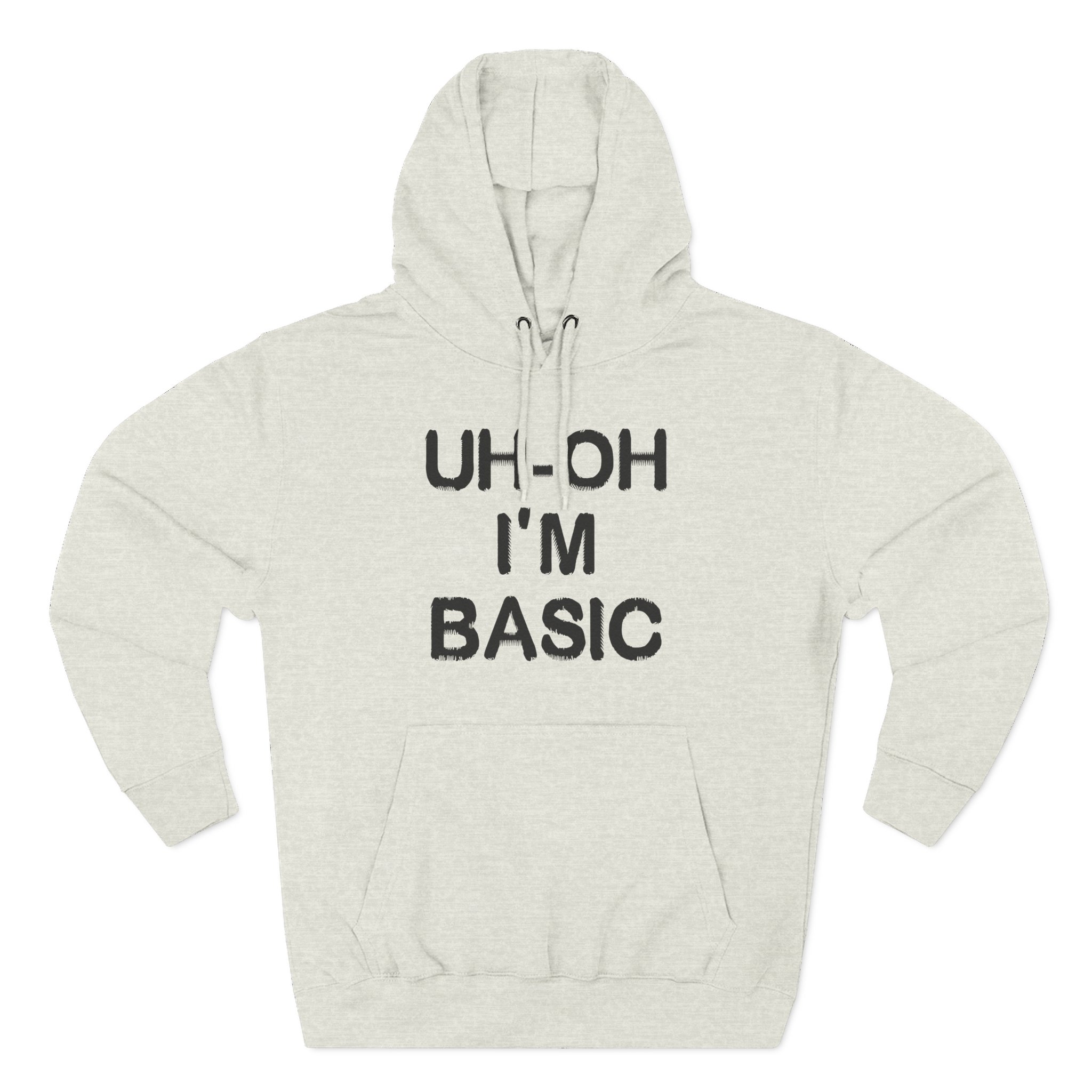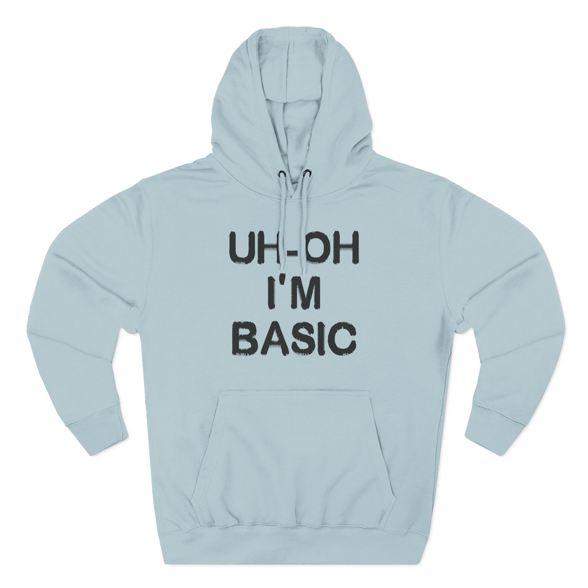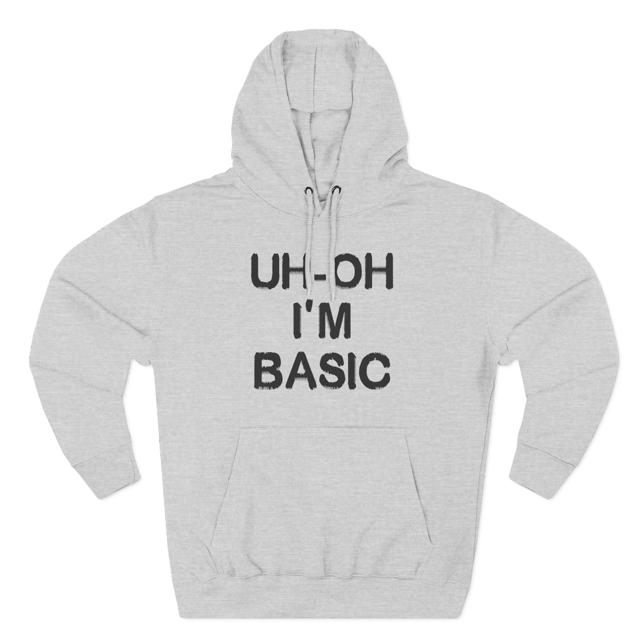 This Djo Uh-oh I'm Basic charcoal fleece hoodie settles into your rotation like an old friend — soft, weighty, and quietly bold. The three-panel hood and adjustable drawcord frame your face on blustery mornings. A roomy kangaroo pocket keeps hands warm and holds what you need for a quick walk or a late-night errand. The front artwork sits low and distressed, giving the piece a lived-in, slightly rebellious vibe that works whether you’re heading to a gig, a practice, or a coffee run. Built with sturdy double-needle seams and a soft 3-end fleece interior, it wears well over years of wear and washes while keeping its shape.