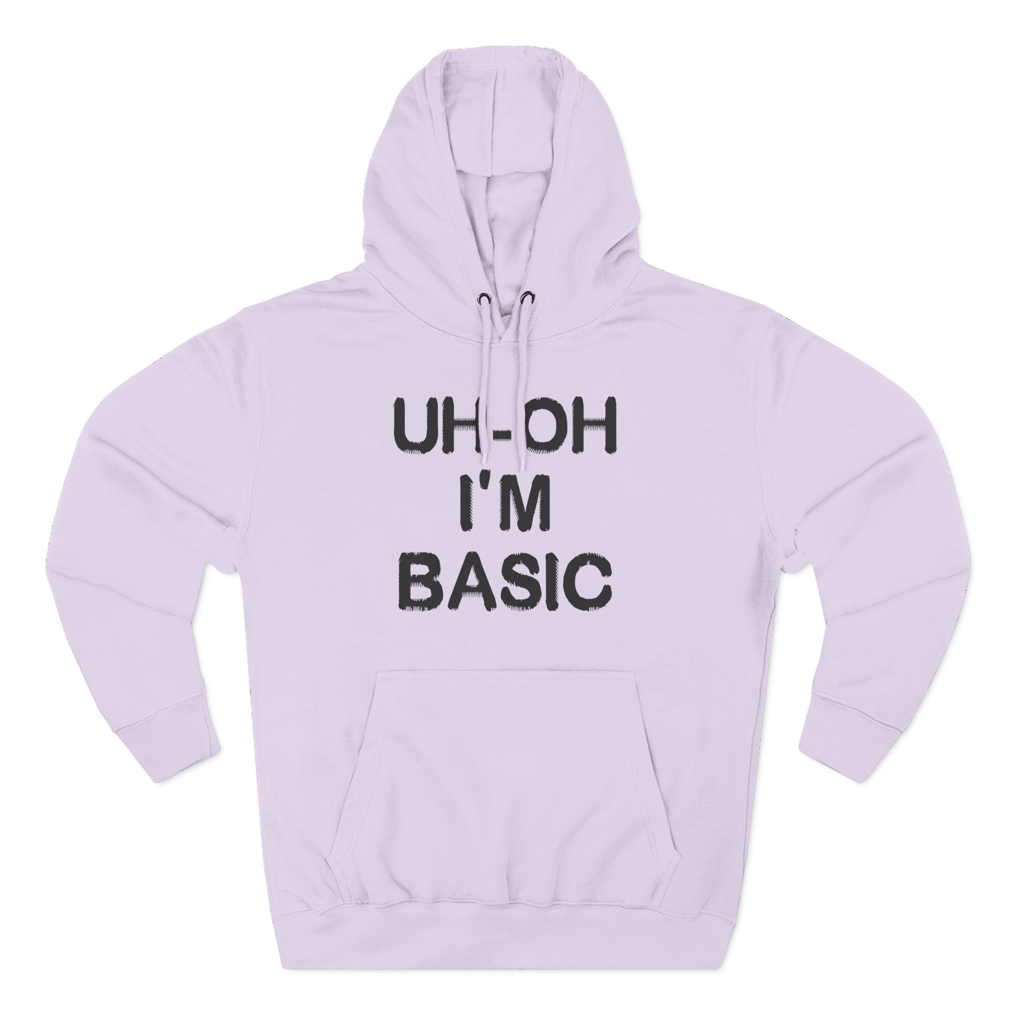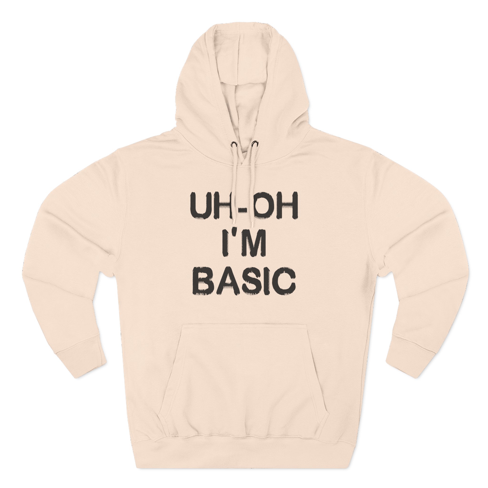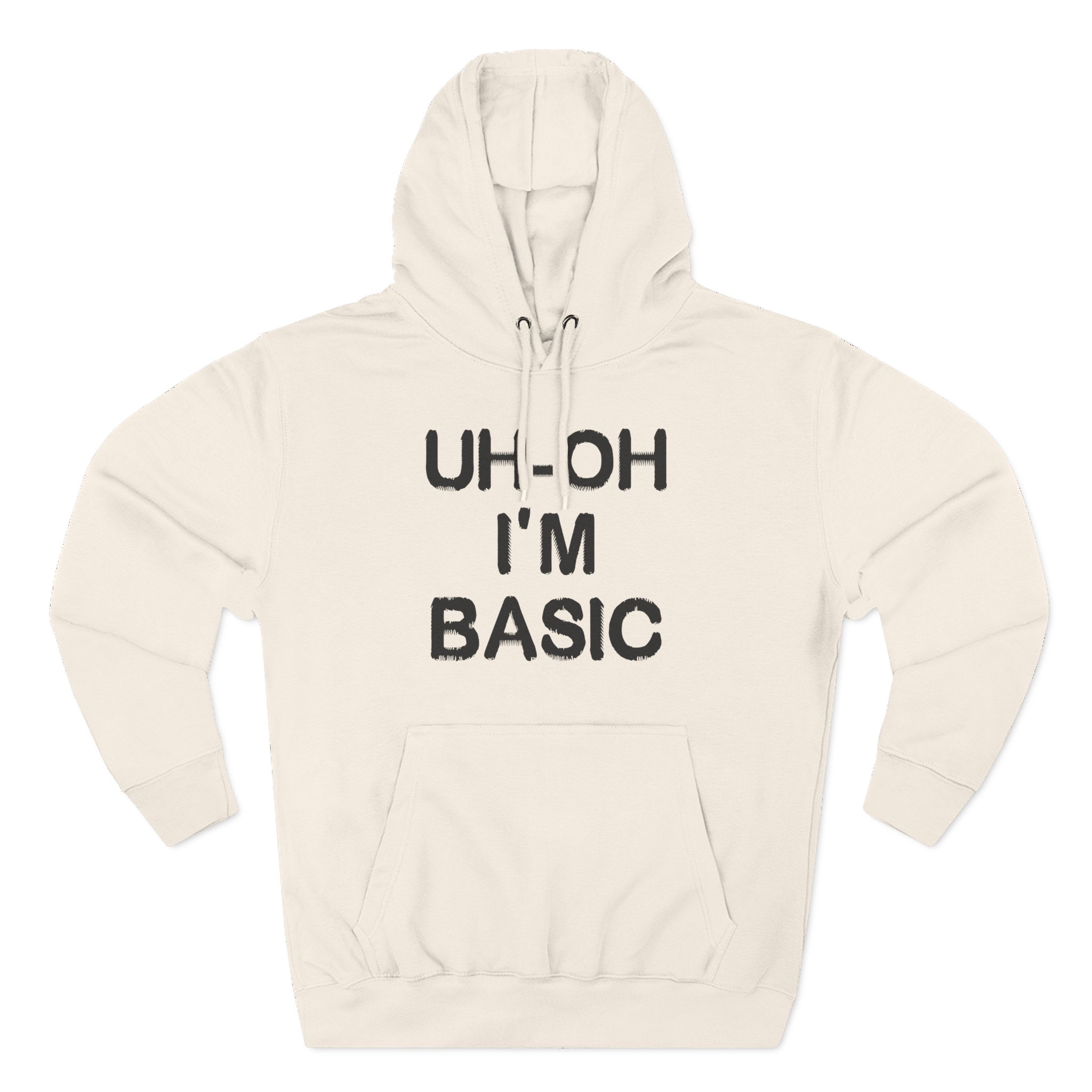 This Djo Uh-oh I'm Basic charcoal fleece hoodie settles into your rotation like an old friend — soft, weighty, and quietly bold. The three-panel hood and adjustable drawcord frame your face on blustery mornings. A roomy kangaroo pocket keeps hands warm and holds what you need for a quick walk or a late-night errand. The front artwork sits low and distressed, giving the piece a lived-in, slightly rebellious vibe that works whether you’re heading to a gig, a practice, or a coffee run. Built with sturdy double-needle seams and a soft 3-end fleece interior, it wears well over years of wear and washes while keeping its shape.