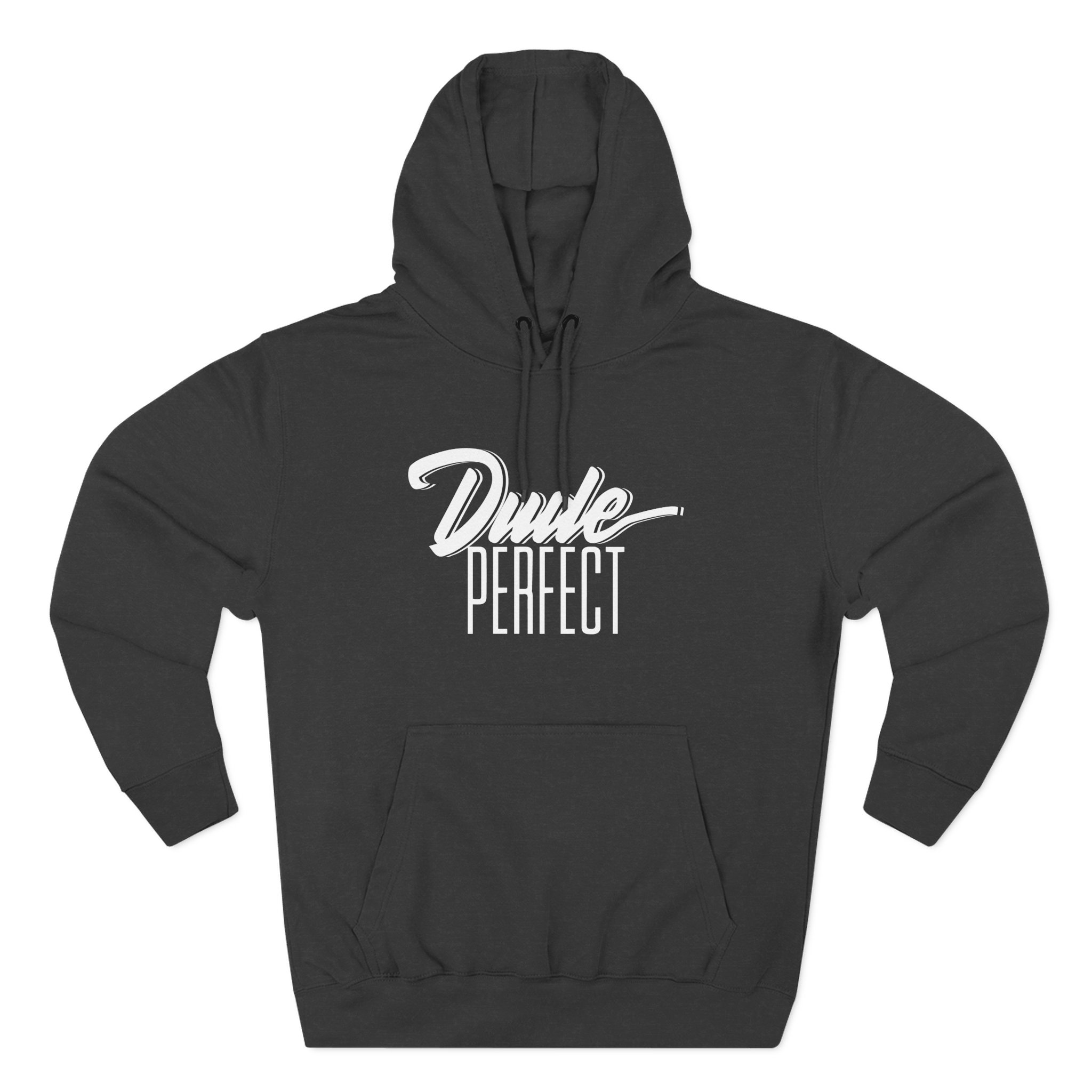 This Dude Perfect Dude Script charcoal fleece hoodie settles into your rotation like an old friend — soft, weighty, and quietly bold. The three-panel hood and adjustable drawcord frame your face on blustery mornings. A roomy kangaroo pocket keeps hands warm and holds what you need for a quick walk or a late-night errand. The front artwork sits low and distressed, giving the piece a lived-in, slightly rebellious vibe that works whether you’re heading to a gig, a practice, or a coffee run. Built with sturdy double-needle seams and a soft 3-end fleece interior, it wears well over years of wear and washes while keeping its shape.