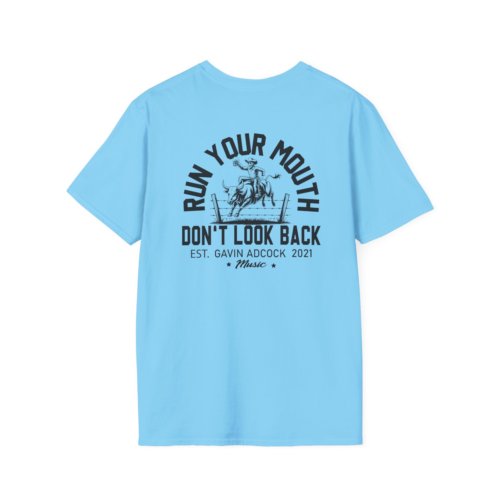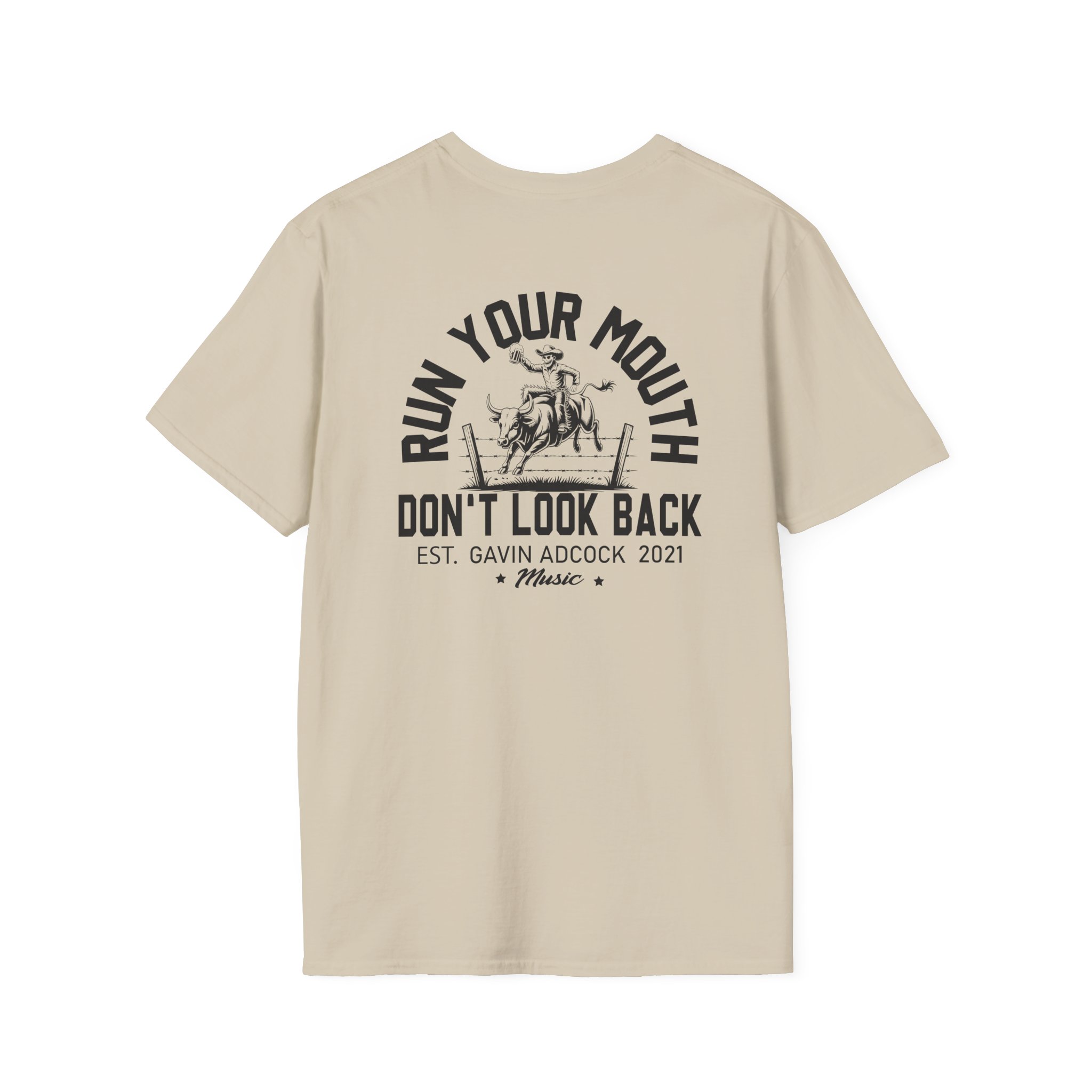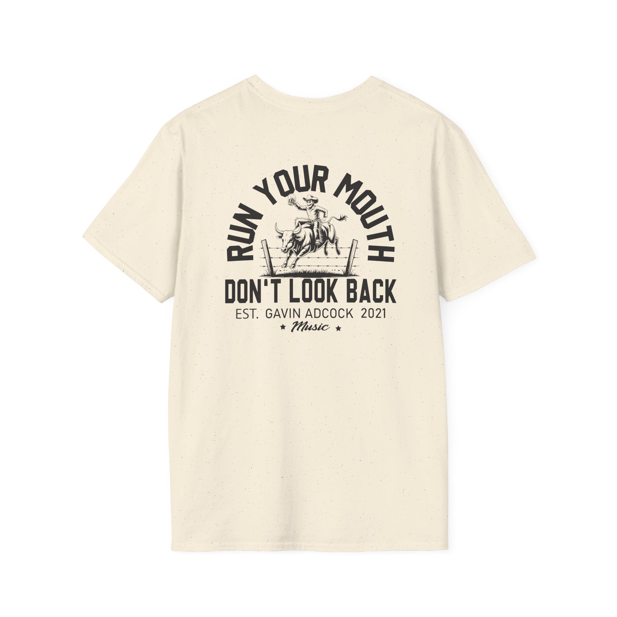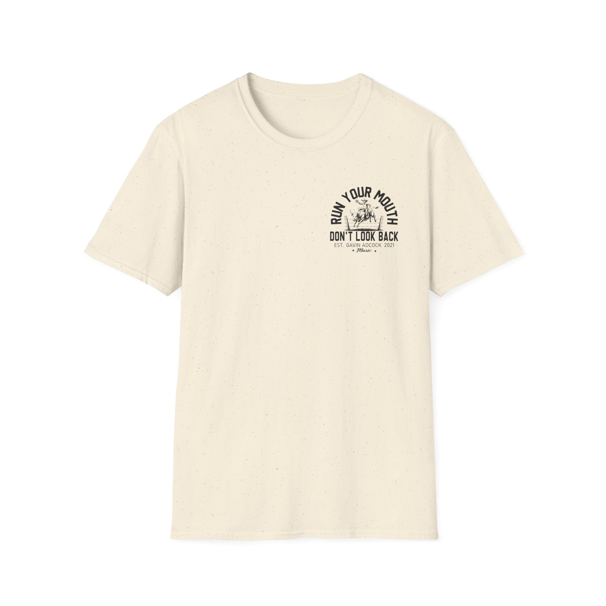 This lightweight, classic-fit tee carries a vintage tour-shirt look with hand-lettered script reading “Gavin Adcock Run Your Mouth” Soft ring-spun cotton and smooth printing make the graphic sit cleanly on the chest. Wear it to backyard shows, late-night drives, or when you want to bring a bit of road-worn Americana to a simple outfit. The crew neckline and tubular knit keep the silhouette neat, while shoulder tape and a ribbed collar hold the shape after many washes. It’s breathable, low-profile, and made to age with you—subtle black flecks appear on the Natural color for a lived-in feel.