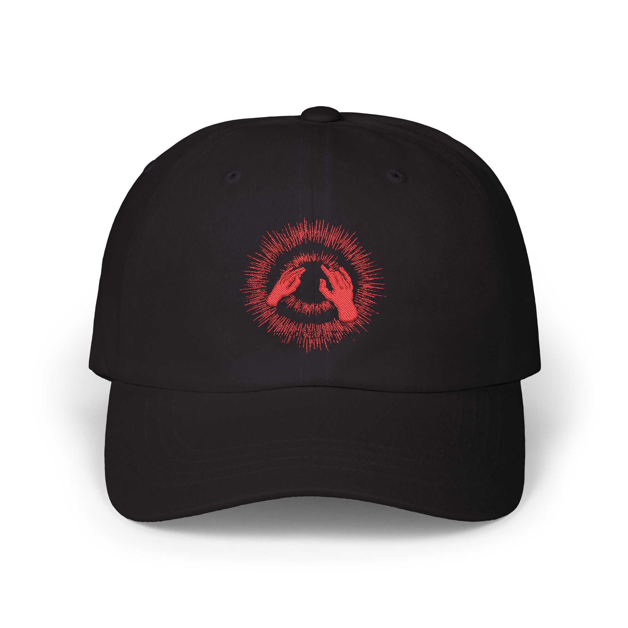 A worn-in navy Godspeed You Black Emperor cap with a quietly rebellious edge. The soft 6-panel body sits low and relaxed, letting the distressed white graphic — a small circular emblem with hand-lettered text — take center stage without shouting. It feels like the hat you reach for when you want to blend into the crowd but keep a little personal story visible: long walks by the water, late-night gigs, or running errands with a soundtrack in your ear. The adjustable antique-brass closure lets you fine-tune the fit so it moves with you, and the pre-curved visor keeps sun out of your eyes while maintaining that lived-in silhouette. Lightweight cotton and thoughtful details like the sewn-in label and branded visor sticker make it practical, while the subtly weathered print gives it personality.