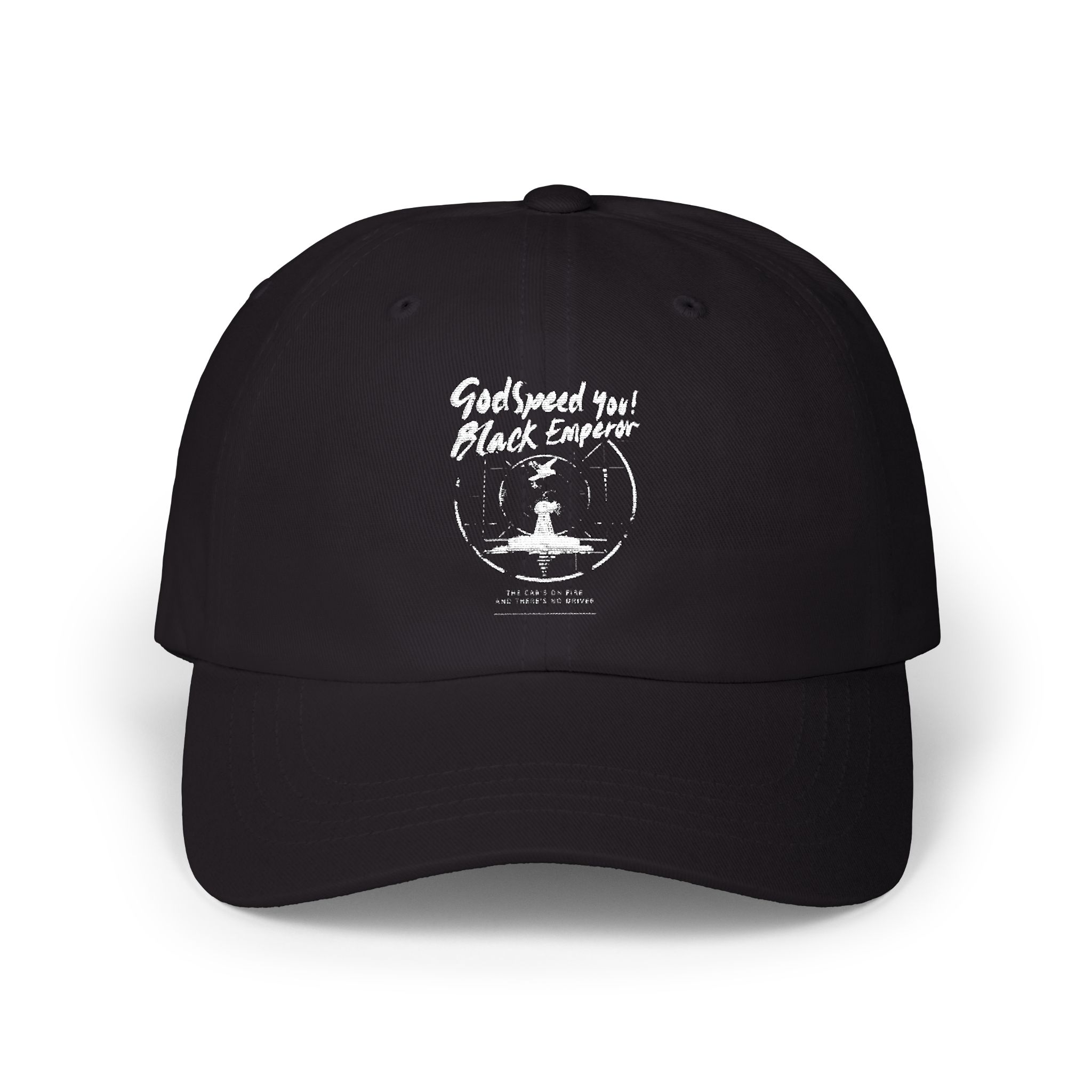 A worn-in navy Godspeed You Black Emperor cap with a quietly rebellious edge. The soft 6-panel body sits low and relaxed, letting the distressed white graphic — a small circular emblem with hand-lettered text — take center stage without shouting. It feels like the hat you reach for when you want to blend into the crowd but keep a little personal story visible: long walks by the water, late-night gigs, or running errands with a soundtrack in your ear. The adjustable antique-brass closure lets you fine-tune the fit so it moves with you, and the pre-curved visor keeps sun out of your eyes while maintaining that lived-in silhouette. Lightweight cotton and thoughtful details like the sewn-in label and branded visor sticker make it practical, while the subtly weathered print gives it personality.