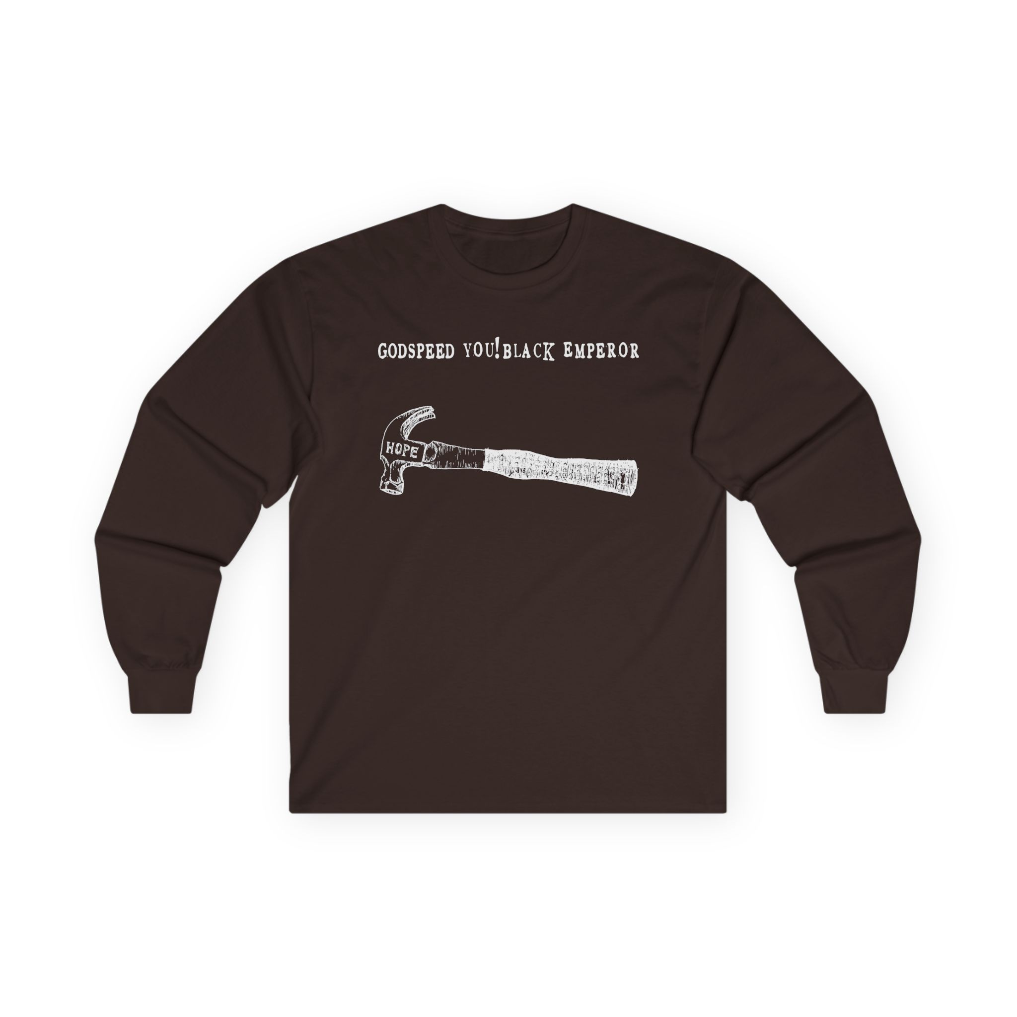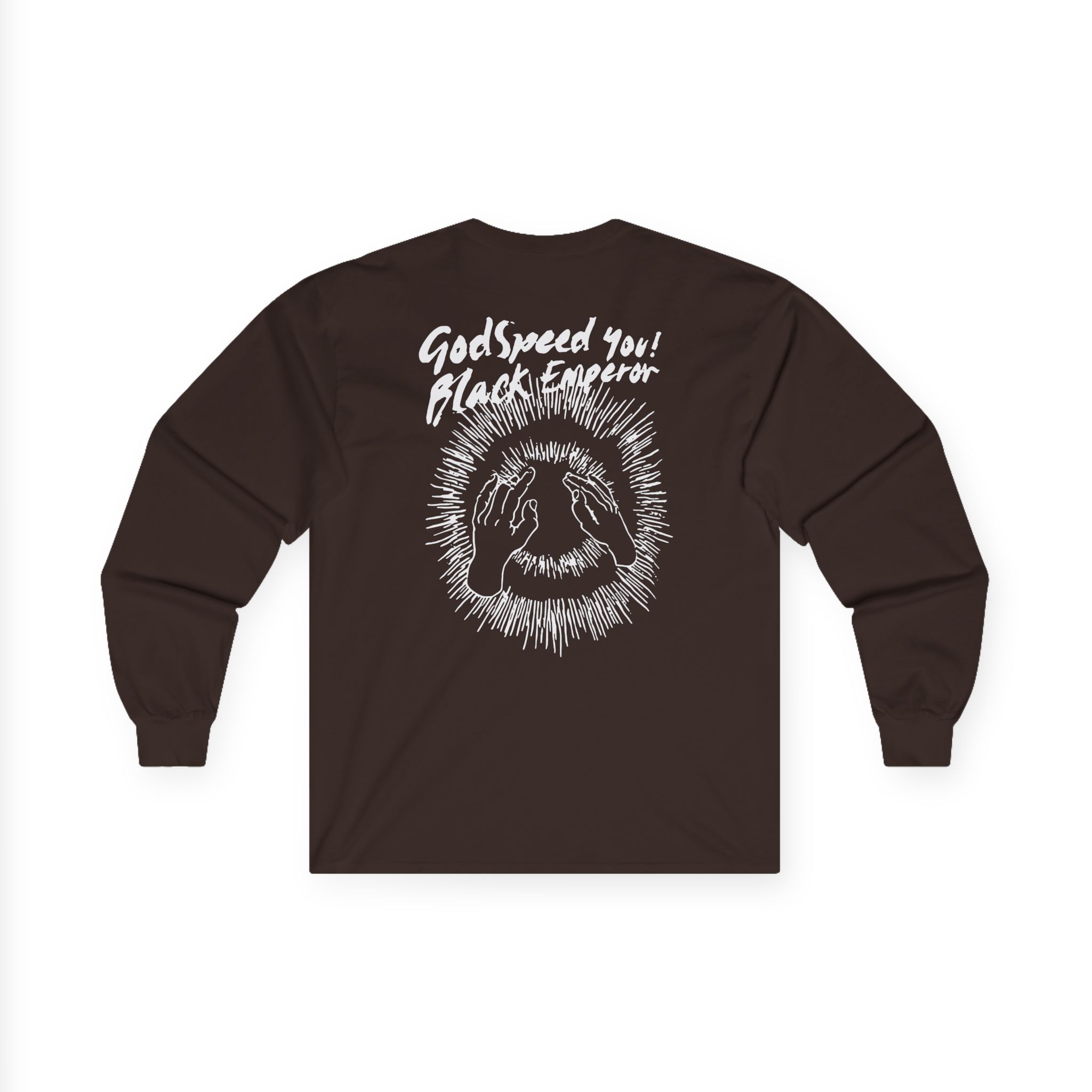 This Godspeed You Black Emperor long-sleeve tee brings vintage concert vibes to everyday wear. Soft yet substantial cotton and a classic, slightly boxy fit create a lived-in feel that layers well under jackets or stands alone. The front art—bold mirrored sunglasses, a painted blue nose and red lips—feels like a snapshot from an ’80s tour poster. Wear it to record-store hangs, low-key gigs, or when you want a guarded nod to music history without shouting. It’s the kind of shirt that feels like it already remembers a hundred nights out.