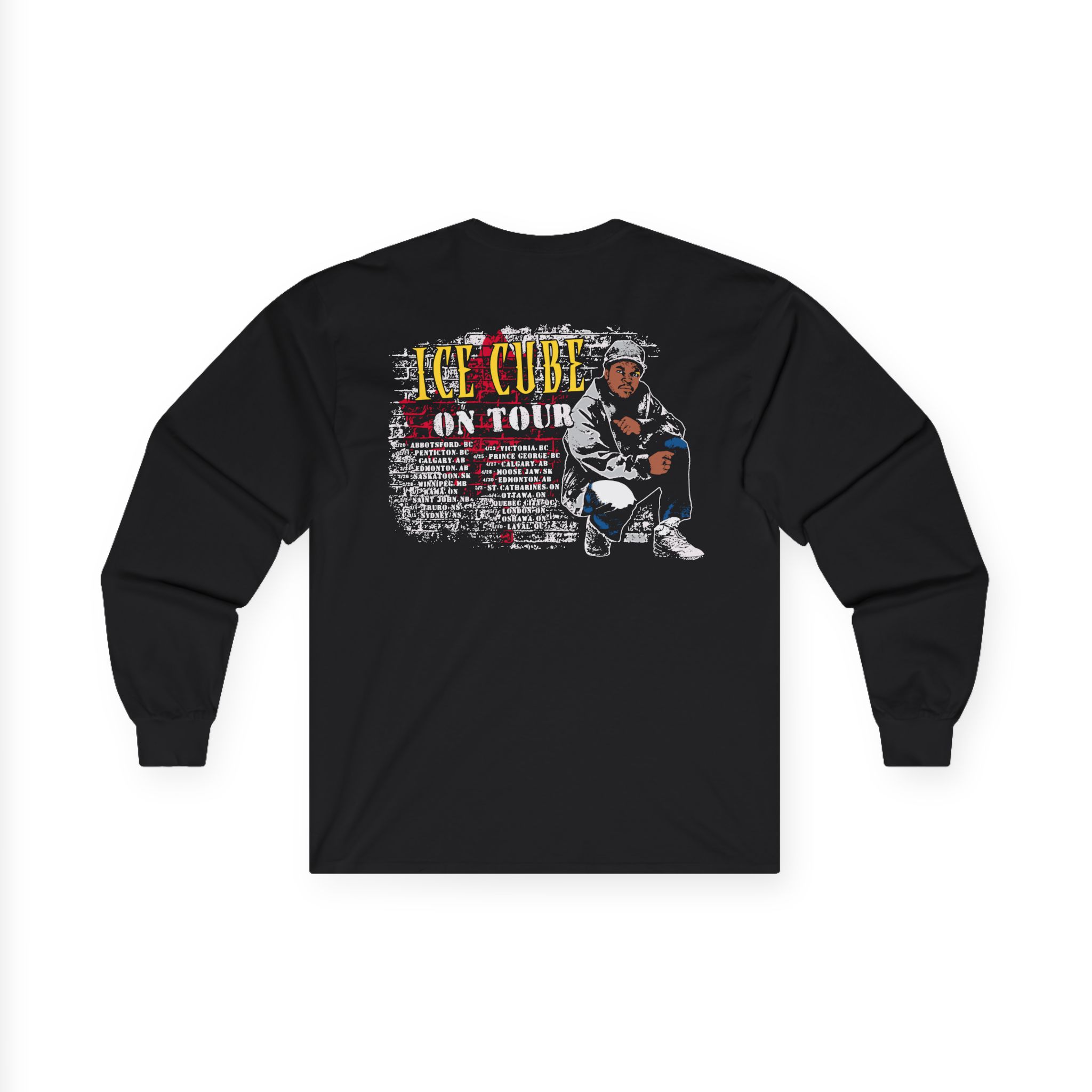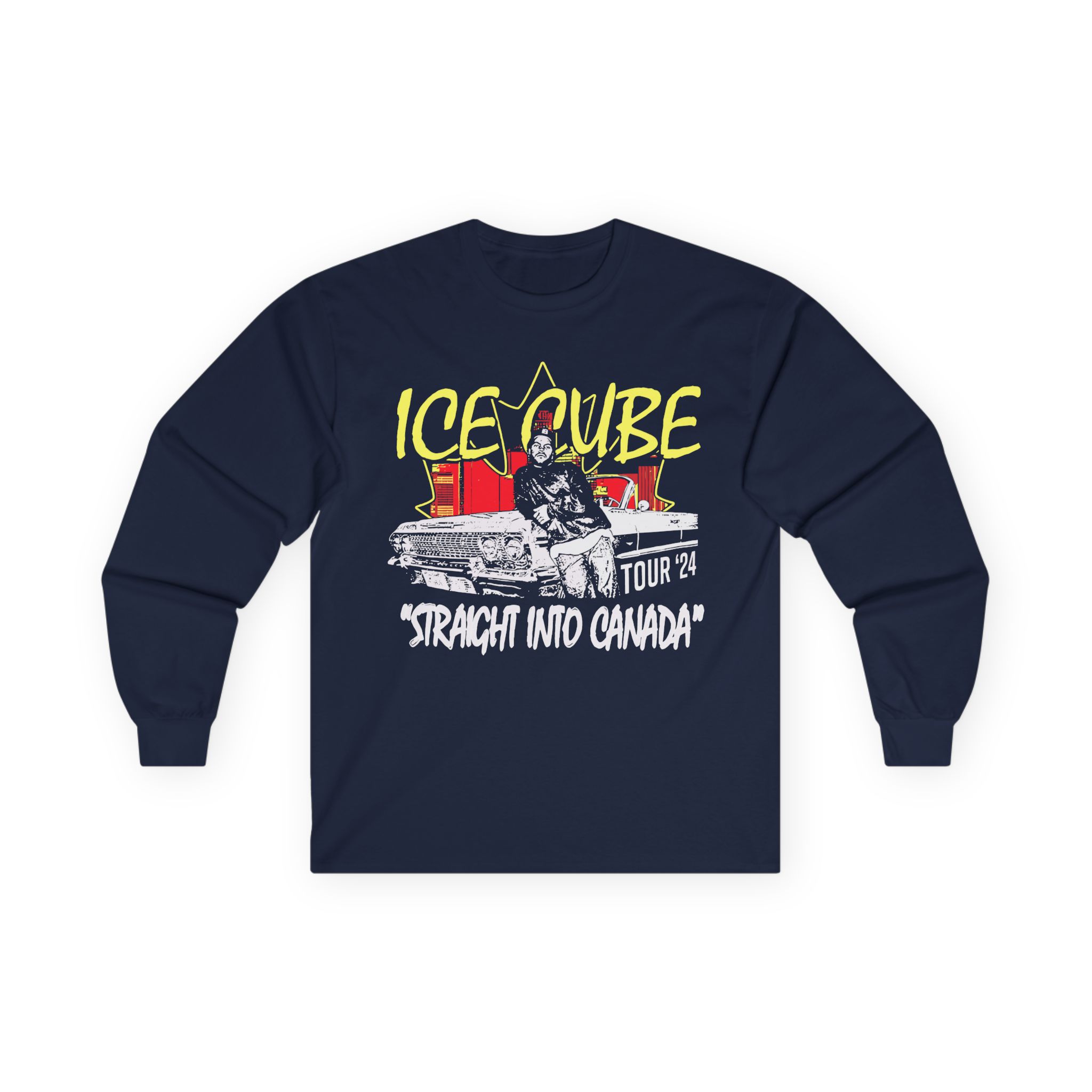This Ice Cube Impala Canada long-sleeve tee brings vintage concert vibes to everyday wear. Soft yet substantial cotton and a classic, slightly boxy fit create a lived-in feel that layers well under jackets or stands alone. The front art—bold mirrored sunglasses, a painted blue nose and red lips—feels like a snapshot from an ’80s tour poster. Wear it to record-store hangs, low-key gigs, or when you want a guarded nod to music history without shouting. It’s the kind of shirt that feels like it already remembers a hundred nights out.