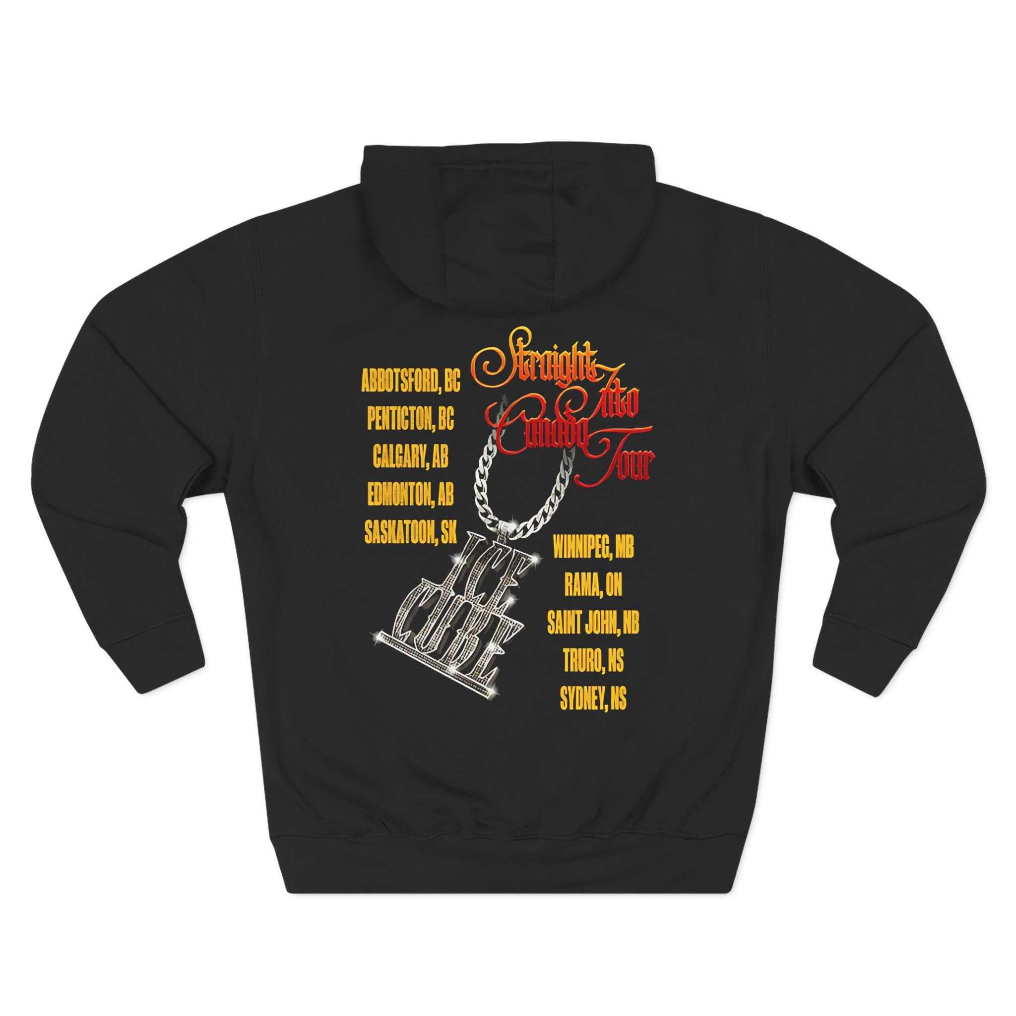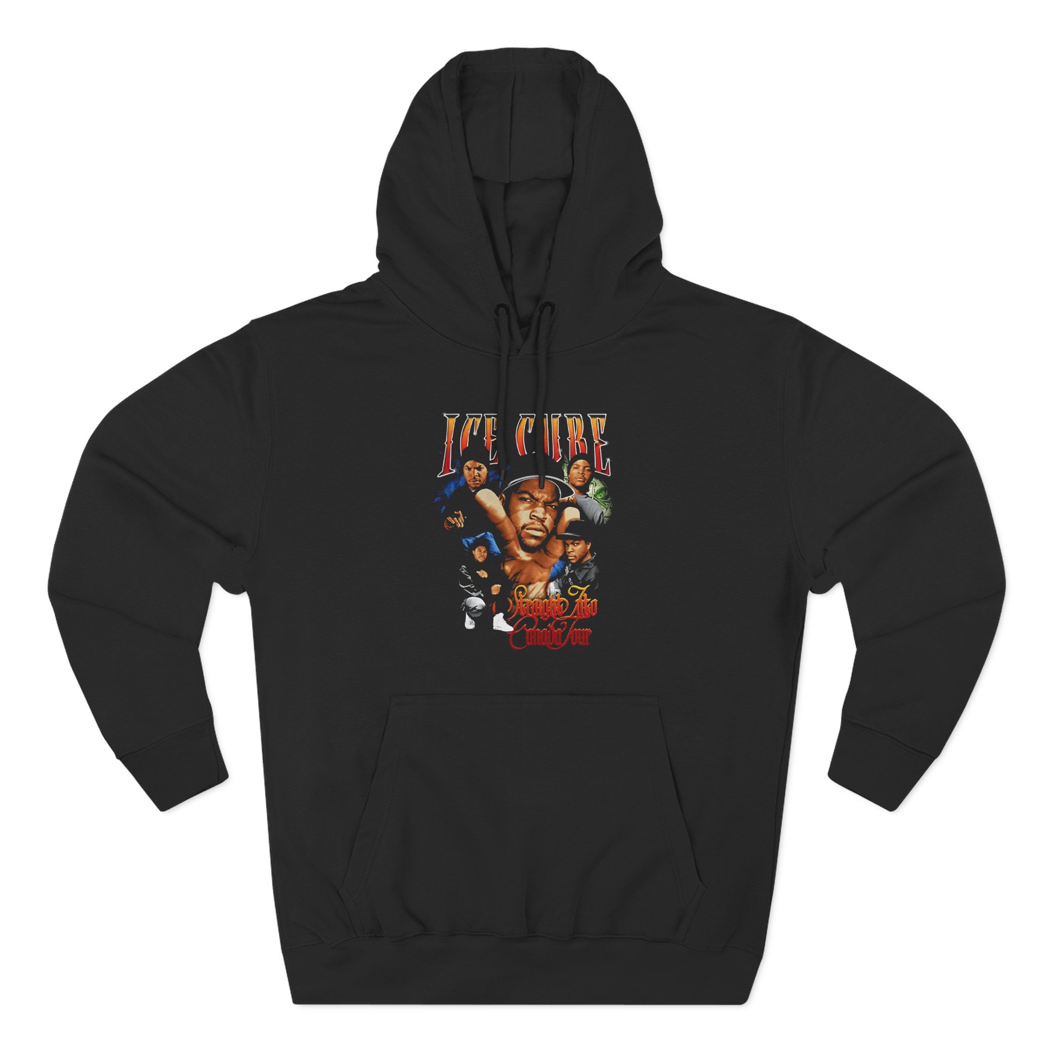 This Ice Cube Straight Into Canada charcoal fleece hoodie settles into your rotation like an old friend — soft, weighty, and quietly bold. The three-panel hood and adjustable drawcord frame your face on blustery mornings. A roomy kangaroo pocket keeps hands warm and holds what you need for a quick walk or a late-night errand. The front artwork sits low and distressed, giving the piece a lived-in, slightly rebellious vibe that works whether you’re heading to a gig, a practice, or a coffee run. Built with sturdy double-needle seams and a soft 3-end fleece interior, it wears well over years of wear and washes while keeping its shape.