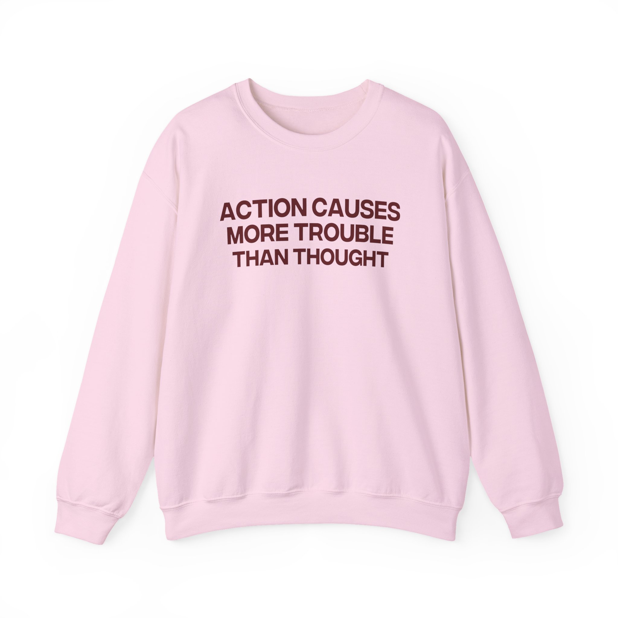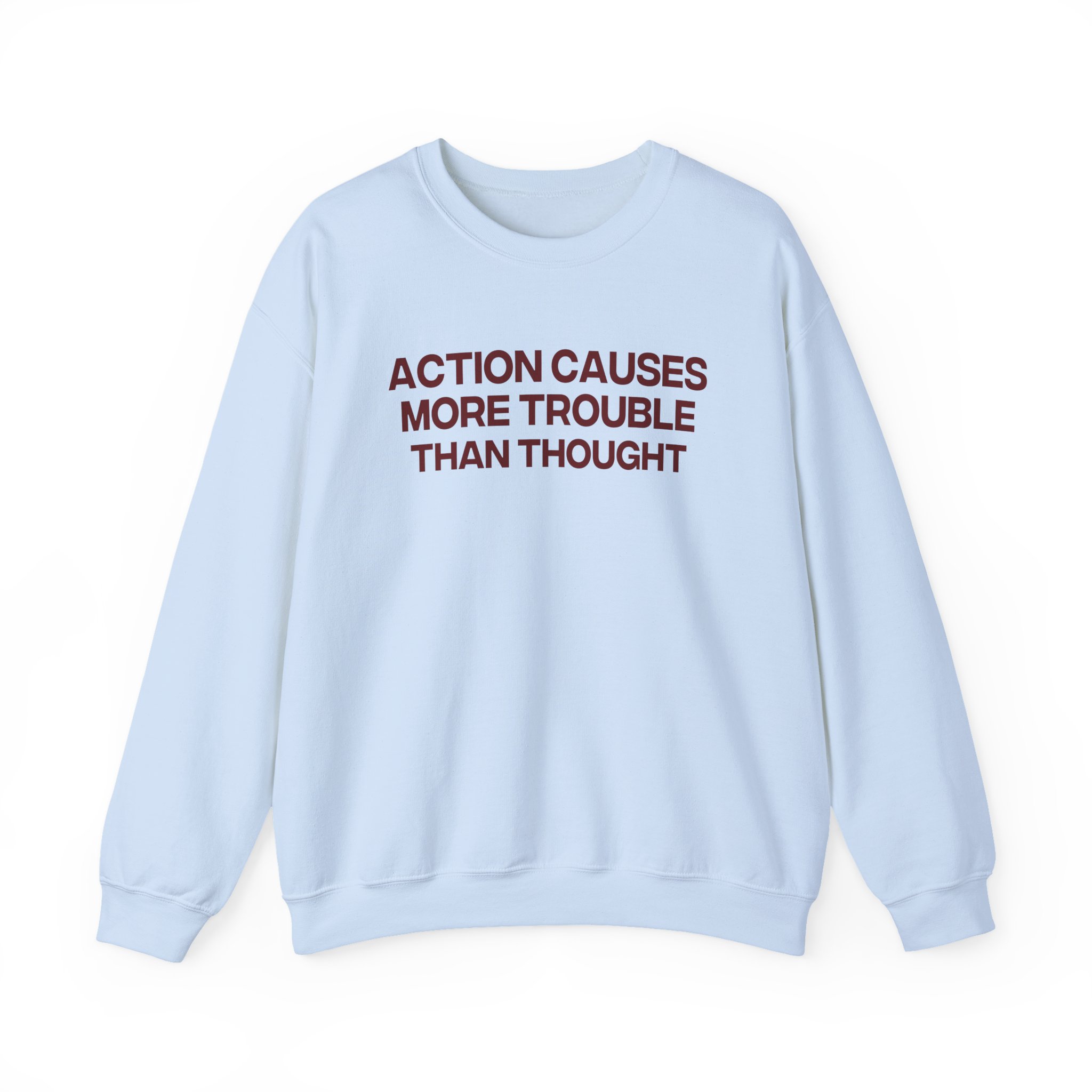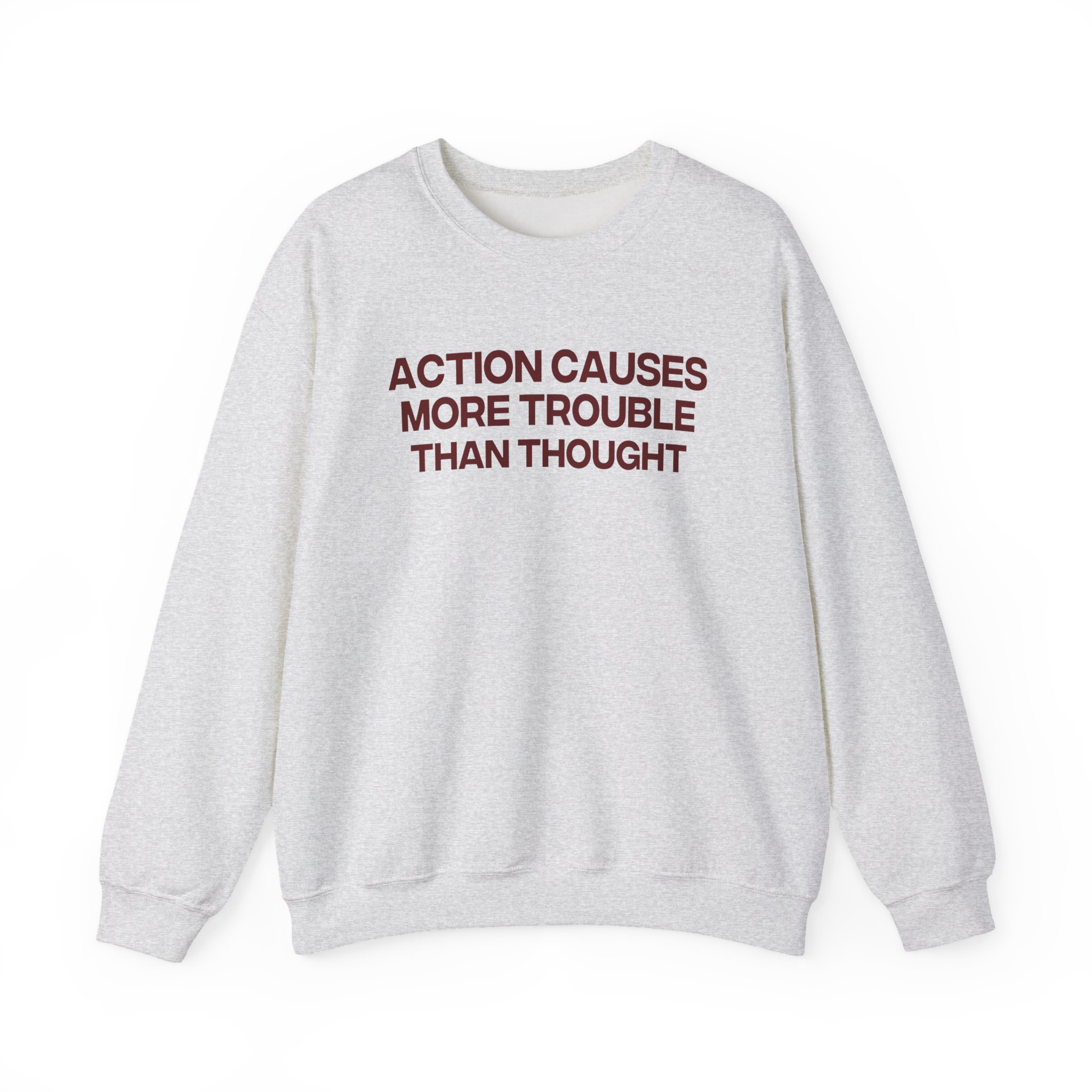 The Gildan 18000 sweatshirt is a Jenny Holzer Action Causes More Trouble Than Thought unisex heavy blend crewneck made from a 50/50 cotton-polyester fabric, combining softness with lasting durability. Its smooth surface supports crisp, vibrant prints and embroidery, while the ribbed-knit collar and reinforced cuffs help it keep its shape over time. A seamless body design reduces irritation and adds to overall comfort. Practical, sturdy, and print-friendly, the Gildan 18000 sweatshirt remains a top choice for custom apparel.