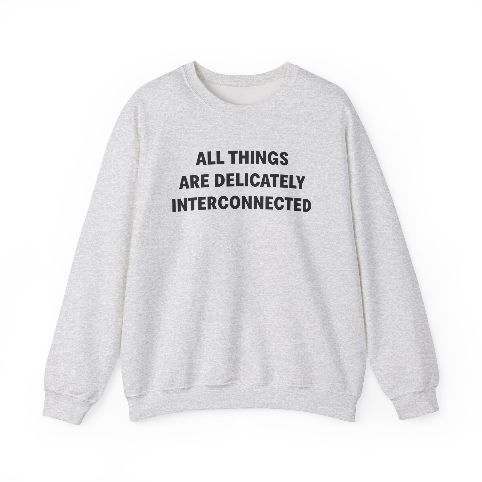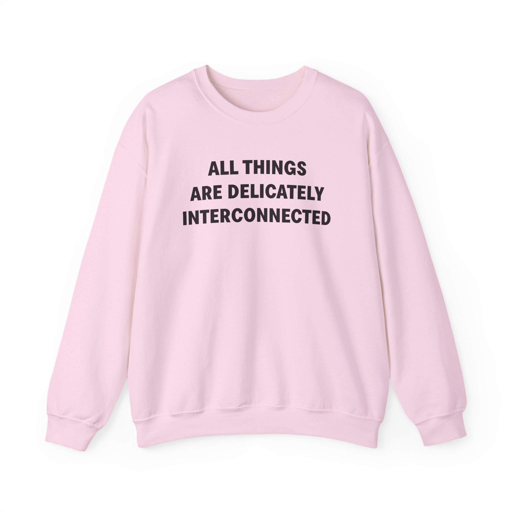 The Gildan 18000 sweatshirt is a Jenny Holzer All Things Are Delicately Interconnected unisex heavy blend crewneck made from a 50/50 cotton-polyester fabric, combining softness with lasting durability. Its smooth surface supports crisp, vibrant prints and embroidery, while the ribbed-knit collar and reinforced cuffs help it keep its shape over time. A seamless body design reduces irritation and adds to overall comfort. Practical, sturdy, and print-friendly, the Gildan 18000 sweatshirt remains a top choice for custom apparel.