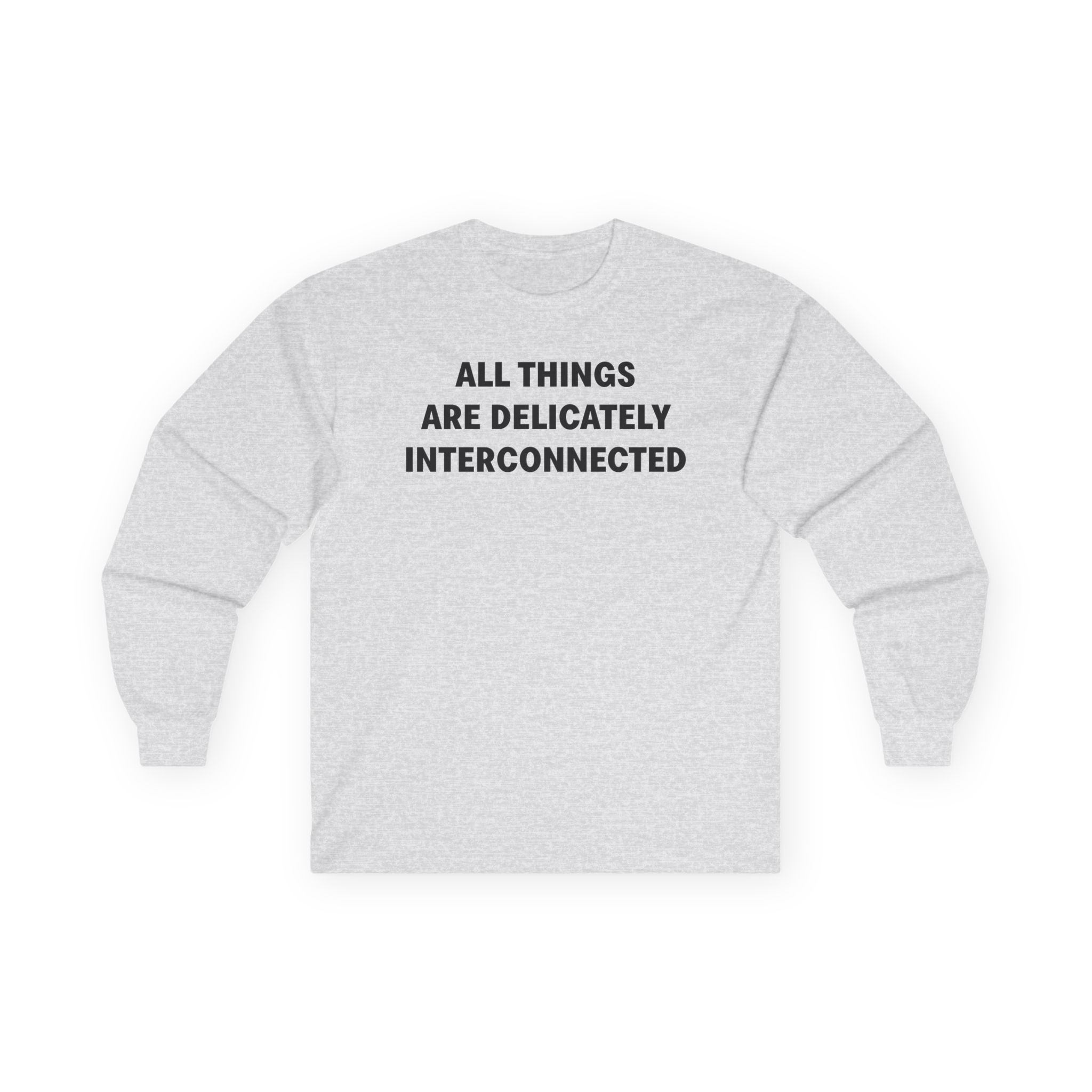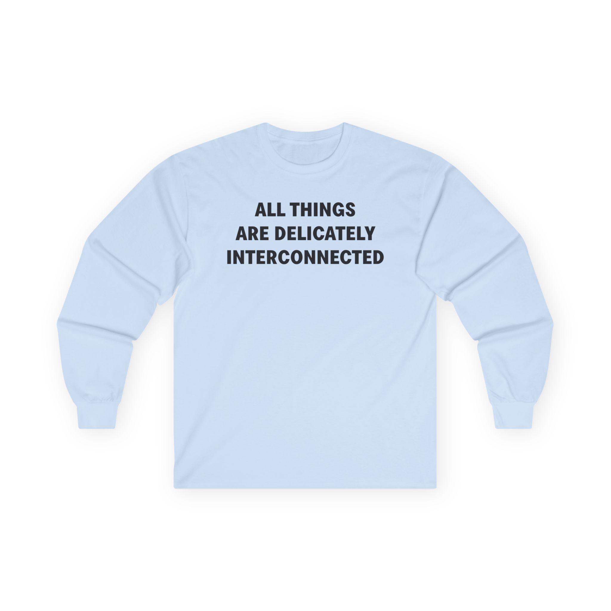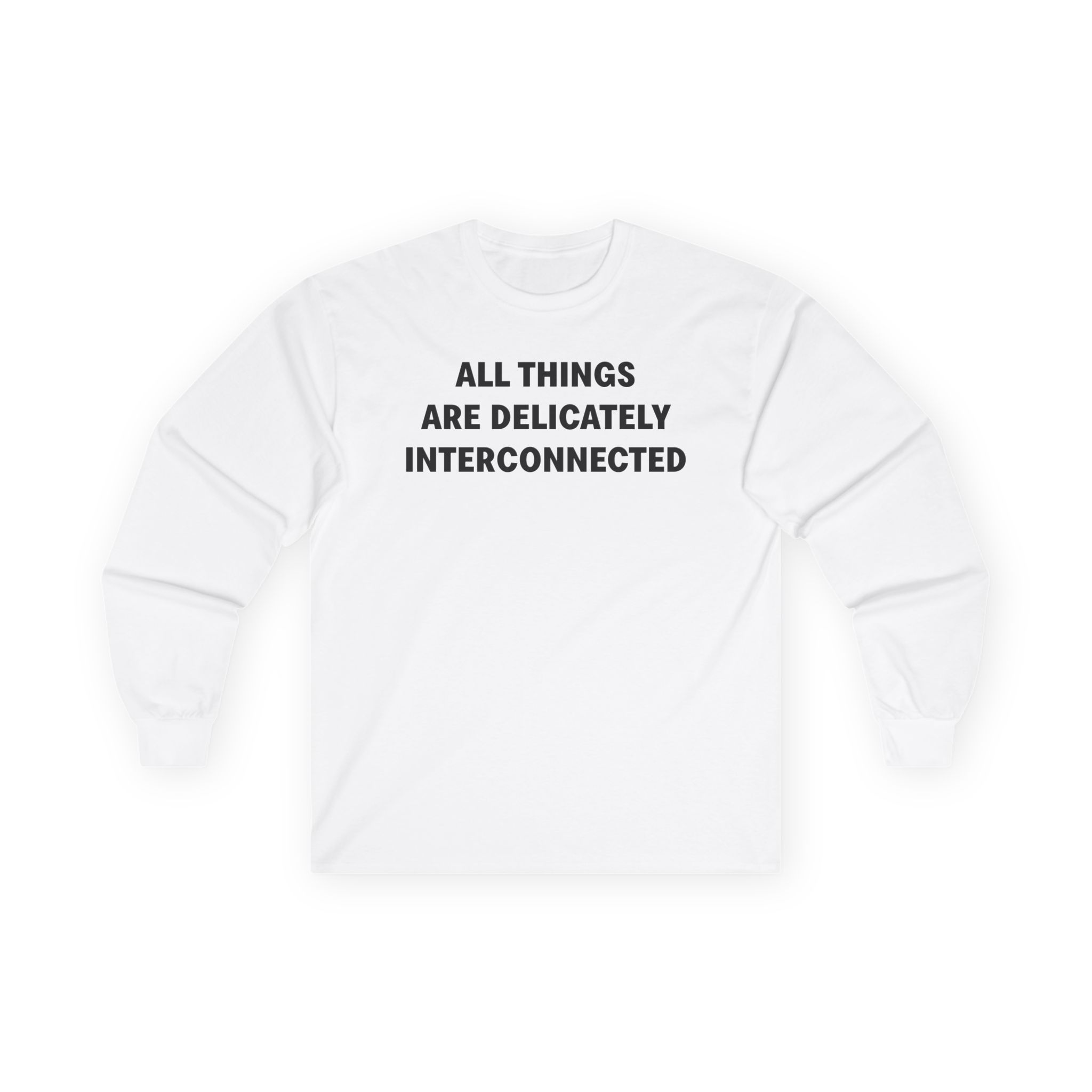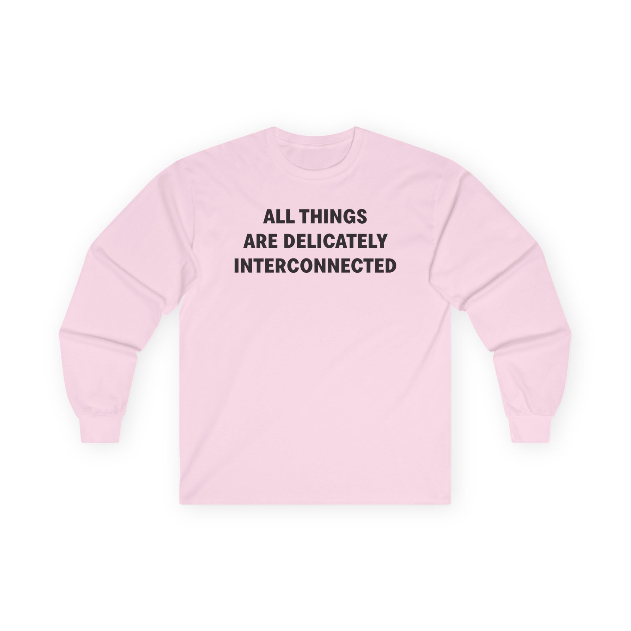 This Jenny Holzer All Things Are Delicately Interconnected Unisex Ultra Cotton Long Sleeve Tee brings vintage concert vibes to everyday wear. Soft yet substantial cotton and a classic, slightly boxy fit create a lived-in feel that layers well under jackets or stands alone. The front art—bold mirrored sunglasses, a painted blue nose and red lips—feels like a snapshot from an ’80s tour poster. Wear it to record-store hangs, low-key gigs, or when you want a guarded nod to music history without shouting. It’s the kind of shirt that feels like it already remembers a hundred nights out.