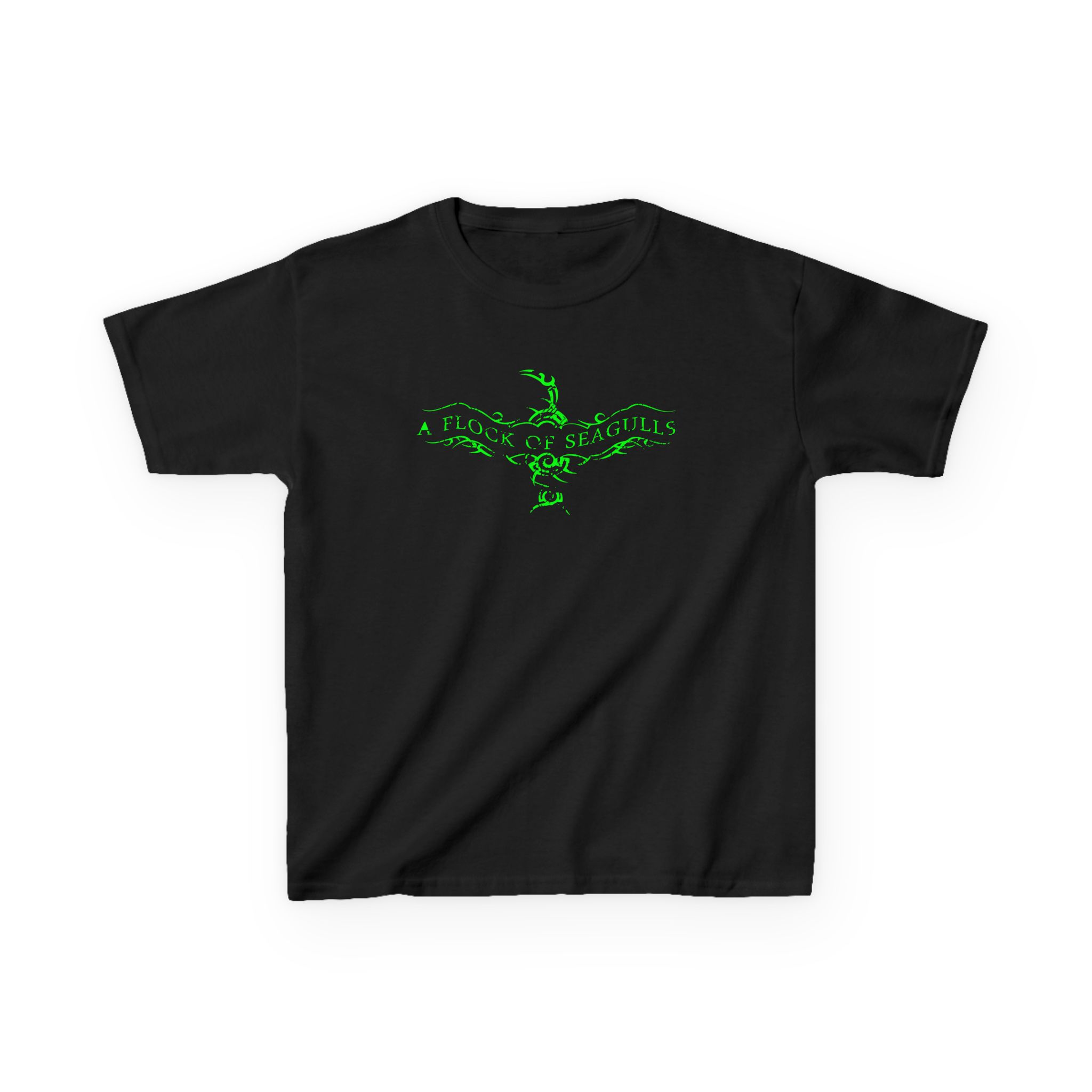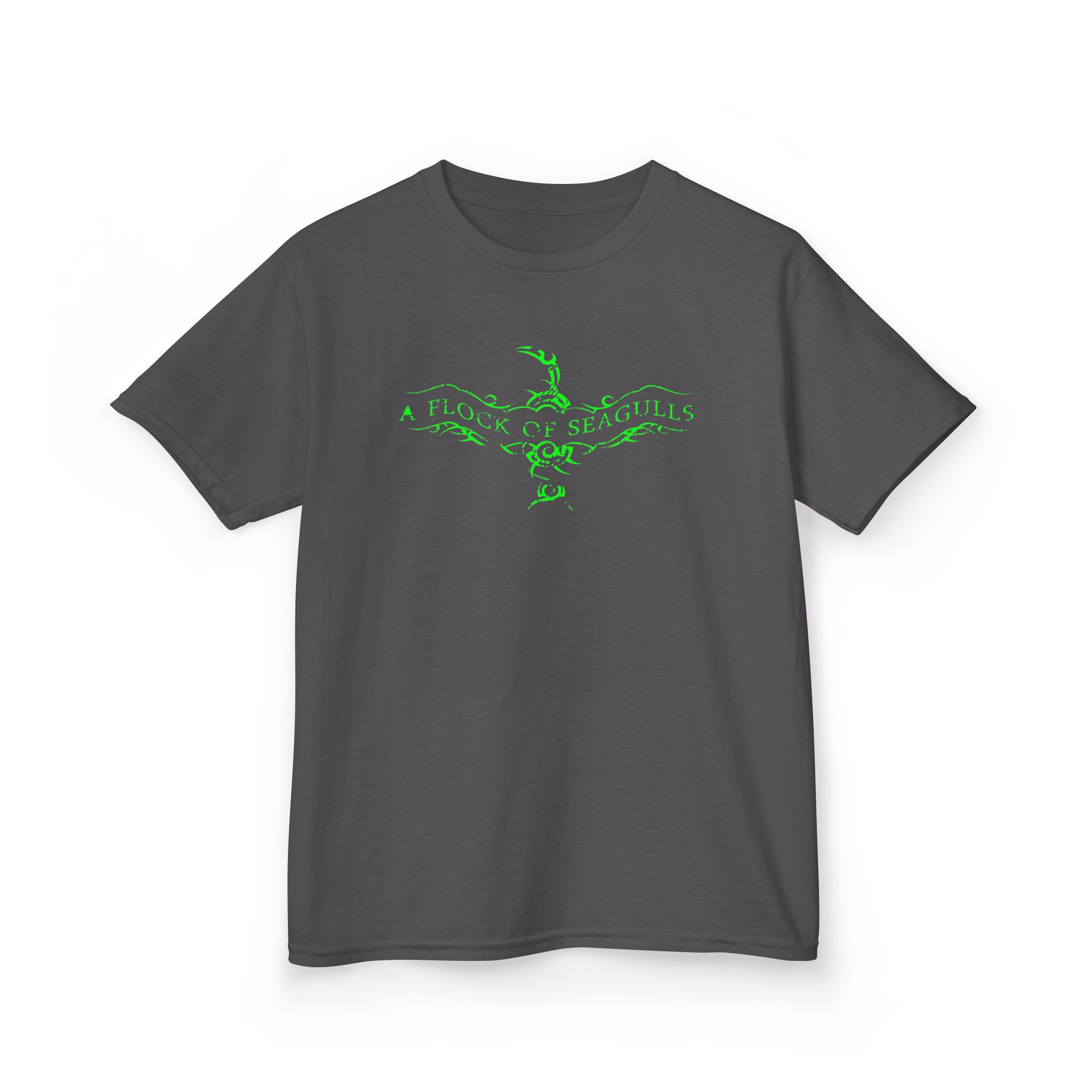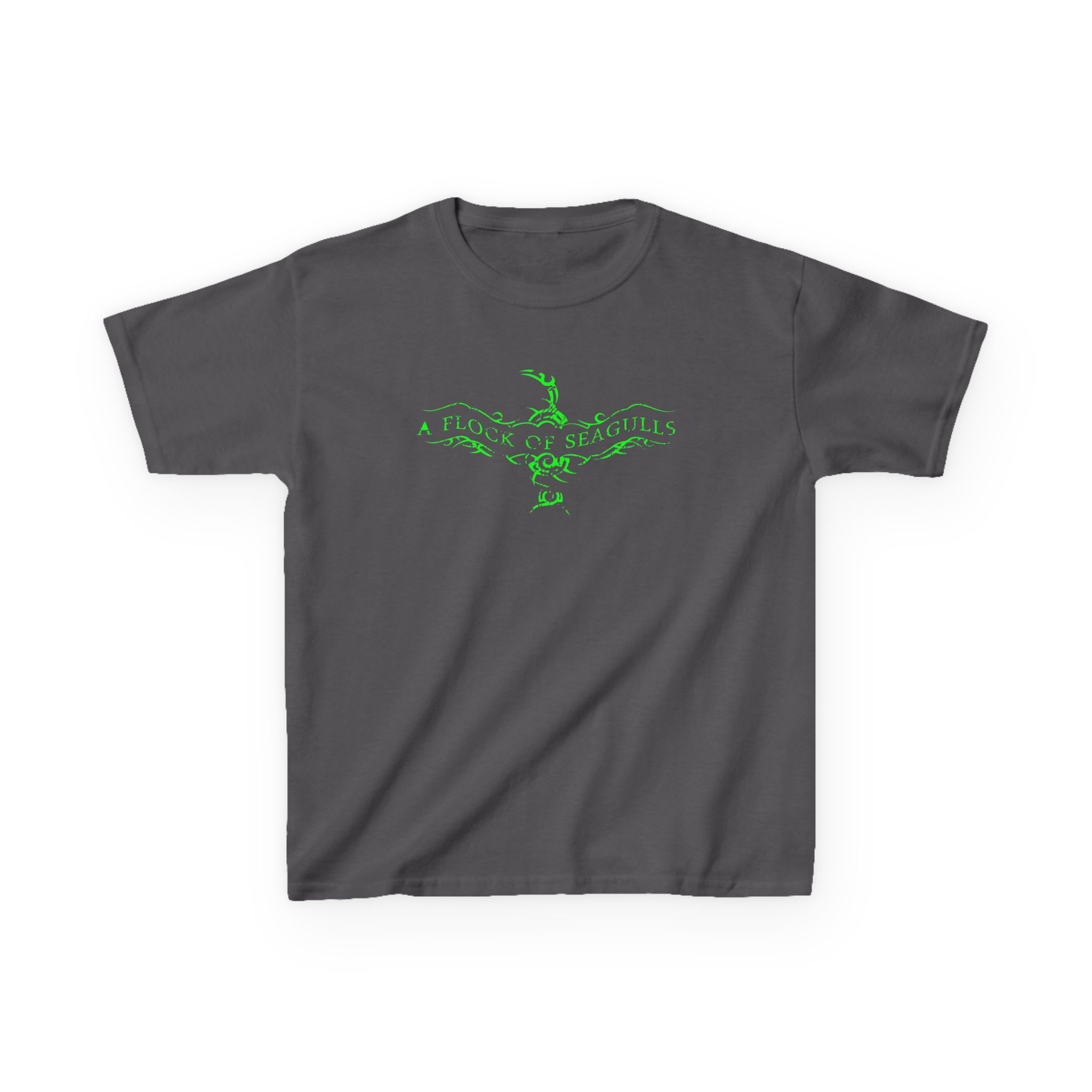 The kids A Flock of Seagulls Logo heavy cotton tee is perfect for everyday use. The fabric is 100% cotton for solid colors. Polyester is included for heather-color variants. These fabrics are prime materials for printing. The shoulders have twill tape for improved durability. The collar is curl resistant due to ribbed knitting. There are no seams along the sides.