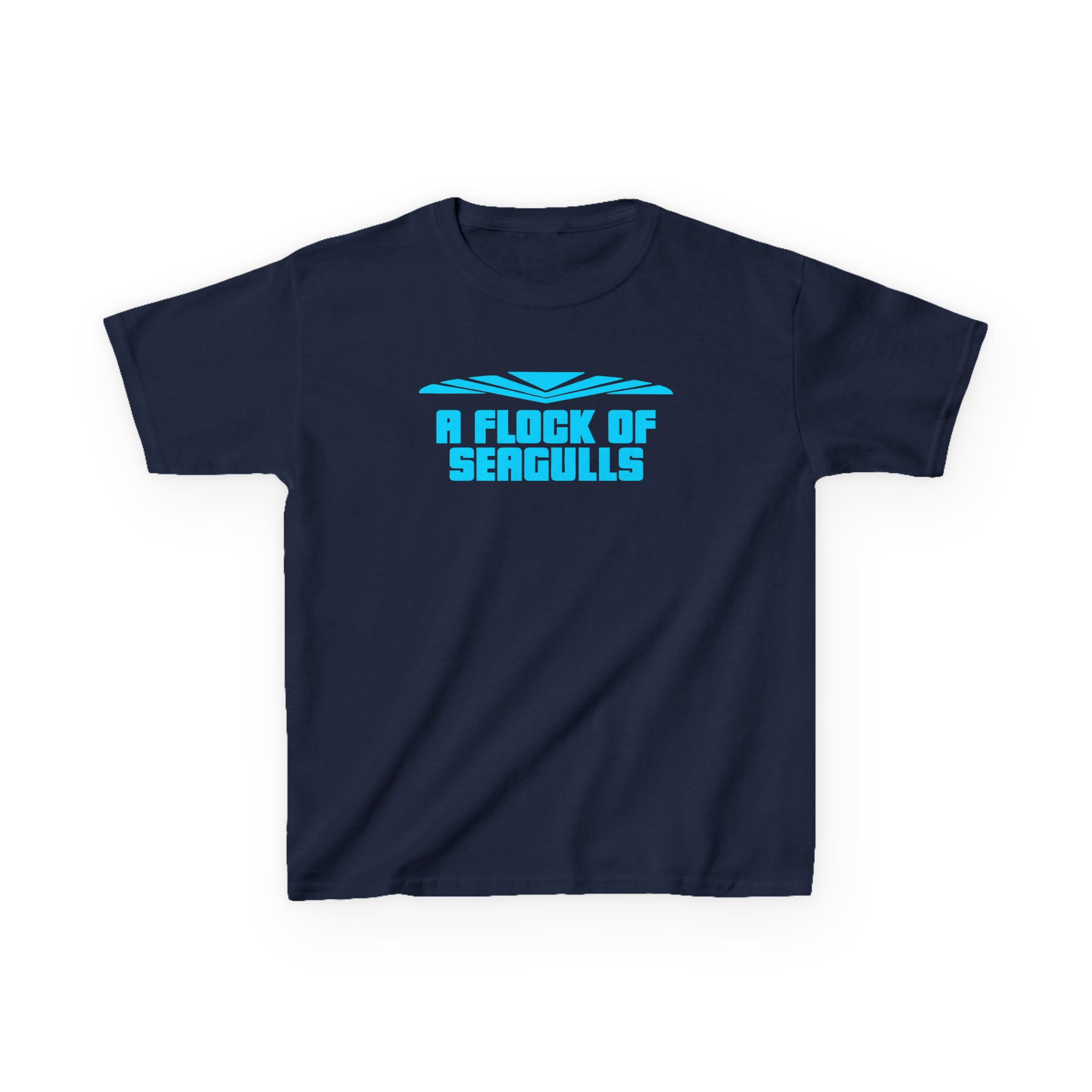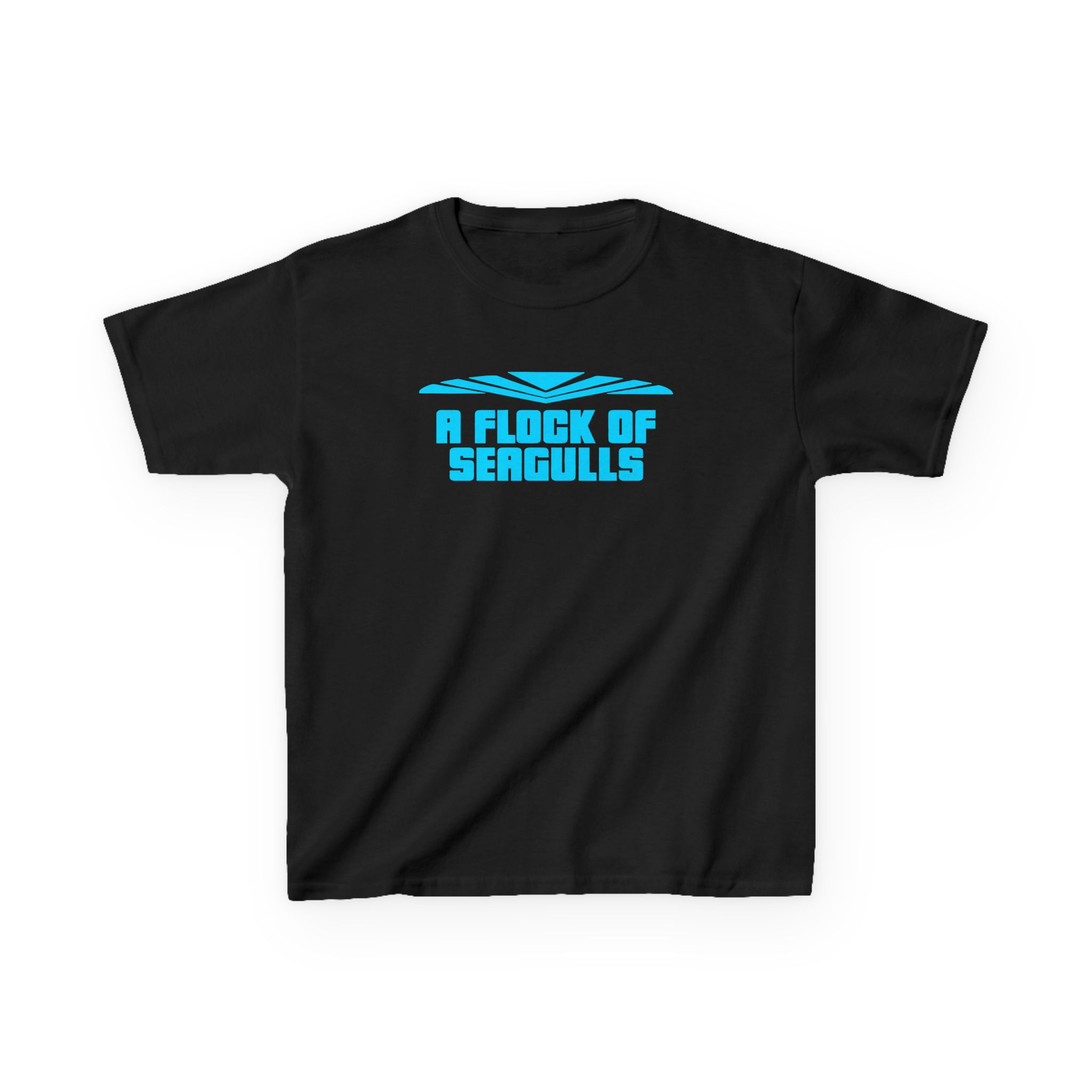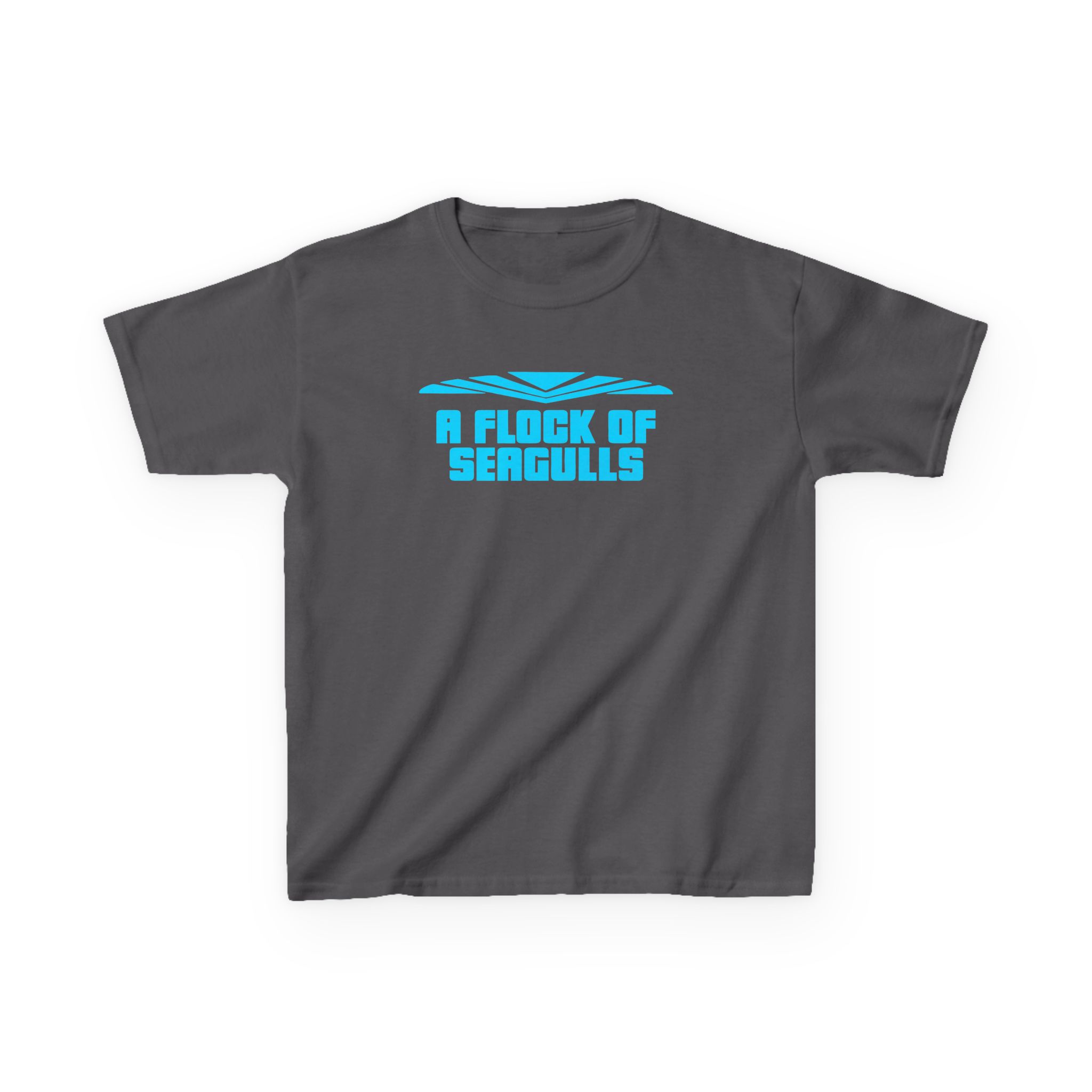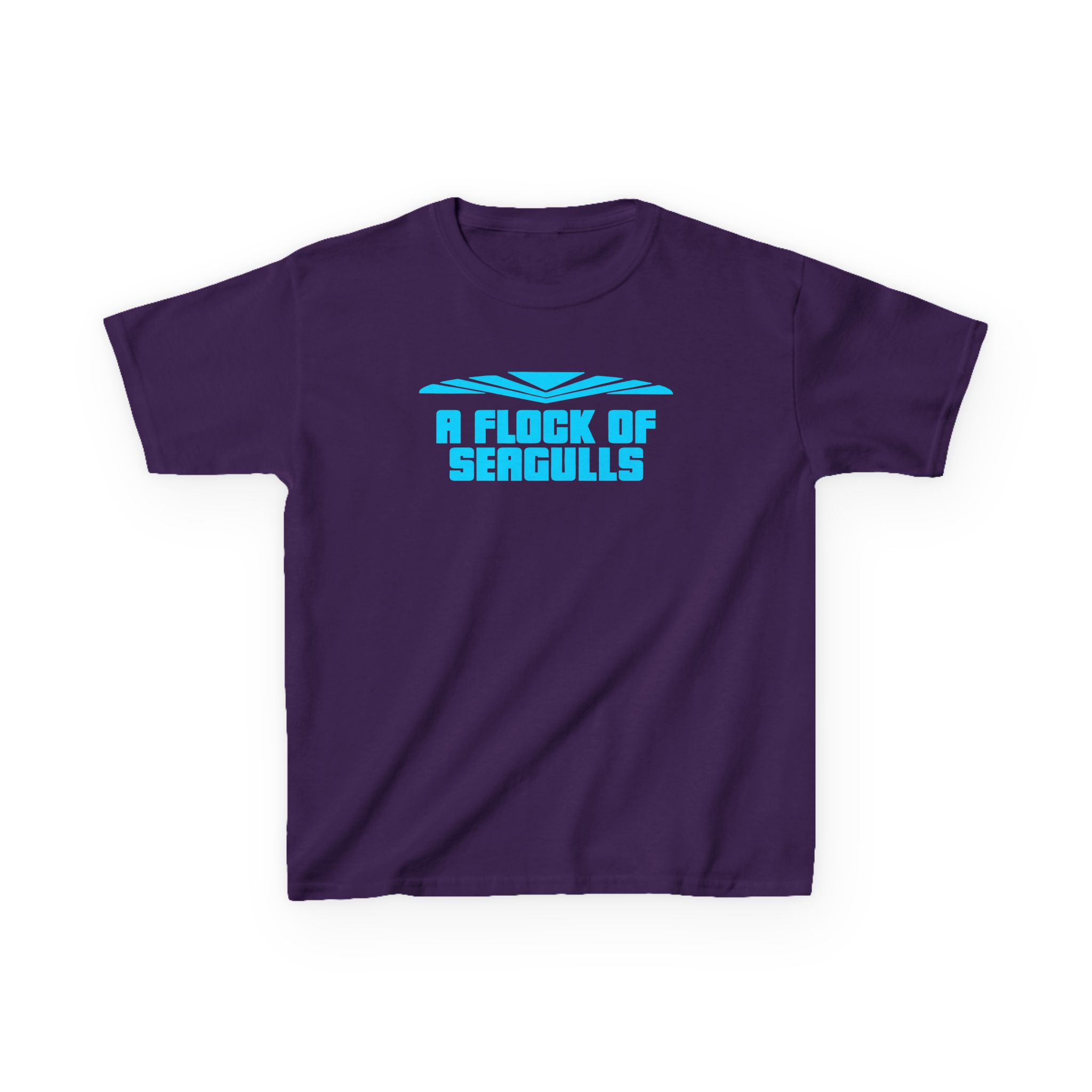 The kids A Flock of Seagulls Logo heavy cotton tee is perfect for everyday use. The fabric is 100% cotton for solid colors. Polyester is included for heather-color variants. These fabrics are prime materials for printing. The shoulders have twill tape for improved durability. The collar is curl resistant due to ribbed knitting. There are no seams along the sides.
