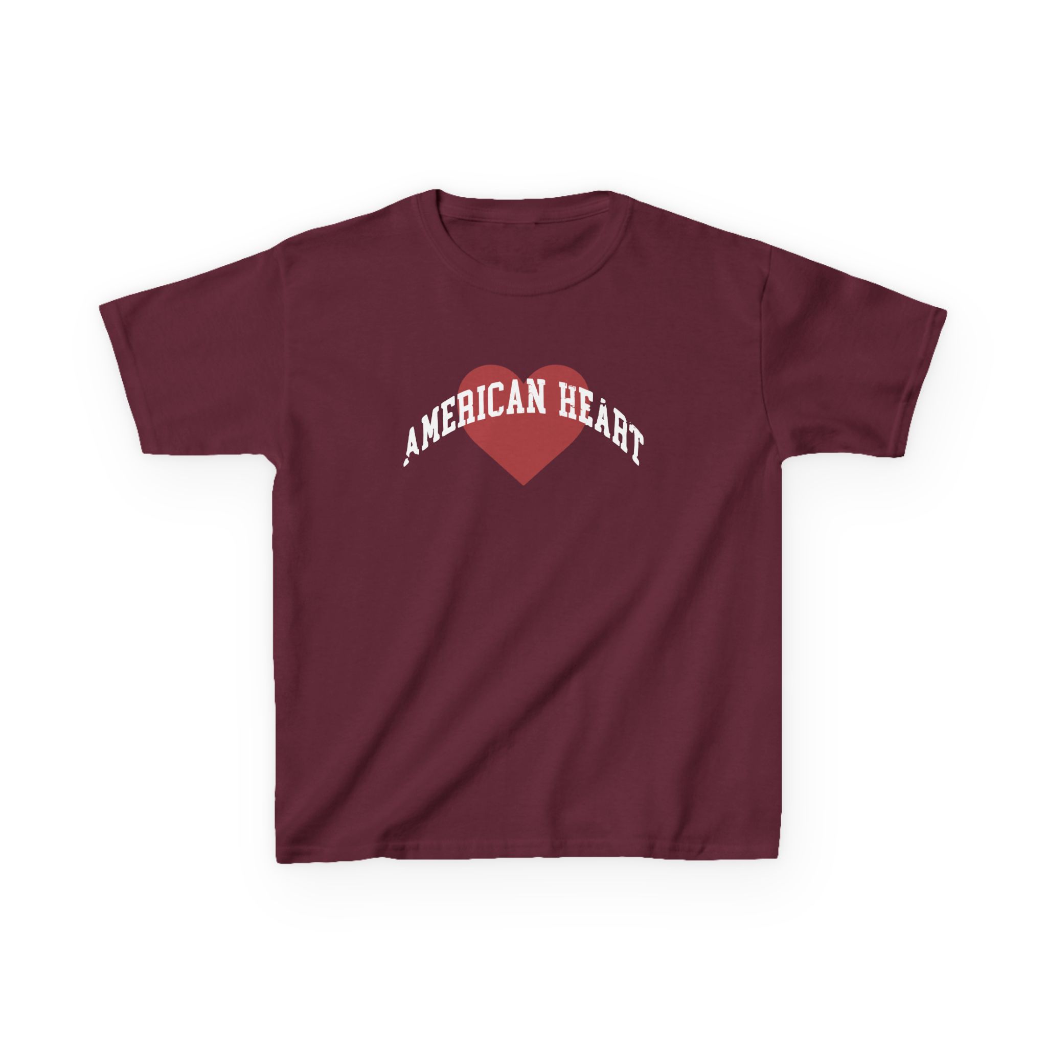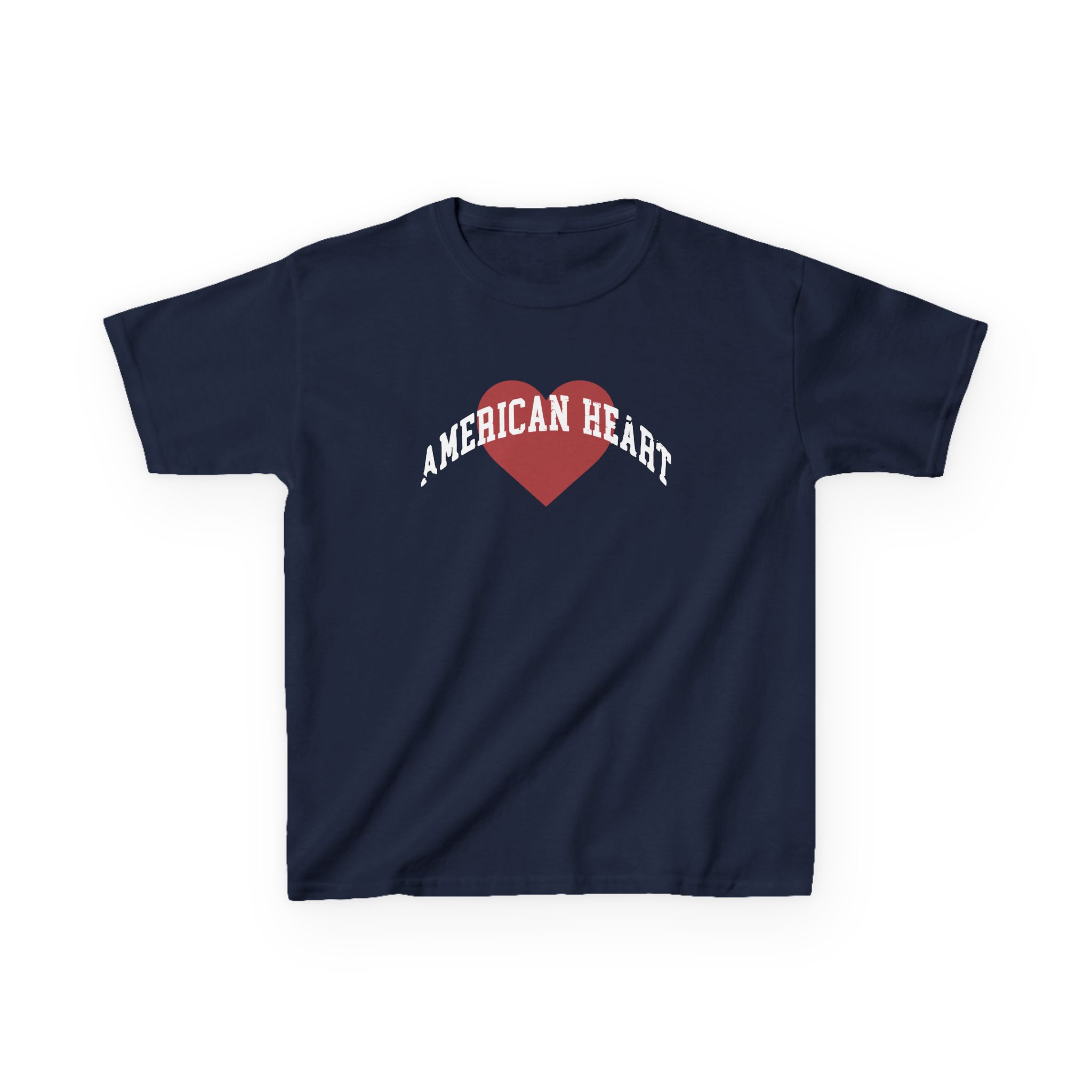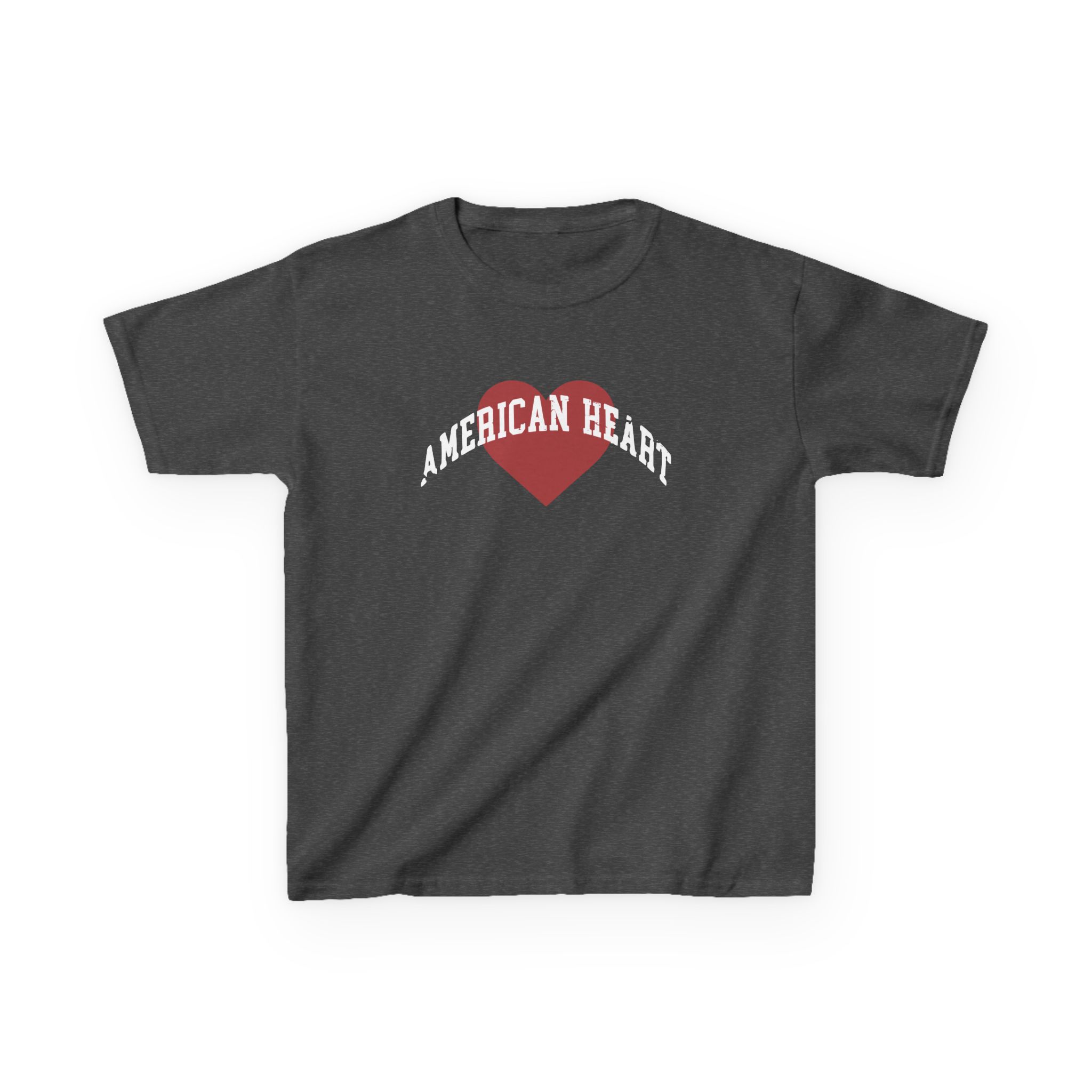 The kids Benson Boone American Heart heavy cotton tee is perfect for everyday use. The fabric is 100% cotton for solid colors. Polyester is included for heather-color variants. These fabrics are prime materials for printing. The shoulders have twill tape for improved durability. The collar is curl resistant due to ribbed knitting. There are no seams along the sides.