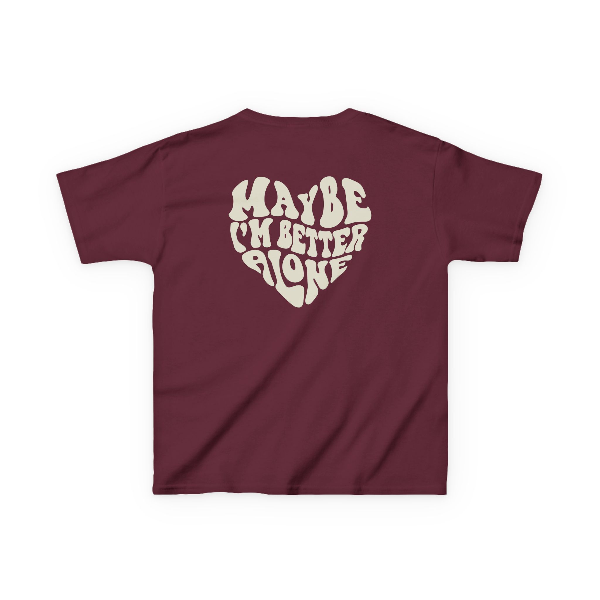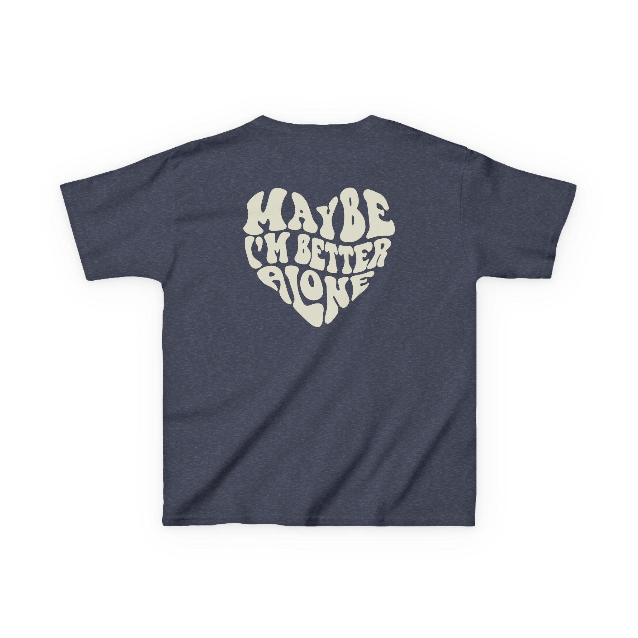 The kids Benson Boone Maybe I Am Better Alone heavy cotton tee is perfect for everyday use. The fabric is 100% cotton for solid colors. Polyester is included for heather-color variants. These fabrics are prime materials for printing. The shoulders have twill tape for improved durability. The collar is curl resistant due to ribbed knitting. There are no seams along the sides.