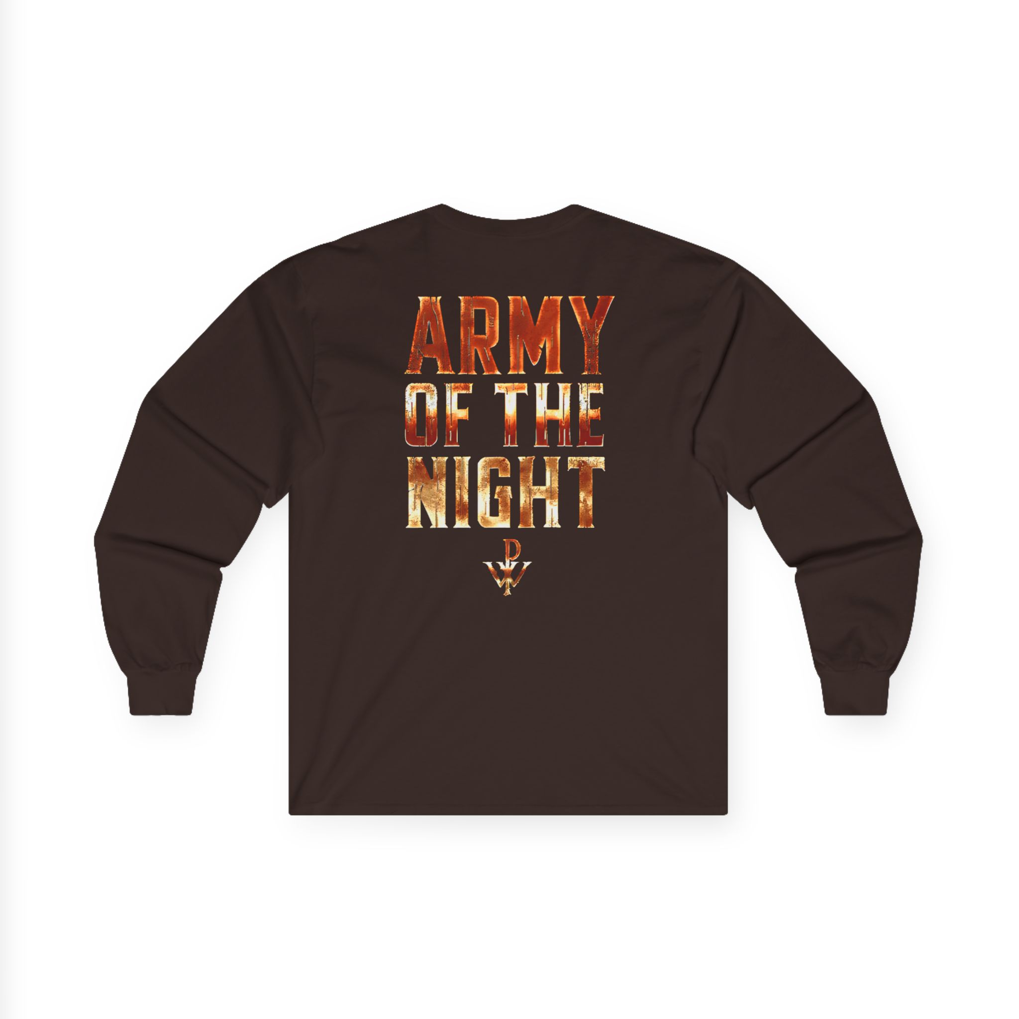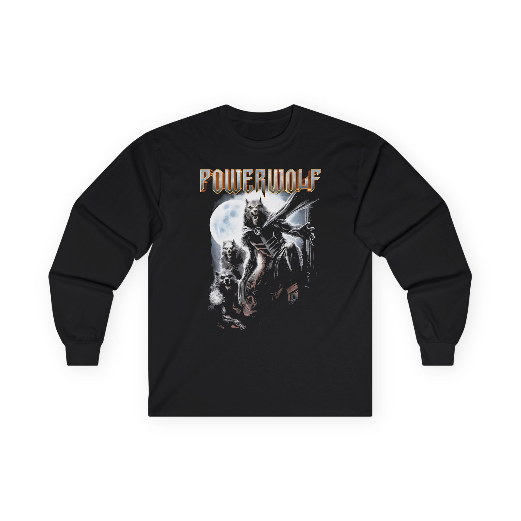 This Powerwolf Army of the Night long-sleeve tee brings vintage concert vibes to everyday wear. Soft yet substantial cotton and a classic, slightly boxy fit create a lived-in feel that layers well under jackets or stands alone. The front art—bold mirrored sunglasses, a painted blue nose and red lips—feels like a snapshot from an ’80s tour poster. Wear it to record-store hangs, low-key gigs, or when you want a guarded nod to music history without shouting. It’s the kind of shirt that feels like it already remembers a hundred nights out.