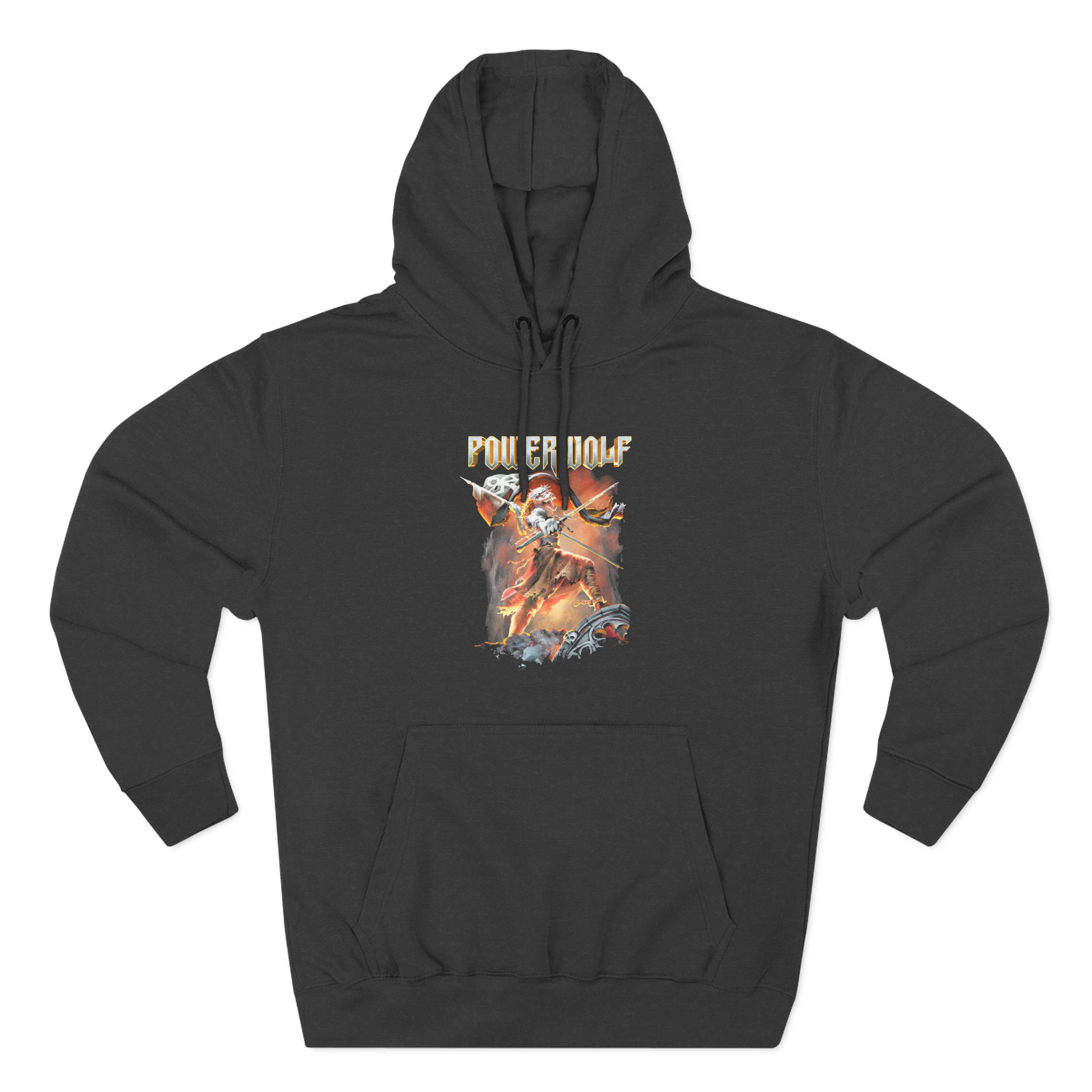 This Powerwolf Wild for Life charcoal fleece hoodie settles into your rotation like an old friend — soft, weighty, and quietly bold. The three-panel hood and adjustable drawcord frame your face on blustery mornings. A roomy kangaroo pocket keeps hands warm and holds what you need for a quick walk or a late-night errand. The front artwork sits low and distressed, giving the piece a lived-in, slightly rebellious vibe that works whether you’re heading to a gig, a practice, or a coffee run. Built with sturdy double-needle seams and a soft 3-end fleece interior, it wears well over years of wear and washes while keeping its shape.