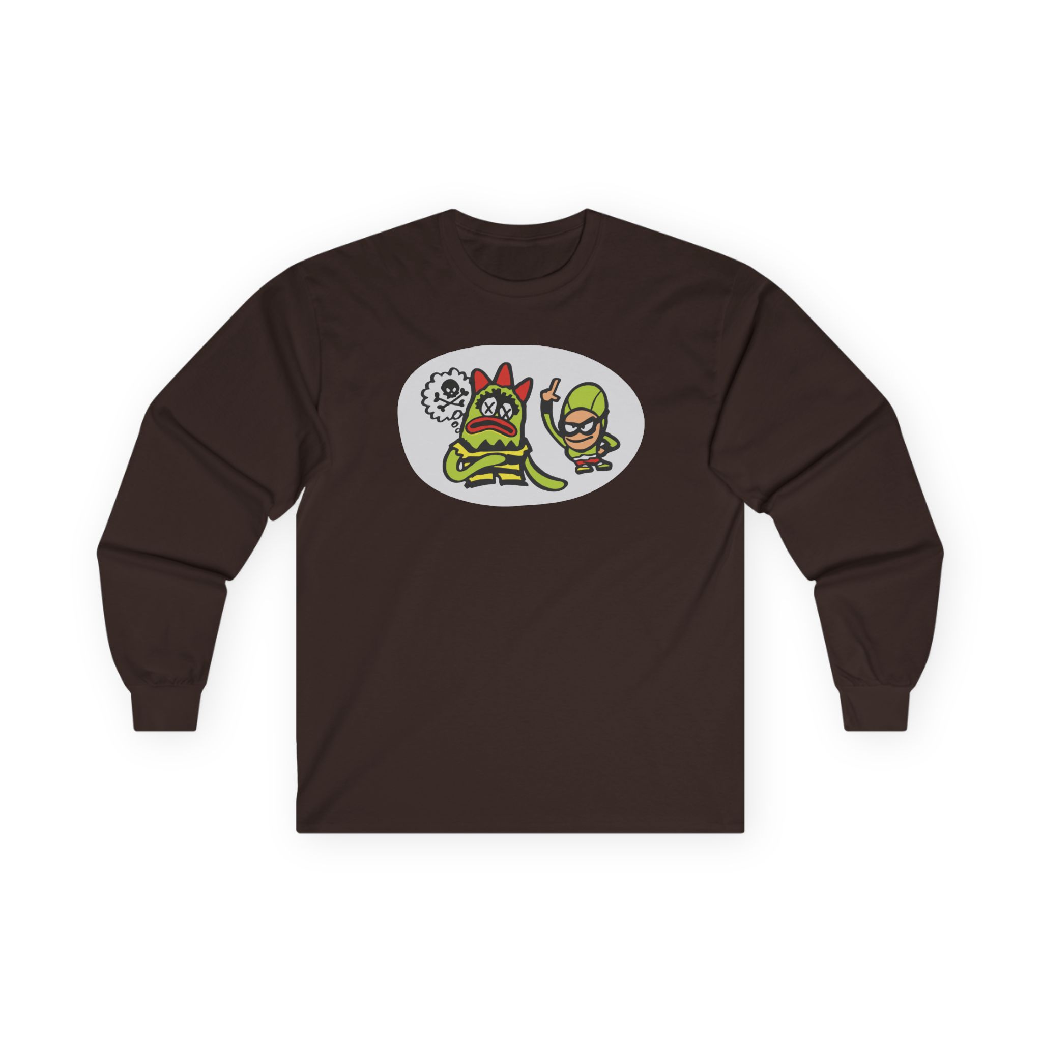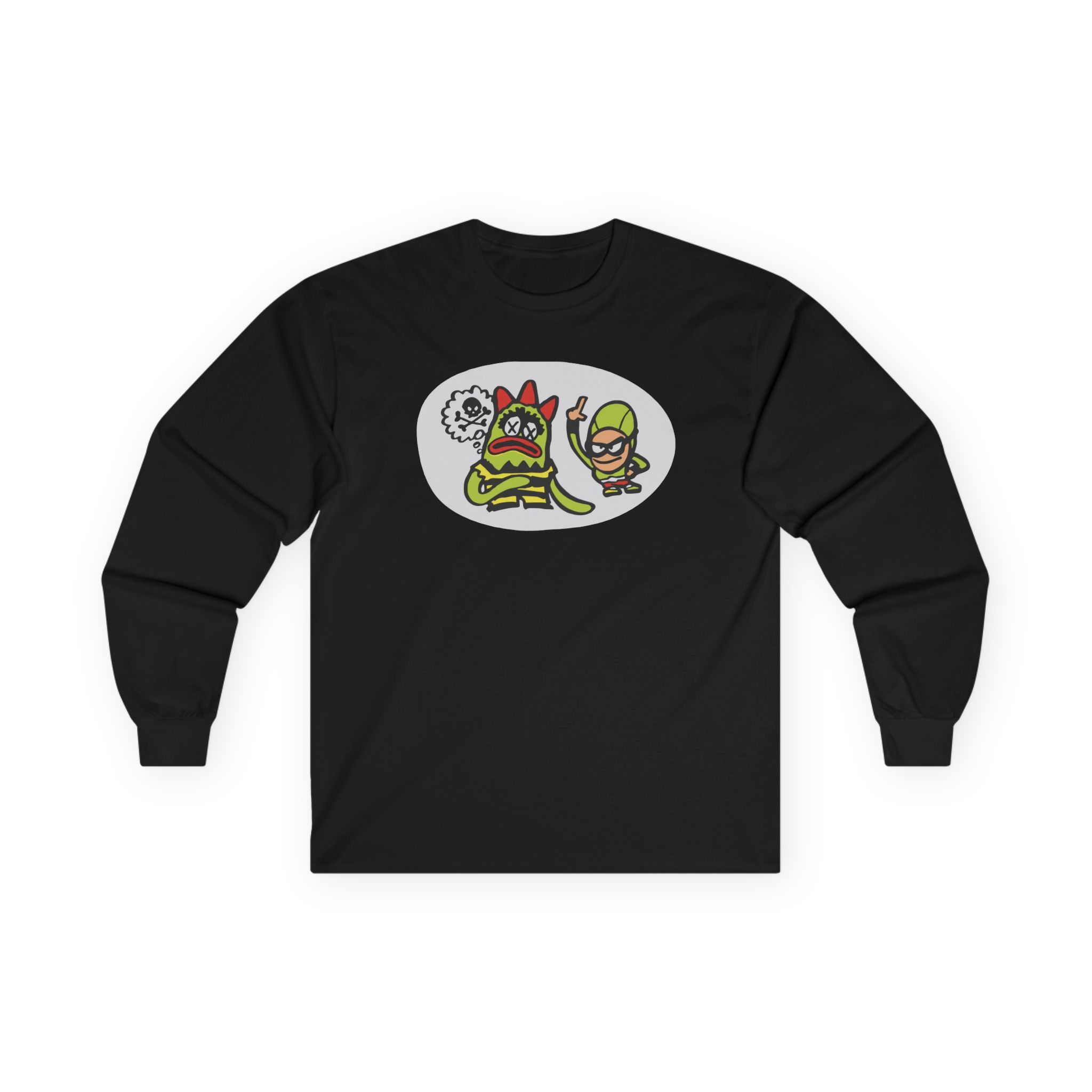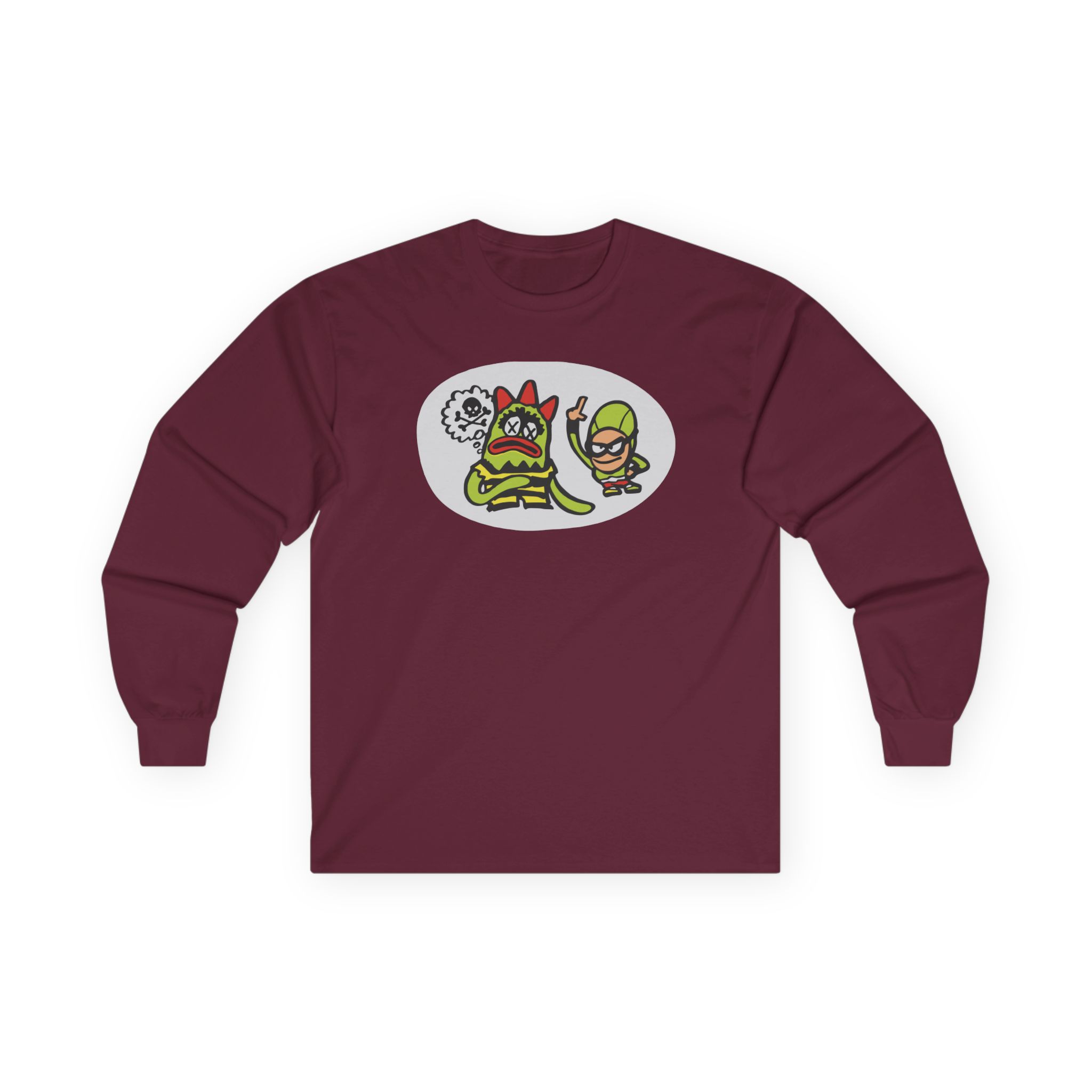 The Aquabats Bat Commander long-sleeve tee brings vintage concert vibes to everyday wear. Soft yet substantial cotton and a classic, slightly boxy fit create a lived-in feel that layers well under jackets or stands alone. The front art—bold mirrored sunglasses, a painted blue nose and red lips—feels like a snapshot from an ’80s tour poster. Wear it to record-store hangs, low-key gigs, or when you want a guarded nod to music history without shouting. It’s the kind of shirt that feels like it already remembers a hundred nights out.