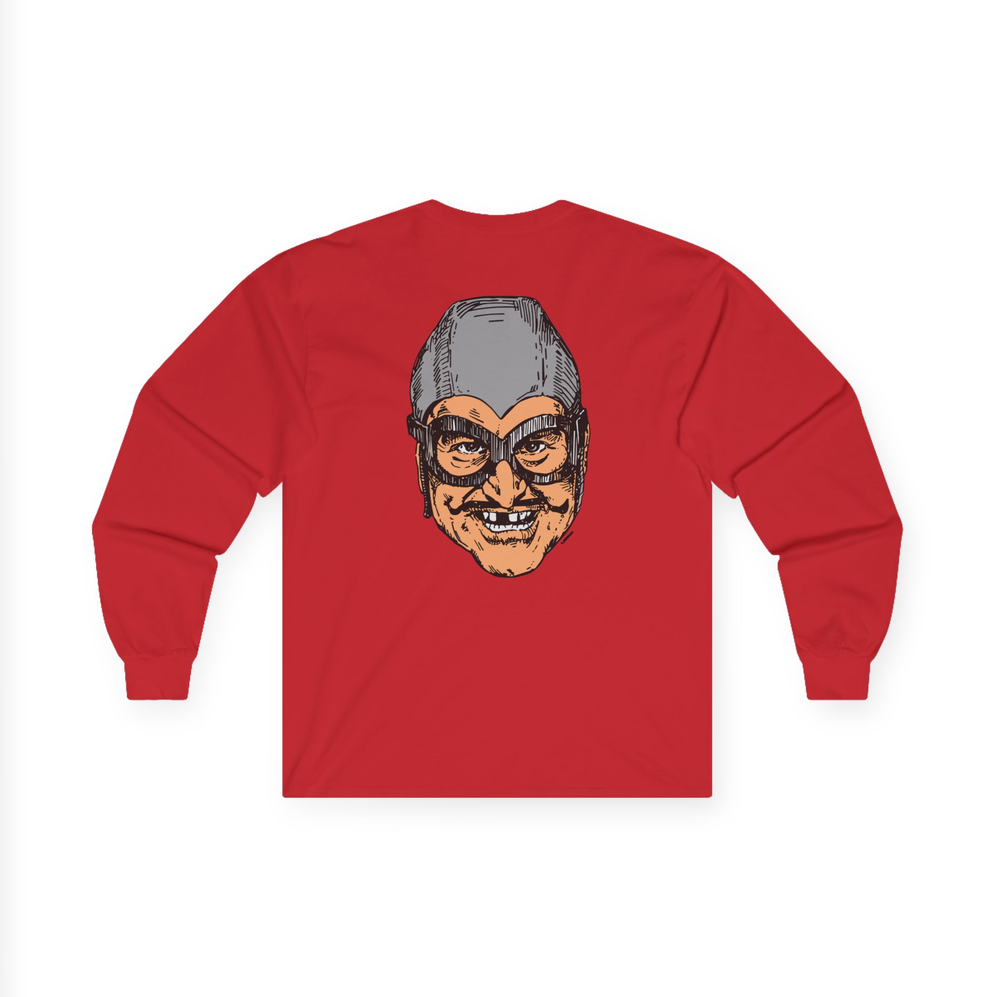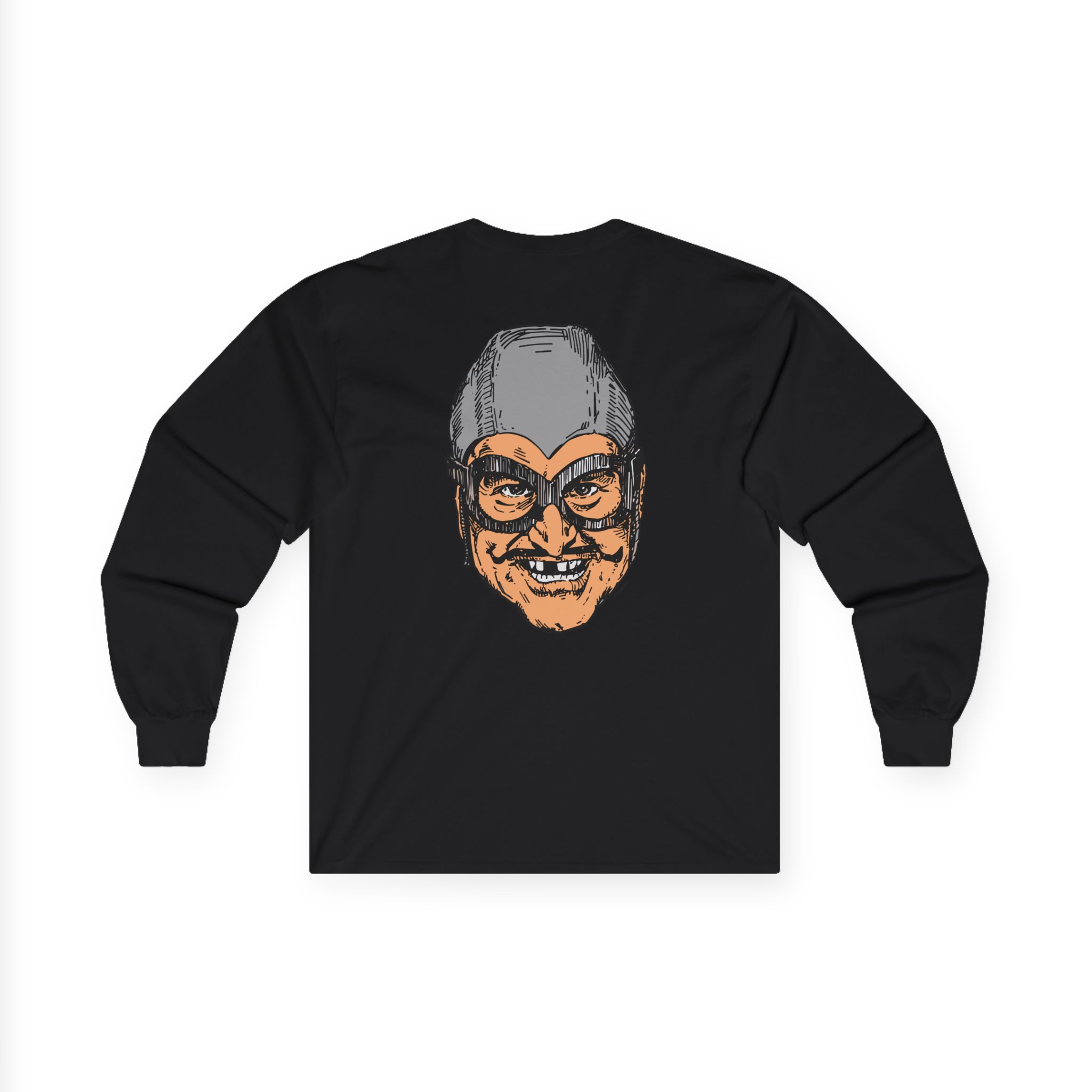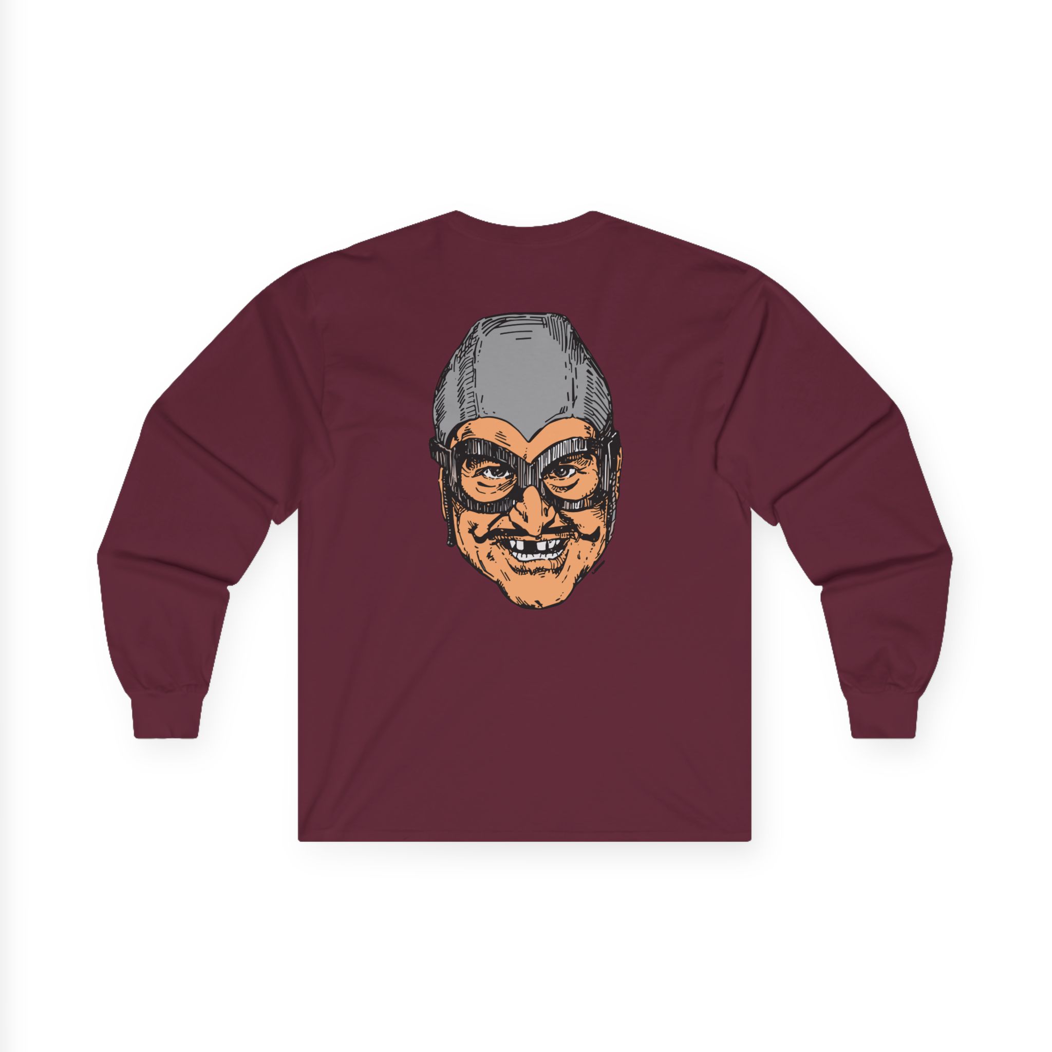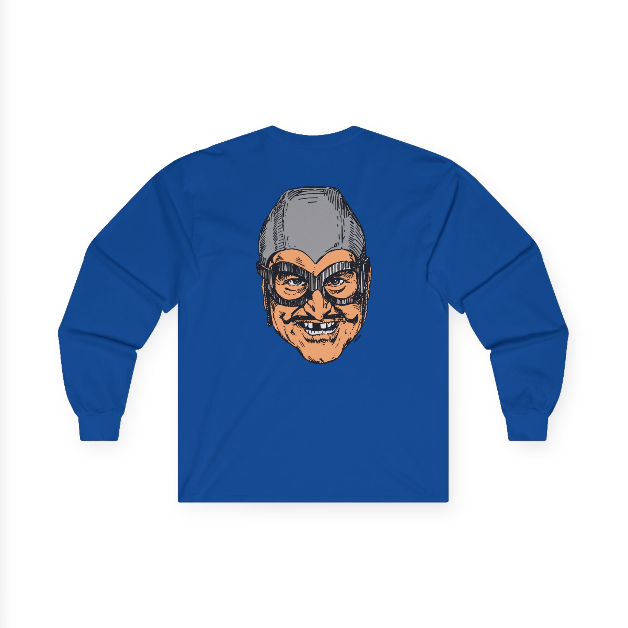 The Aquabats Bat Commander long-sleeve tee brings vintage concert vibes to everyday wear. Soft yet substantial cotton and a classic, slightly boxy fit create a lived-in feel that layers well under jackets or stands alone. The front art—bold mirrored sunglasses, a painted blue nose and red lips—feels like a snapshot from an ’80s tour poster. Wear it to record-store hangs, low-key gigs, or when you want a guarded nod to music history without shouting. It’s the kind of shirt that feels like it already remembers a hundred nights out.