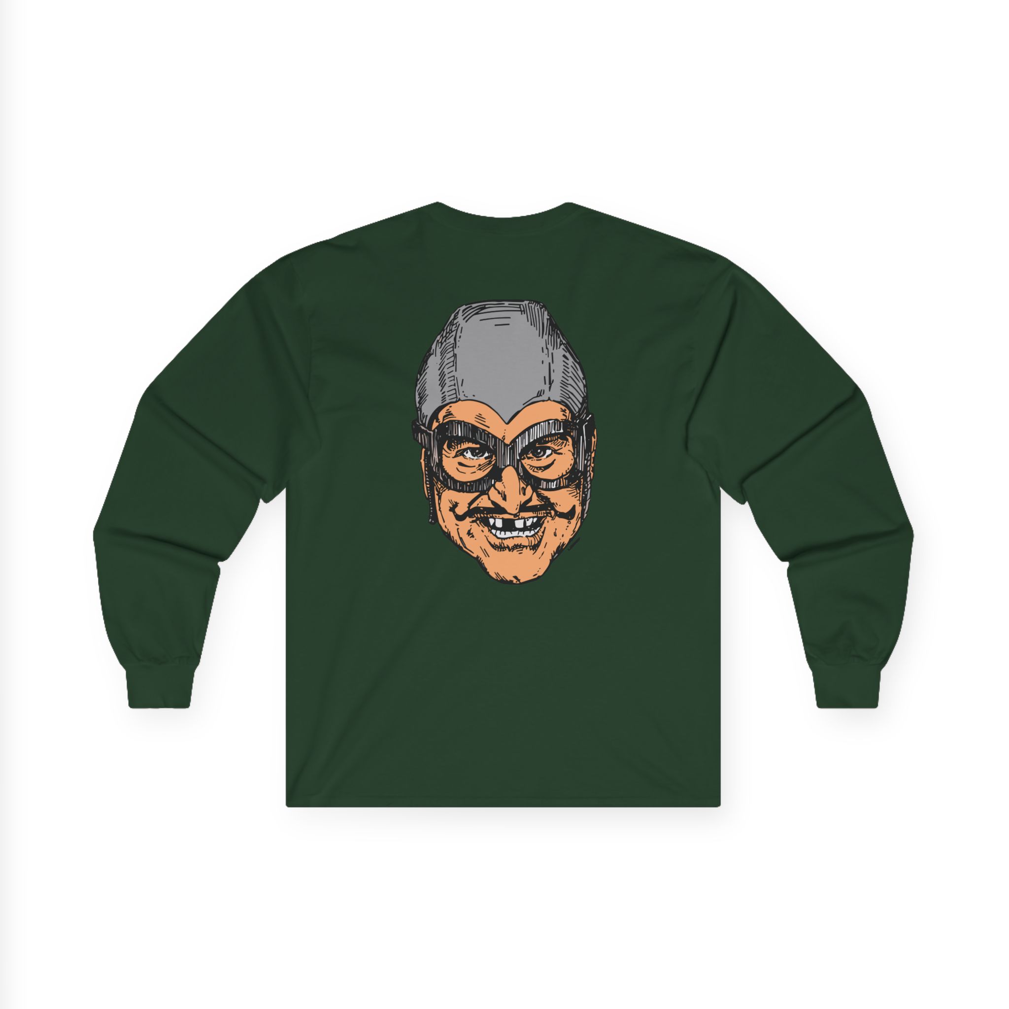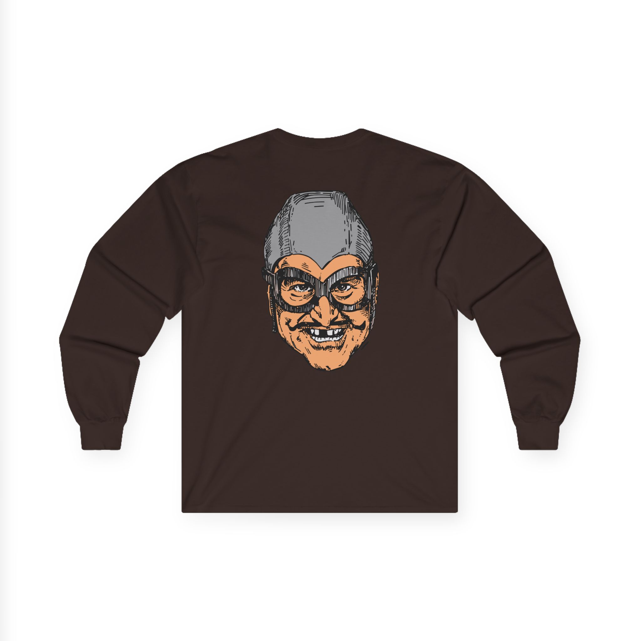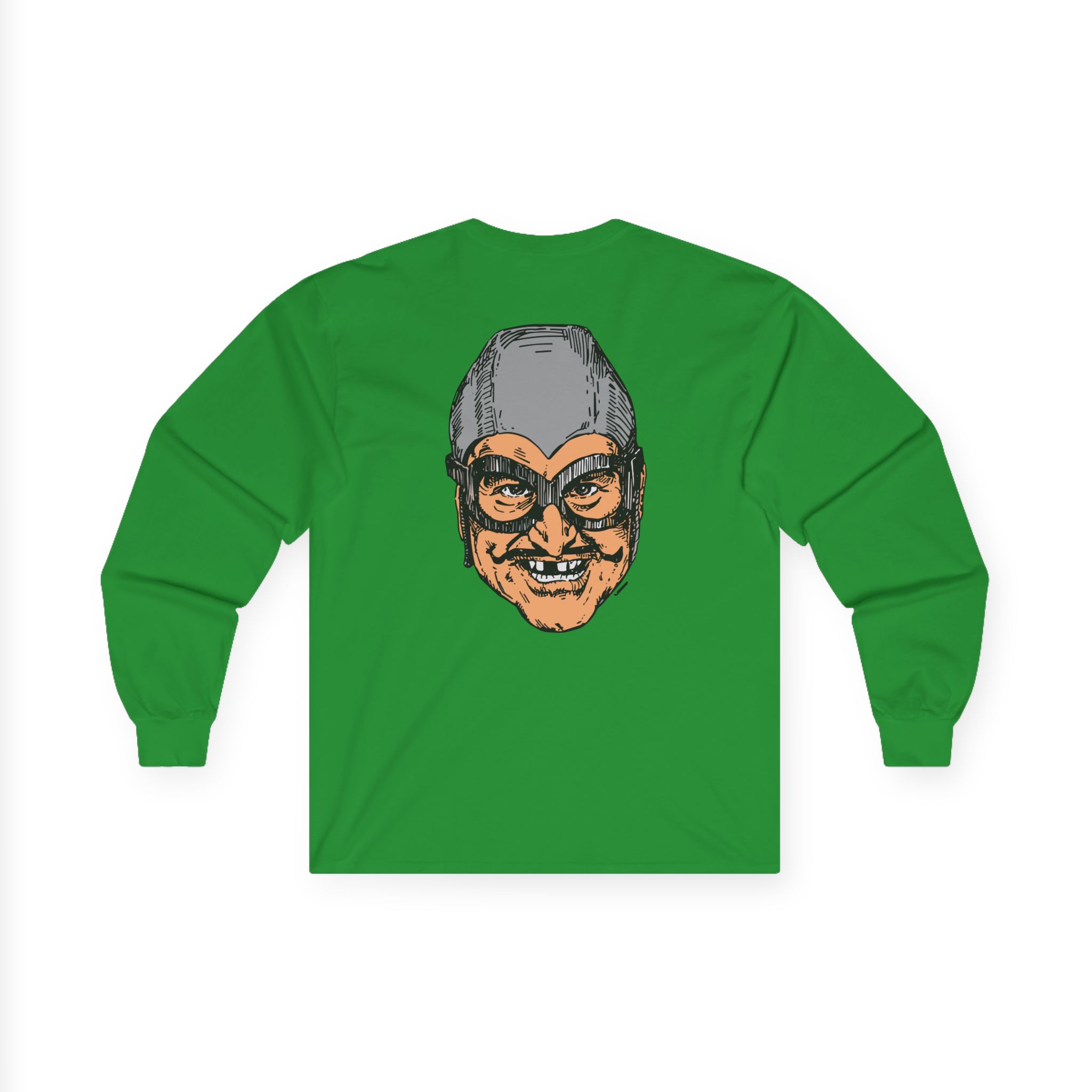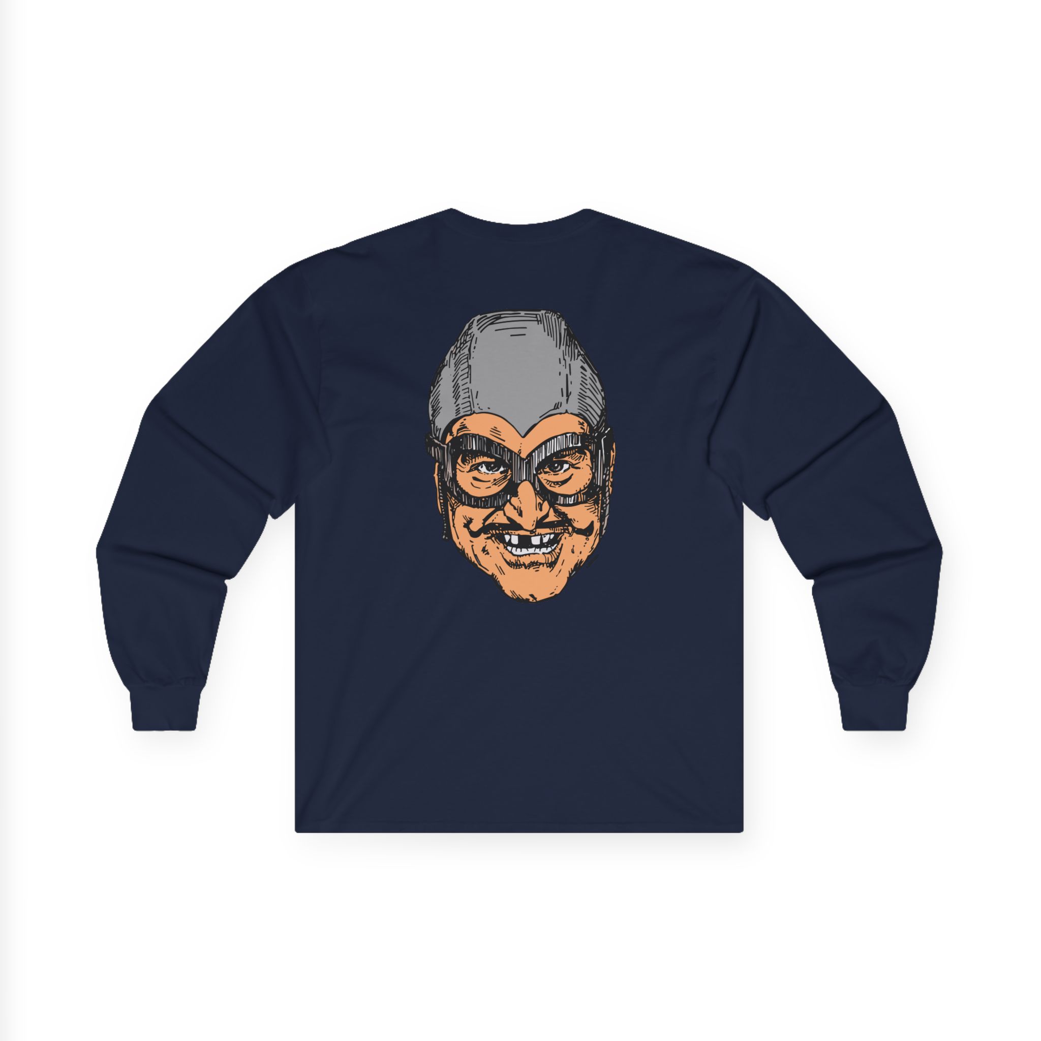 The Aquabats Bat Commander long-sleeve tee brings vintage concert vibes to everyday wear. Soft yet substantial cotton and a classic, slightly boxy fit create a lived-in feel that layers well under jackets or stands alone. The front art—bold mirrored sunglasses, a painted blue nose and red lips—feels like a snapshot from an ’80s tour poster. Wear it to record-store hangs, low-key gigs, or when you want a guarded nod to music history without shouting. It’s the kind of shirt that feels like it already remembers a hundred nights out.