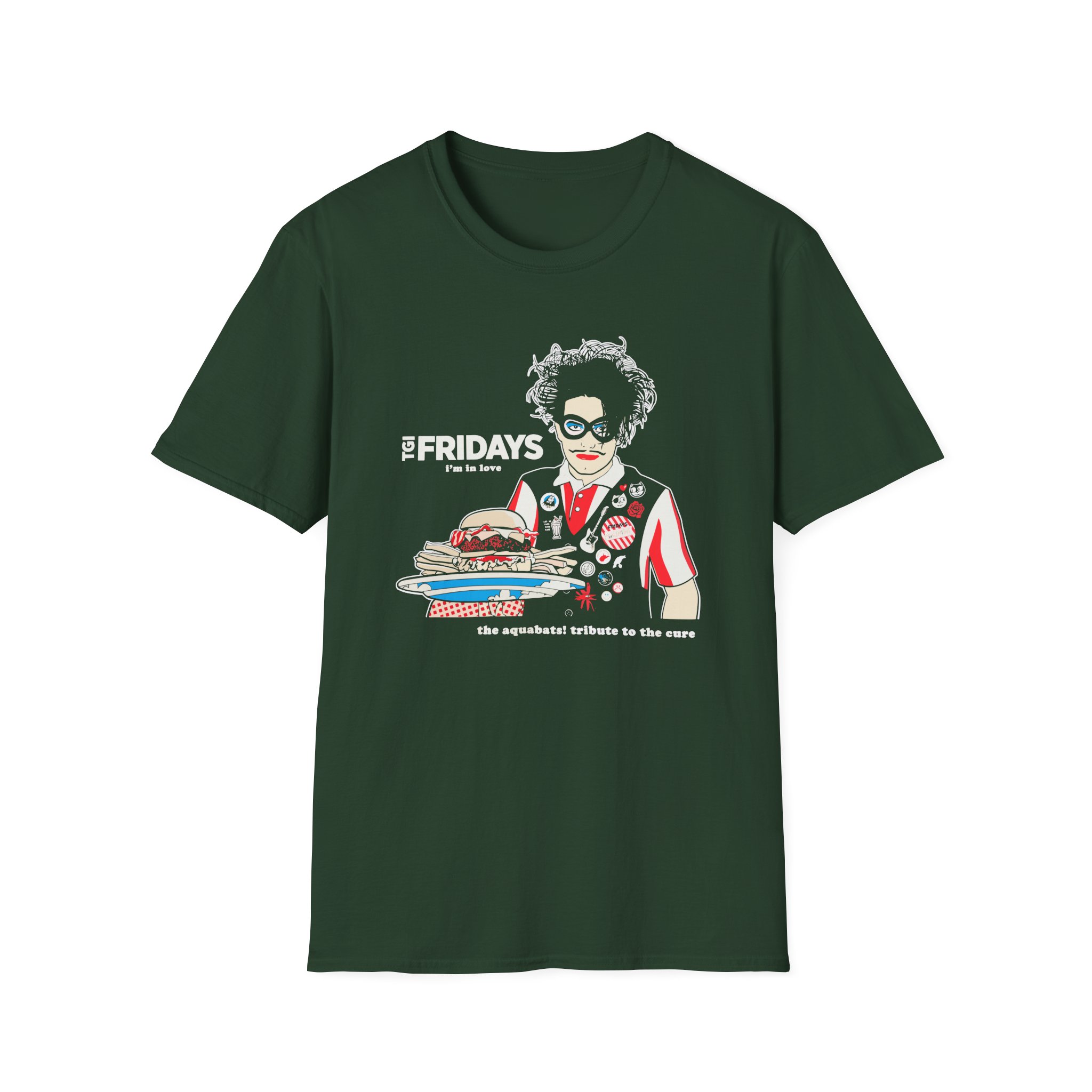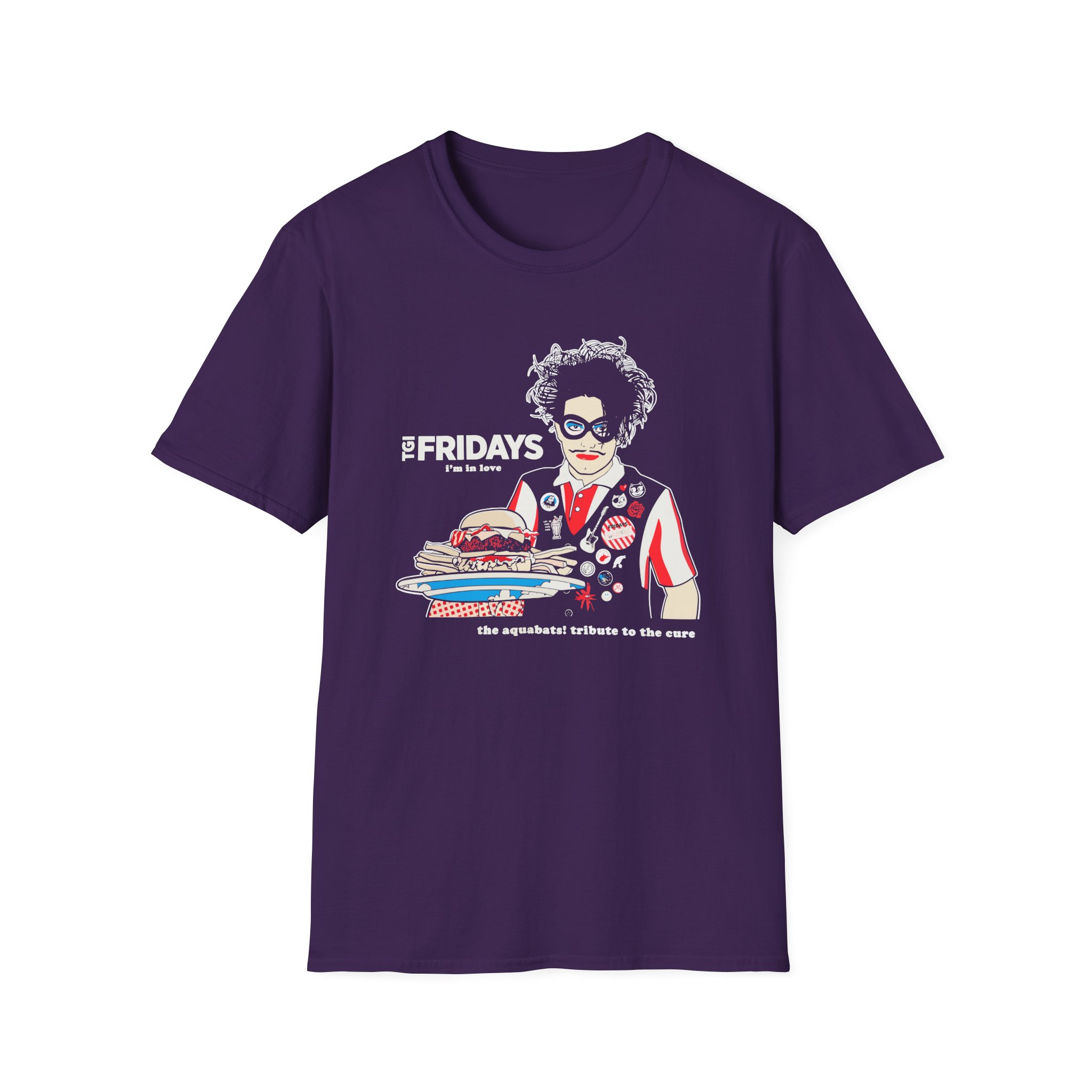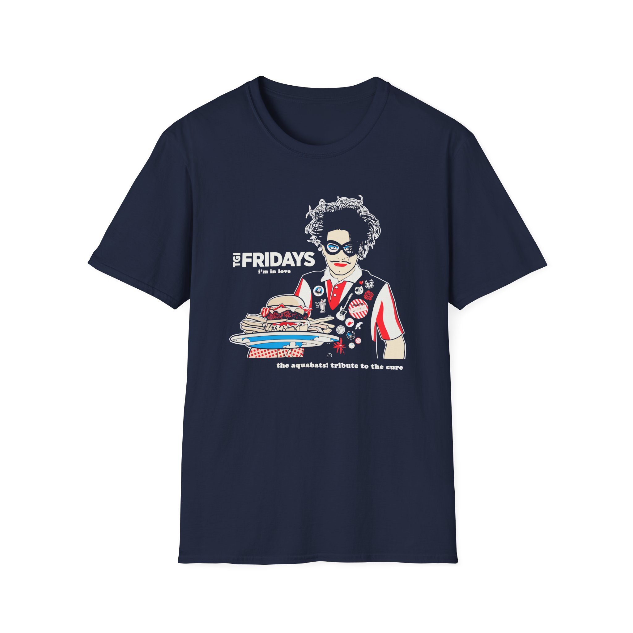 This lightweight, classic-fit tee carries a vintage tour-shirt look with hand-lettered script reading “The Aquabats TGI Fridays I'm In Love Tribute To The Cure” Soft ring-spun cotton and smooth printing make the graphic sit cleanly on the chest. Wear it to backyard shows, late-night drives, or when you want to bring a bit of road-worn Americana to a simple outfit. The crew neckline and tubular knit keep the silhouette neat, while shoulder tape and a ribbed collar hold the shape after many washes. It’s breathable, low-profile, and made to age with you—subtle black flecks appear on the Natural color for a lived-in feel.