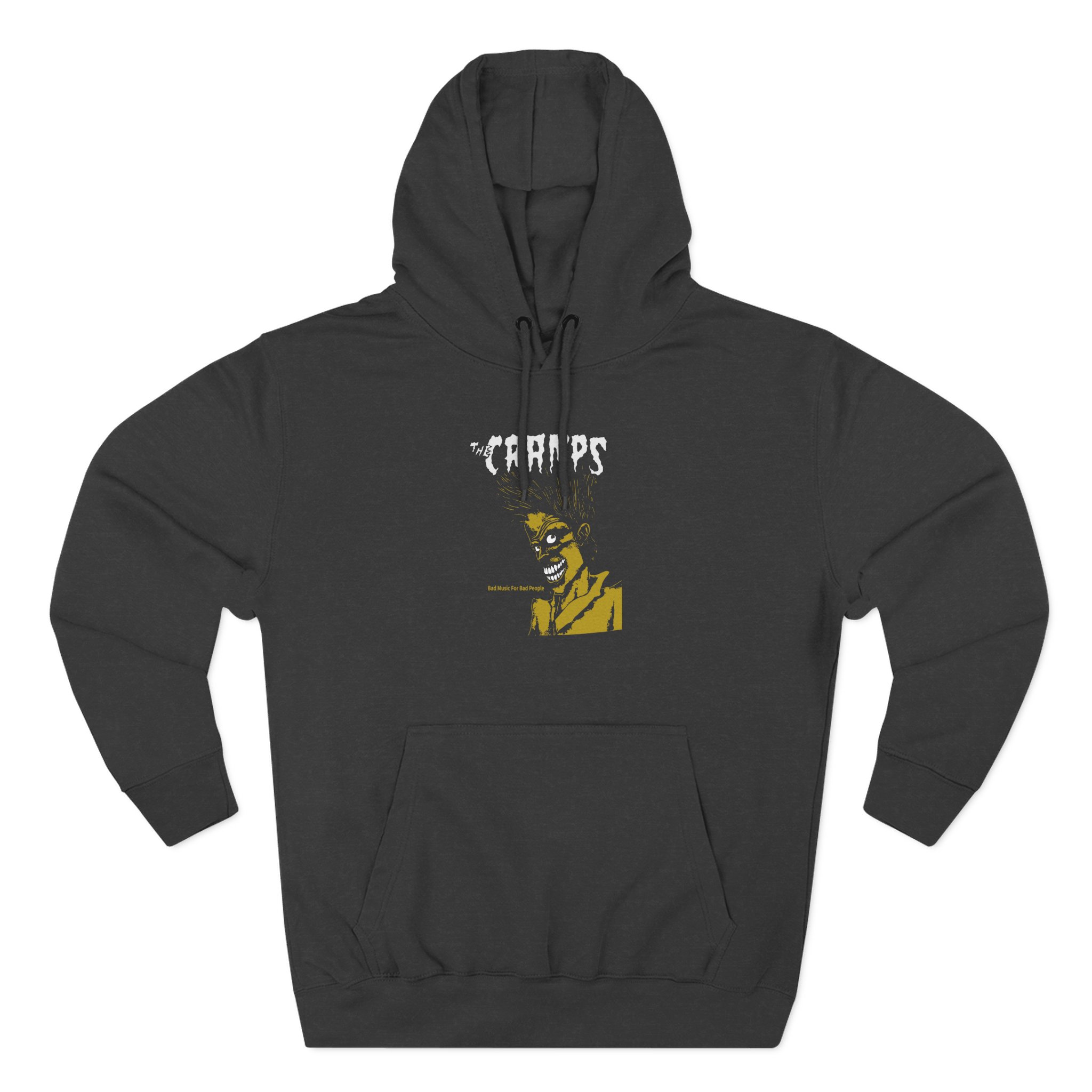 The Cramps Bad Music for Bad People charcoal fleece hoodie settles into your rotation like an old friend — soft, weighty, and quietly bold. The three-panel hood and adjustable drawcord frame your face on blustery mornings. A roomy kangaroo pocket keeps hands warm and holds what you need for a quick walk or a late-night errand. The front artwork sits low and distressed, giving the piece a lived-in, slightly rebellious vibe that works whether you’re heading to a gig, a practice, or a coffee run. Built with sturdy double-needle seams and a soft 3-end fleece interior, it wears well over years of wear and washes while keeping its shape.