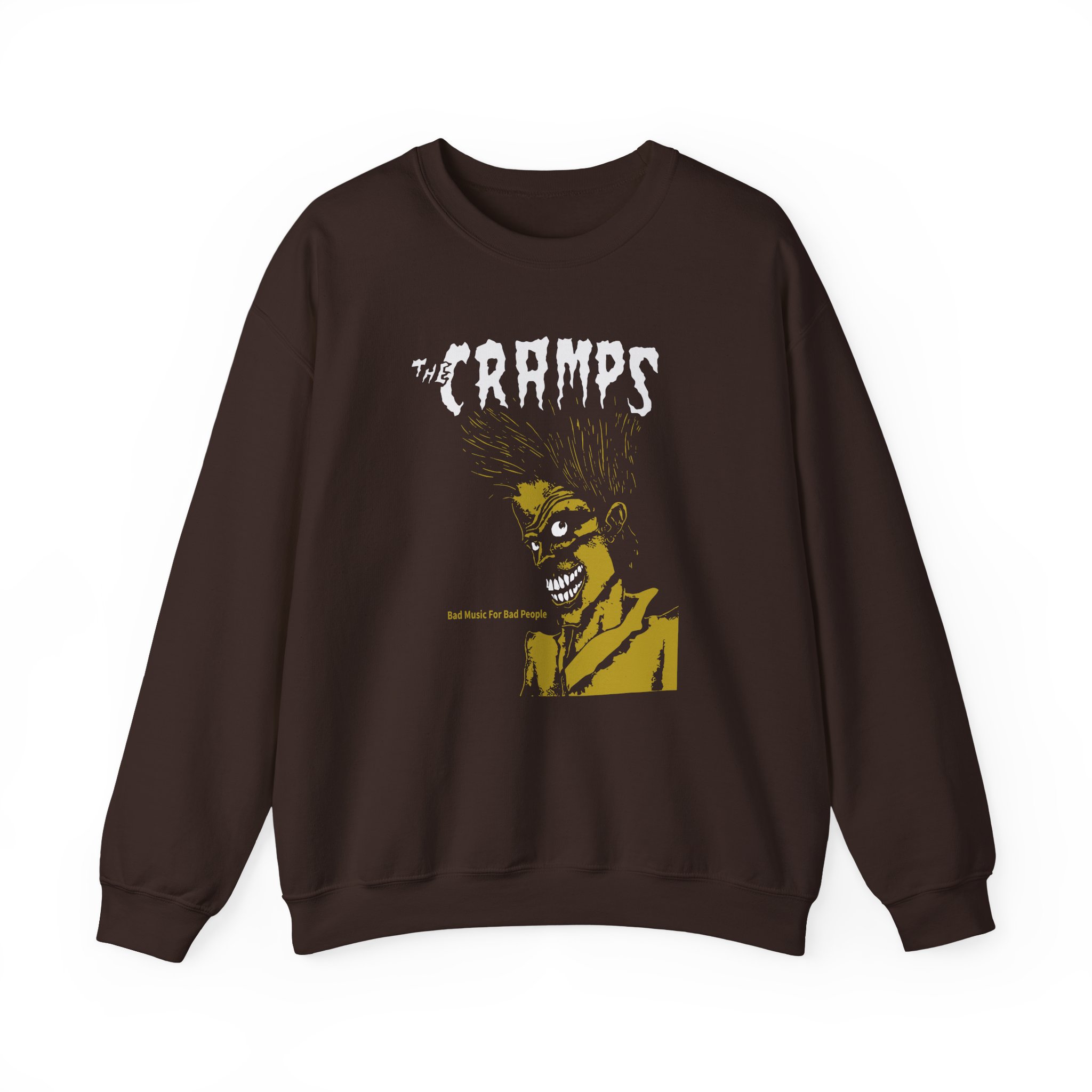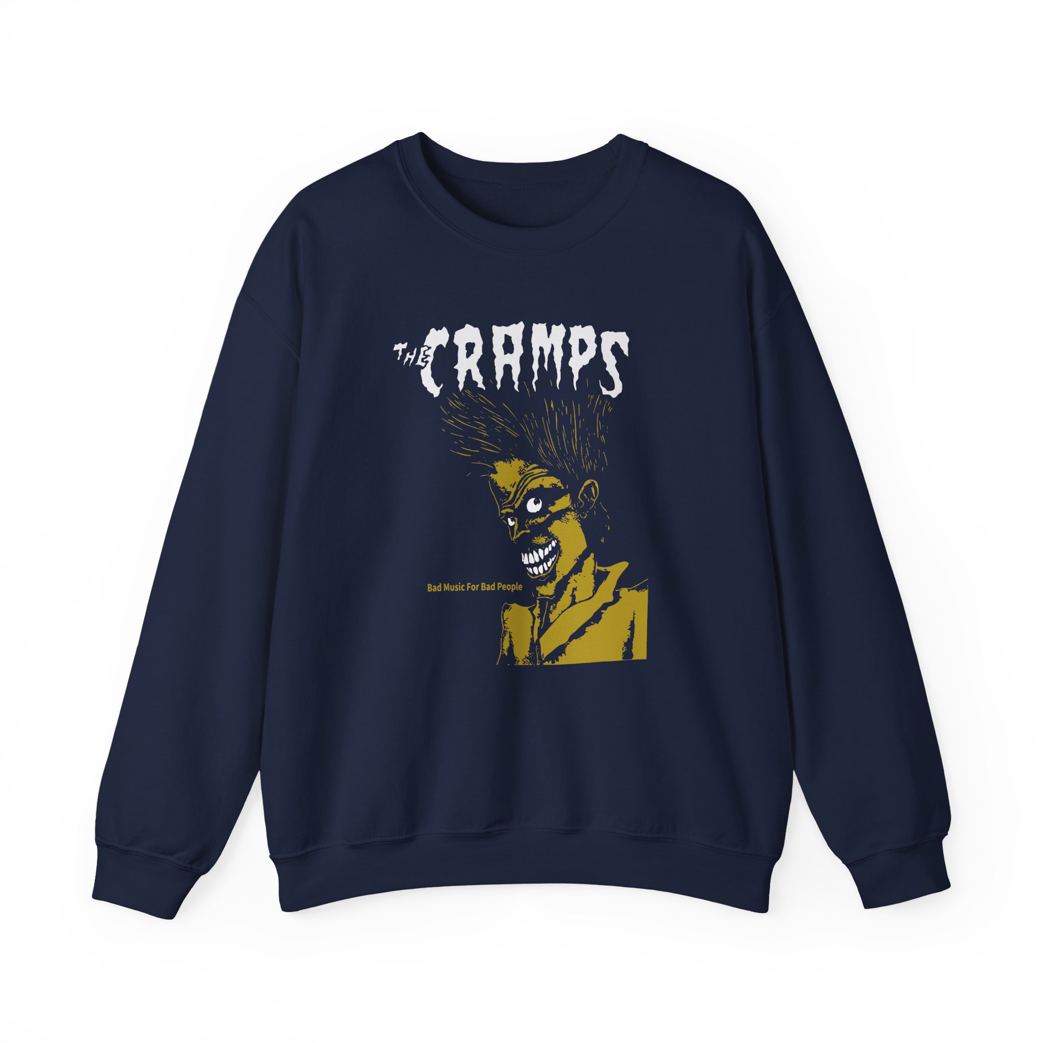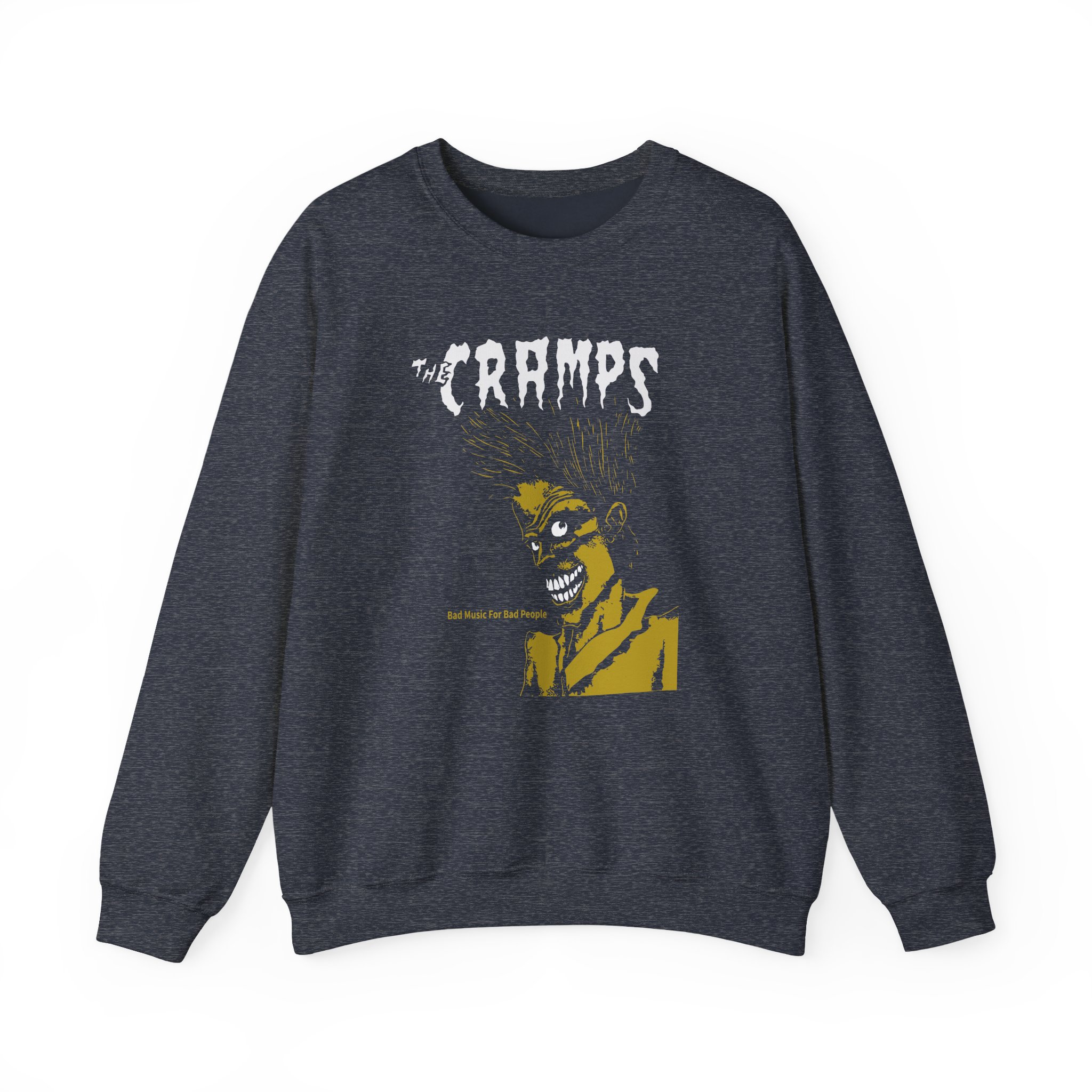 The Gildan 18000 sweatshirt is a The Cramps Bad Music for Bad People unisex heavy blend crewneck made from a 50/50 cotton-polyester fabric, combining softness with lasting durability. Its smooth surface supports crisp, vibrant prints and embroidery, while the ribbed-knit collar and reinforced cuffs help it keep its shape over time. A seamless body design reduces irritation and adds to overall comfort. Practical, sturdy, and print-friendly, the Gildan 18000 sweatshirt remains a top choice for custom apparel.