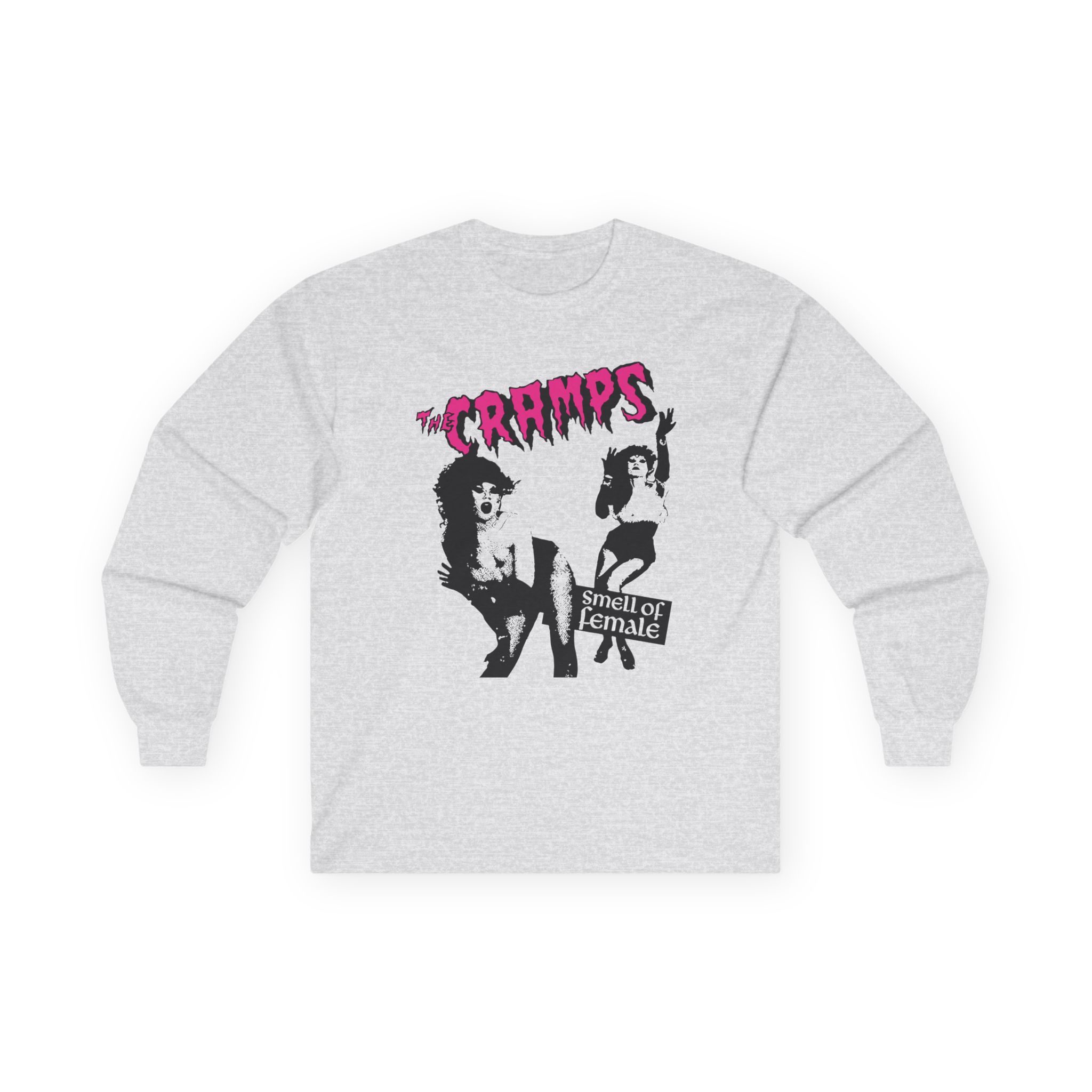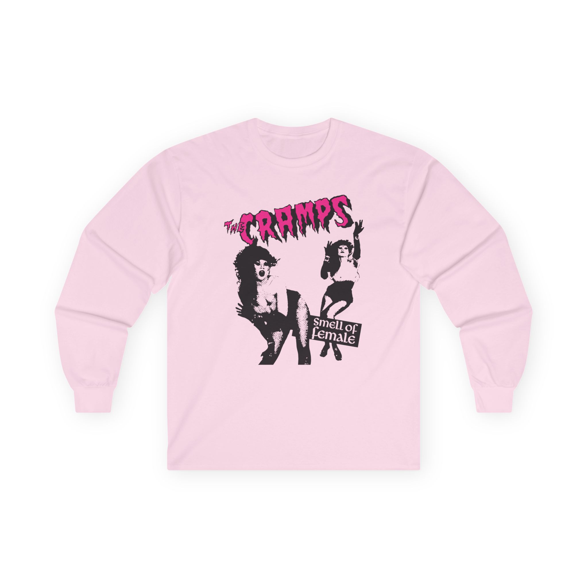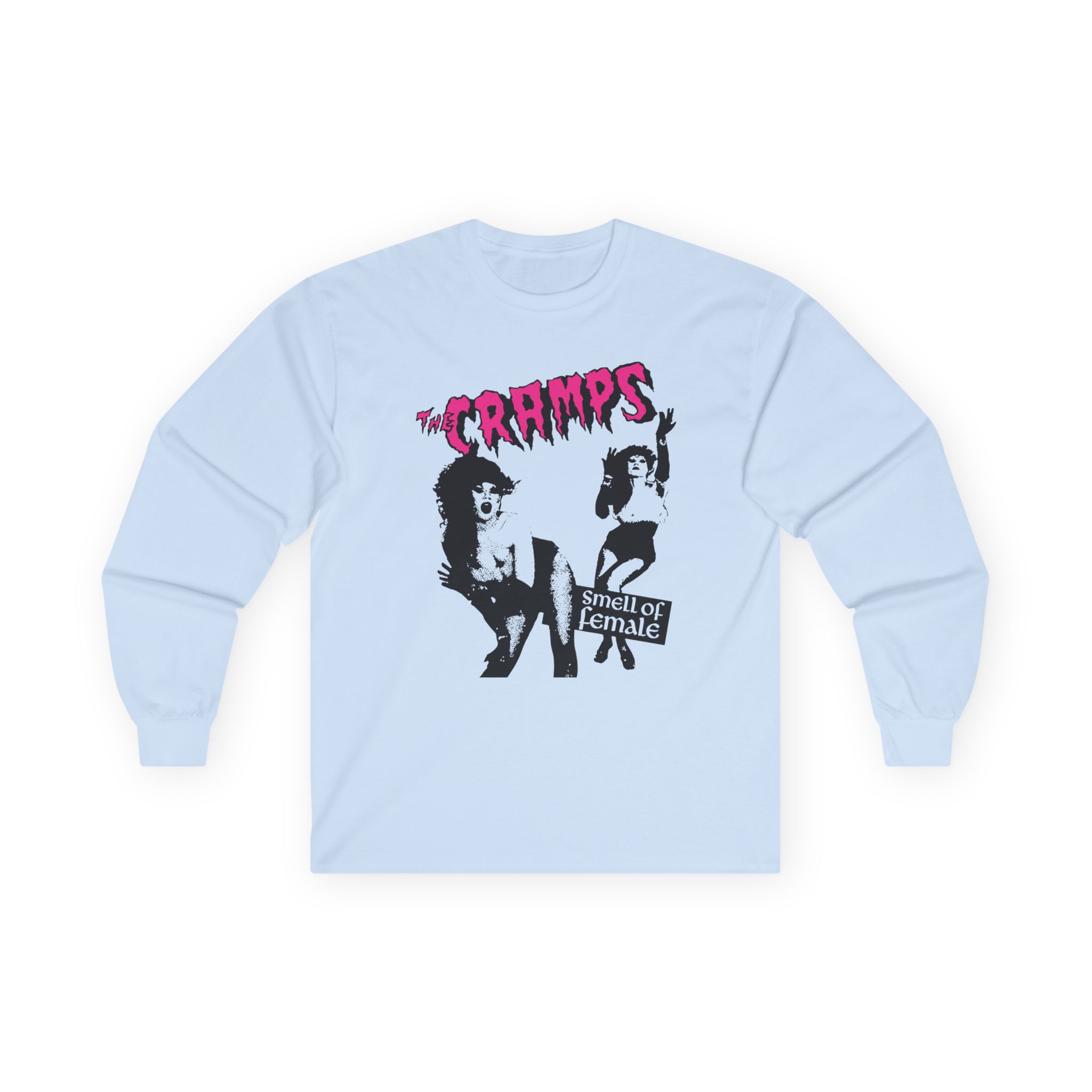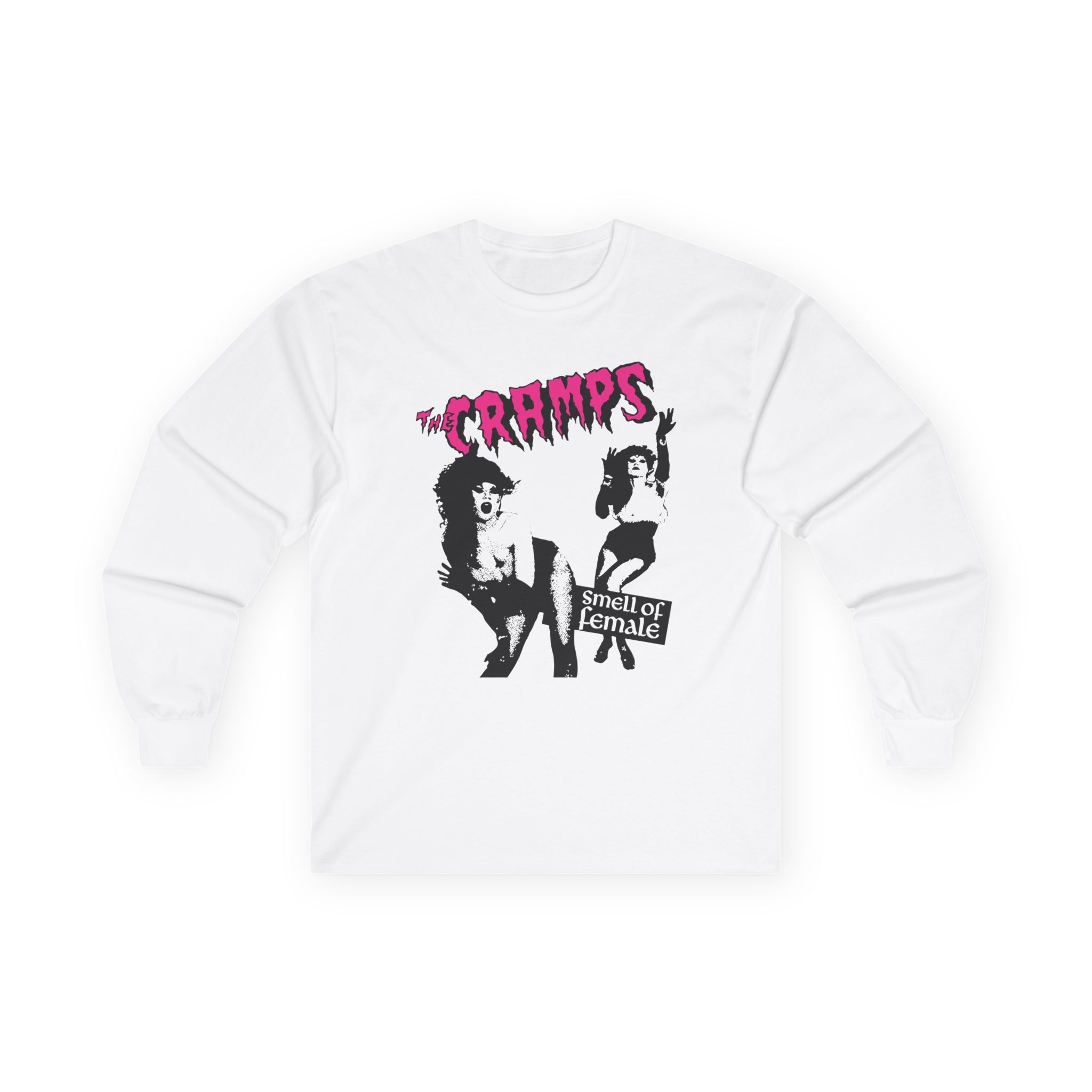 The Cramps Smell of Female long-sleeve tee brings vintage concert vibes to everyday wear. Soft yet substantial cotton and a classic, slightly boxy fit create a lived-in feel that layers well under jackets or stands alone. The front art—bold mirrored sunglasses, a painted blue nose and red lips—feels like a snapshot from an ’80s tour poster. Wear it to record-store hangs, low-key gigs, or when you want a guarded nod to music history without shouting. It’s the kind of shirt that feels like it already remembers a hundred nights out.