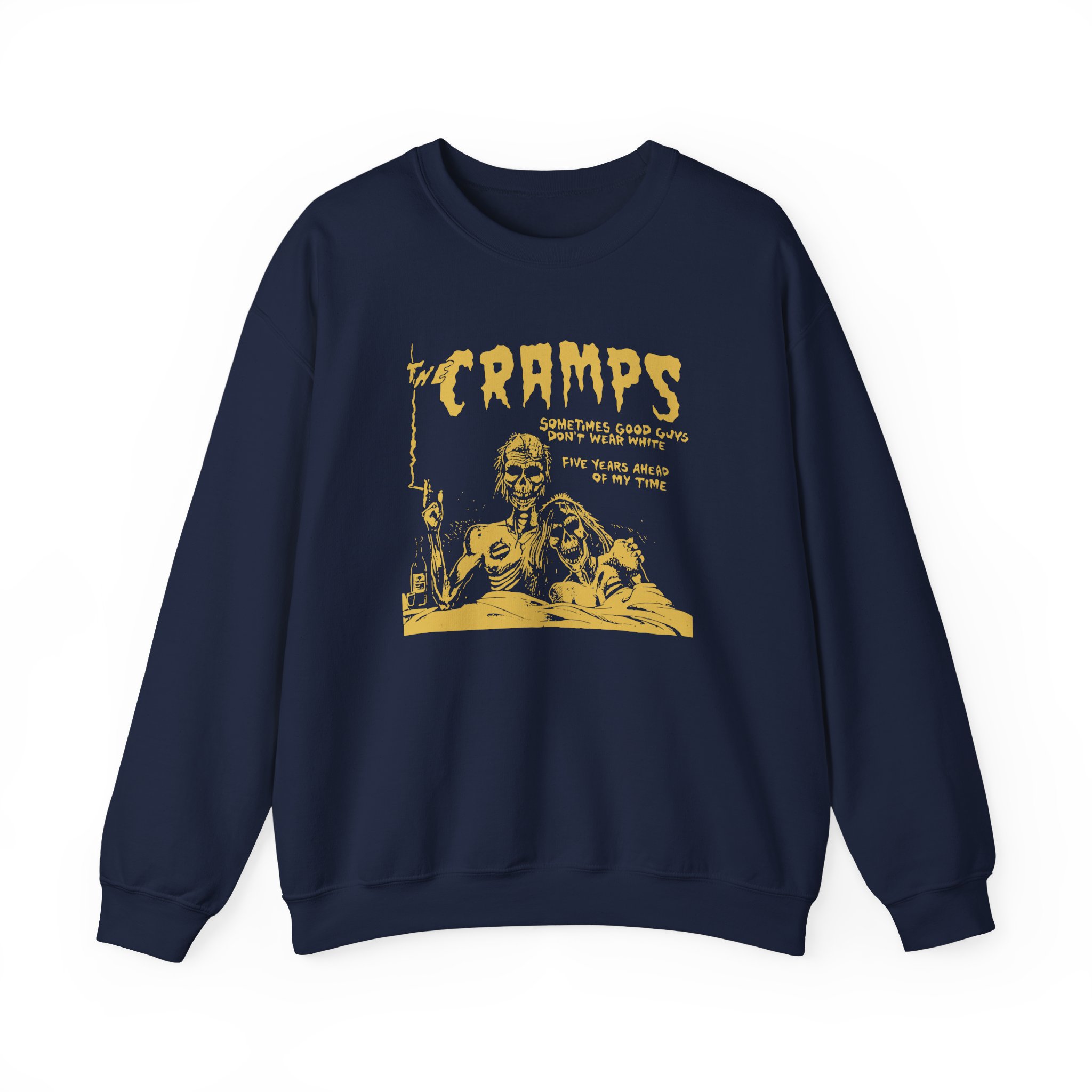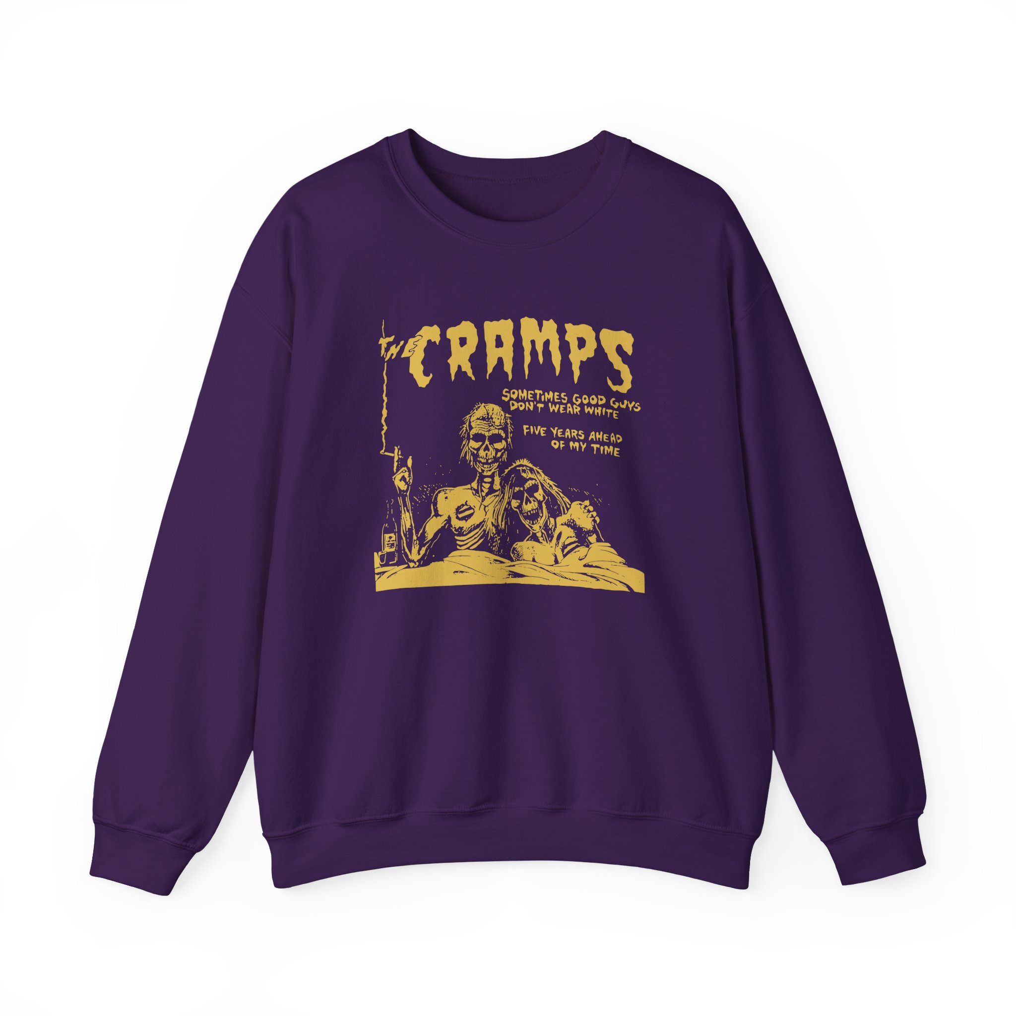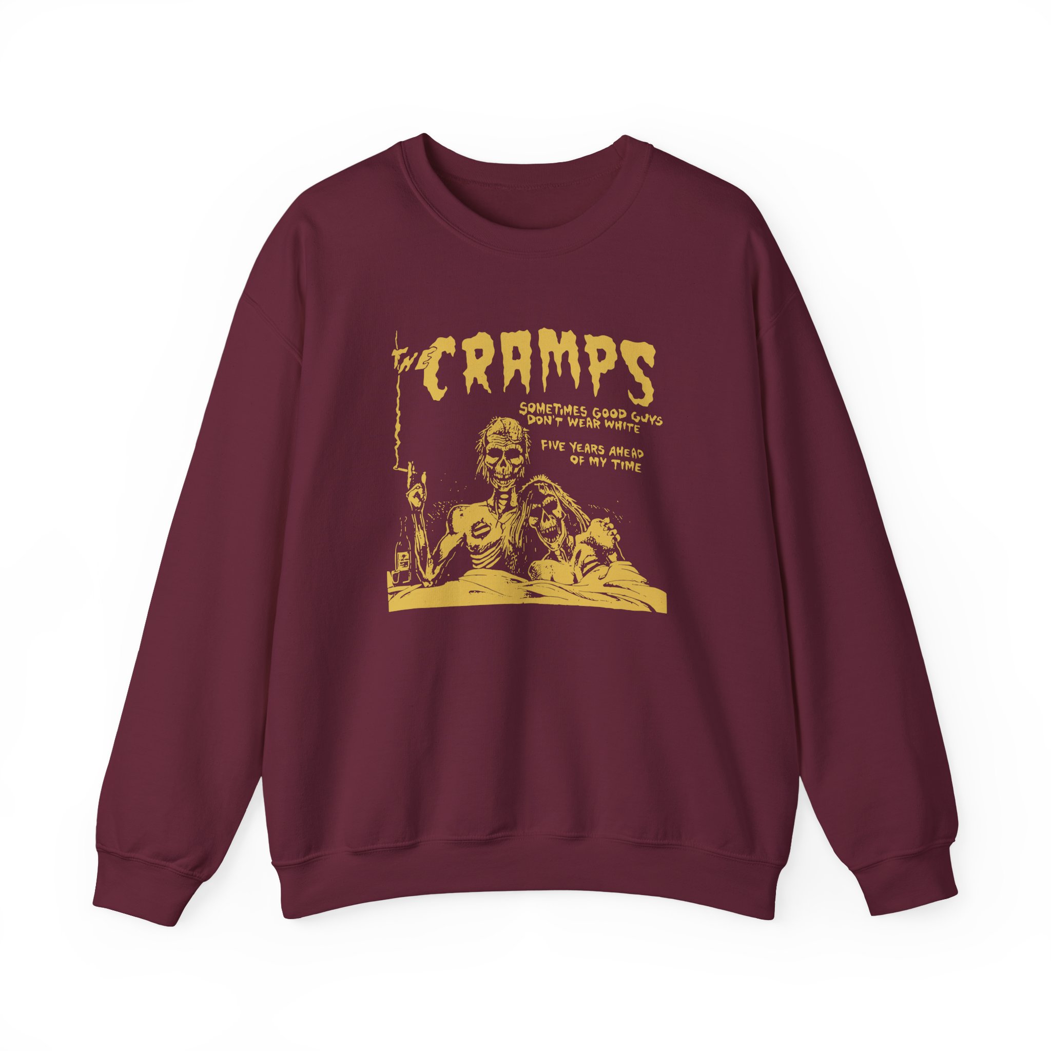 The Gildan 18000 sweatshirt is a The Cramps Sometimes Good Guys Don’t Wear White unisex heavy blend crewneck made from a 50/50 cotton-polyester fabric, combining softness with lasting durability. Its smooth surface supports crisp, vibrant prints and embroidery, while the ribbed-knit collar and reinforced cuffs help it keep its shape over time. A seamless body design reduces irritation and adds to overall comfort. Practical, sturdy, and print-friendly, the Gildan 18000 sweatshirt remains a top choice for custom apparel.