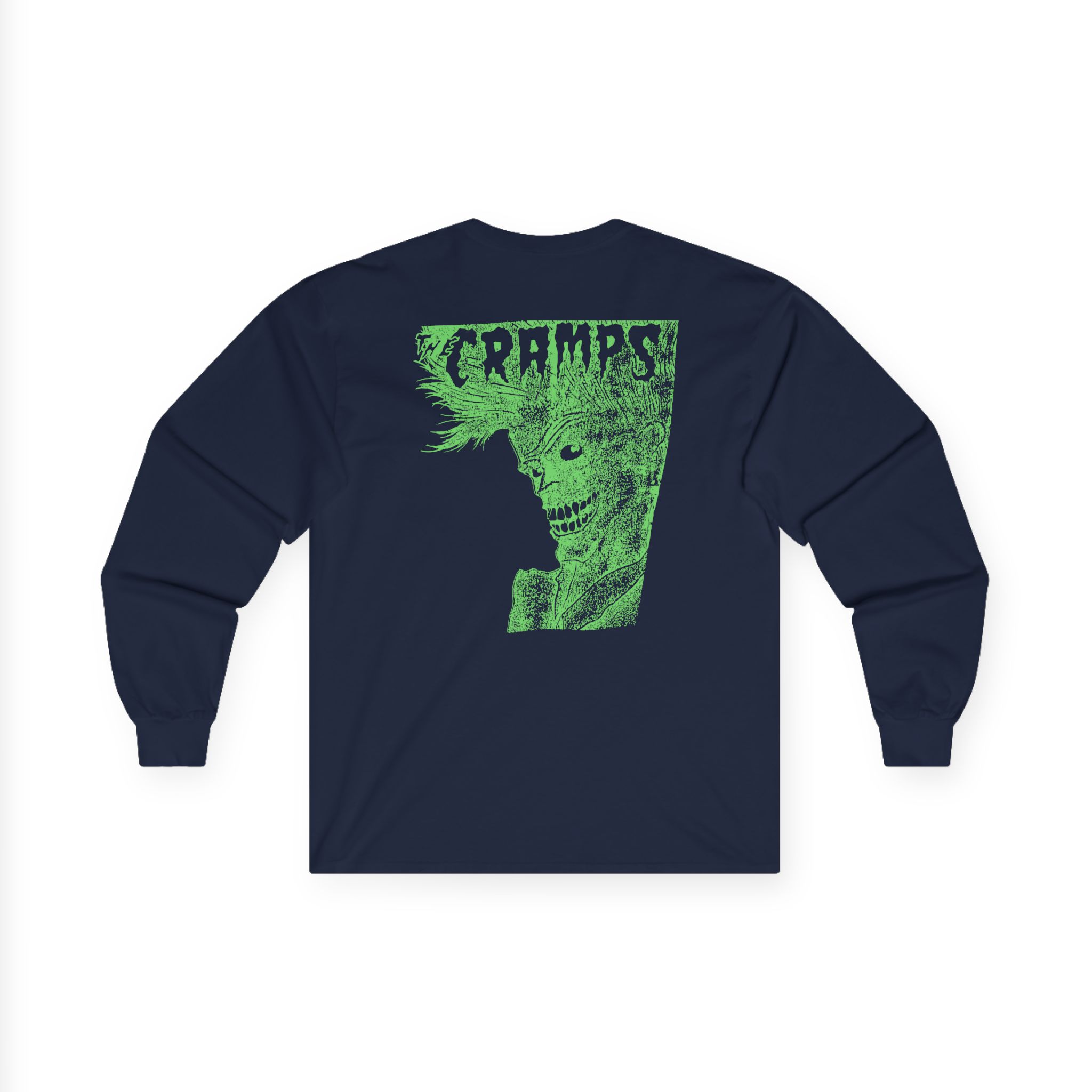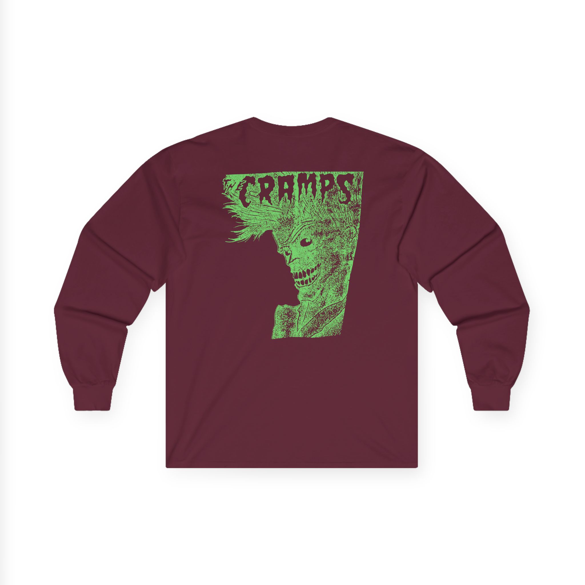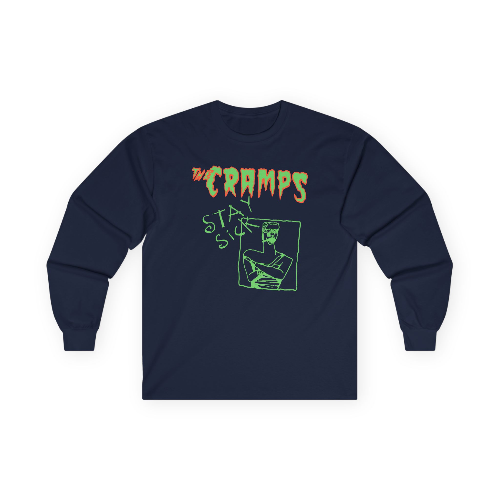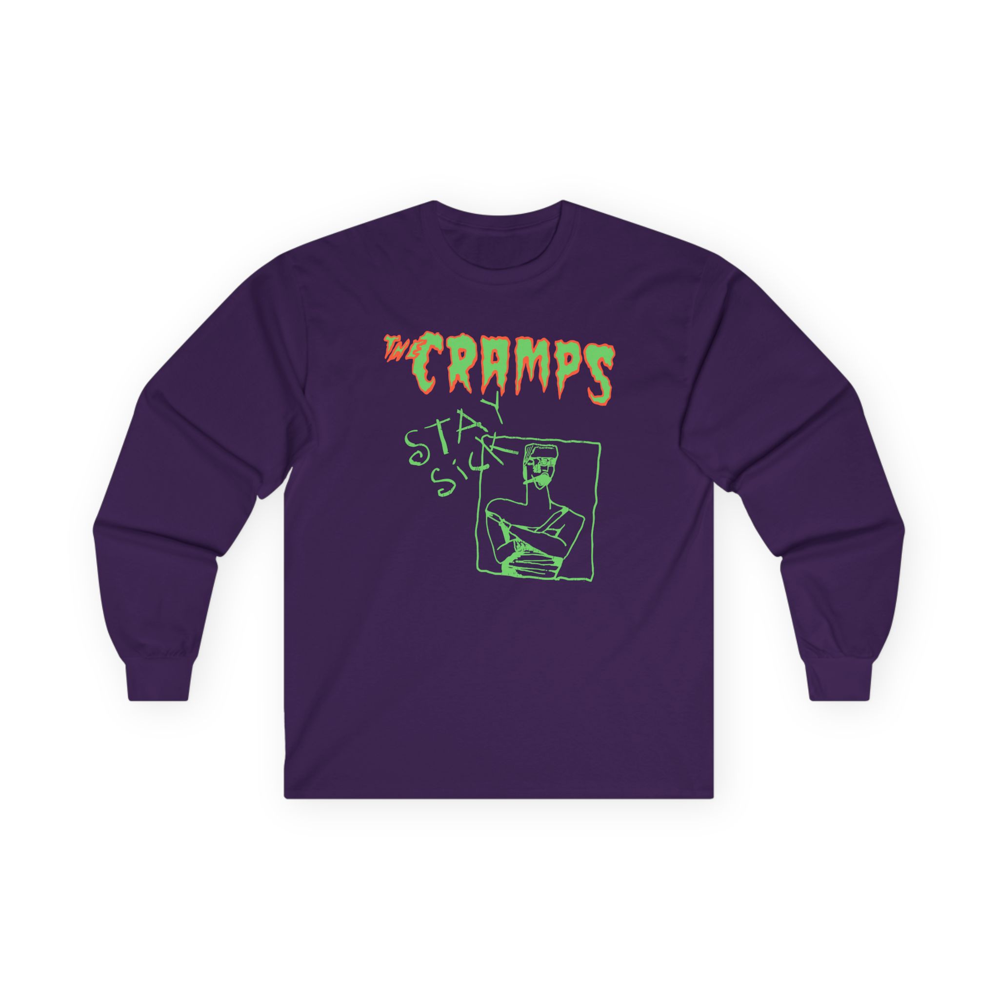 The Cramps Stay Sick long-sleeve tee brings vintage concert vibes to everyday wear. Soft yet substantial cotton and a classic, slightly boxy fit create a lived-in feel that layers well under jackets or stands alone. The front art—bold mirrored sunglasses, a painted blue nose and red lips—feels like a snapshot from an ’80s tour poster. Wear it to record-store hangs, low-key gigs, or when you want a guarded nod to music history without shouting. It’s the kind of shirt that feels like it already remembers a hundred nights out.
