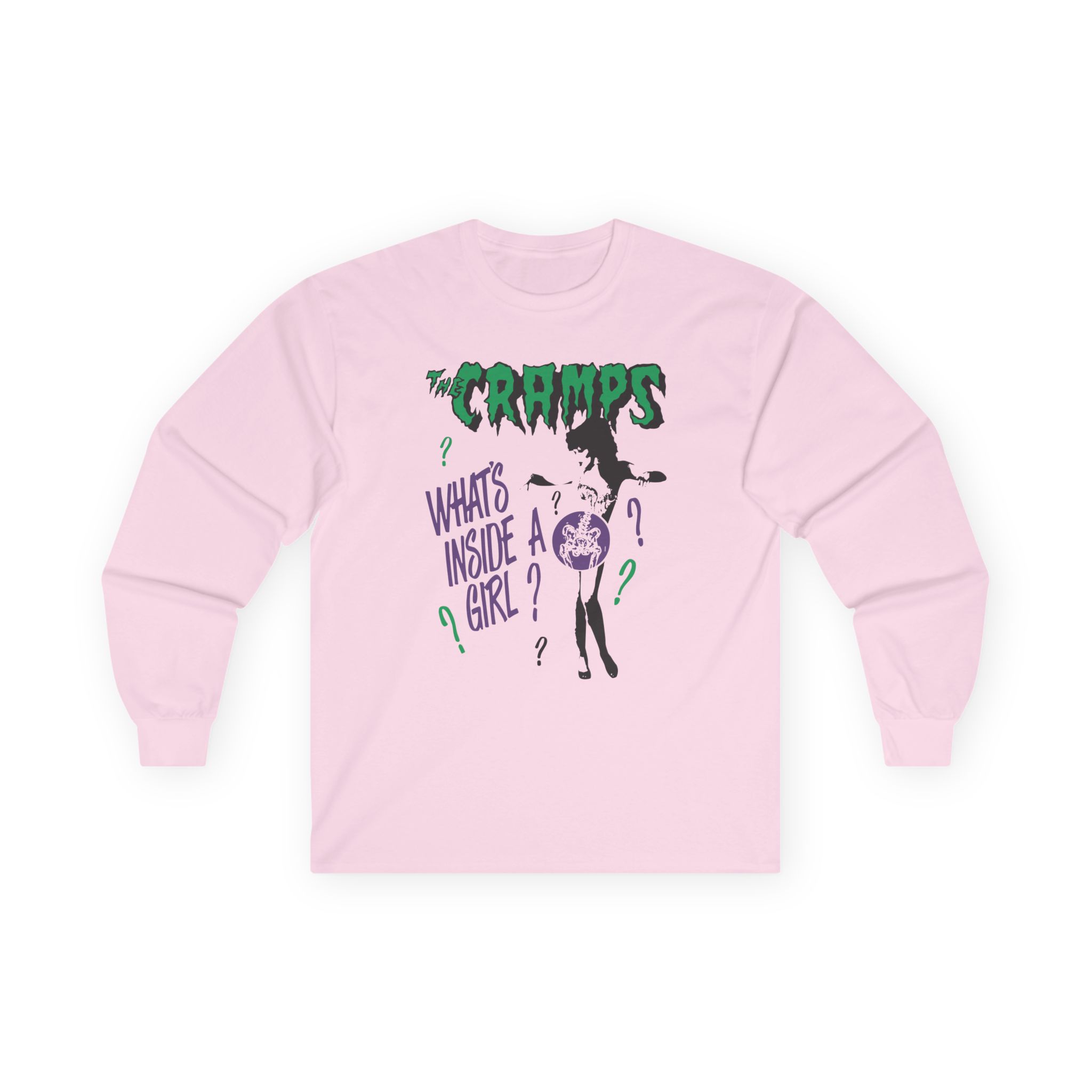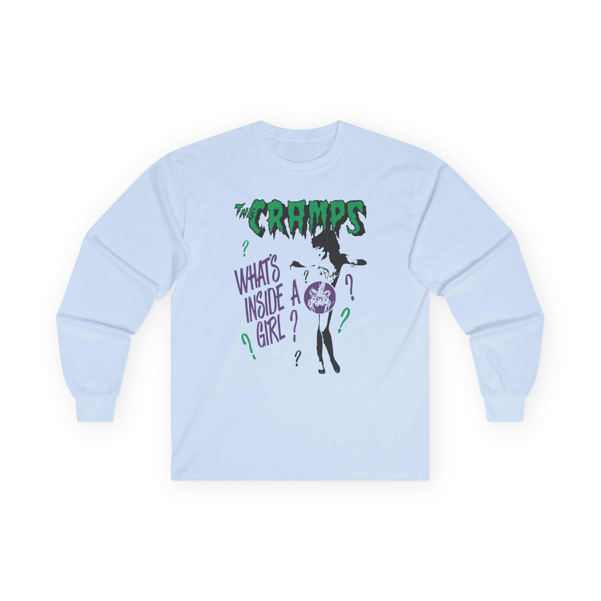 The Cramps What's Inside a Girl long-sleeve tee brings vintage concert vibes to everyday wear. Soft yet substantial cotton and a classic, slightly boxy fit create a lived-in feel that layers well under jackets or stands alone. The front art—bold mirrored sunglasses, a painted blue nose and red lips—feels like a snapshot from an ’80s tour poster. Wear it to record-store hangs, low-key gigs, or when you want a guarded nod to music history without shouting. It’s the kind of shirt that feels like it already remembers a hundred nights out.
