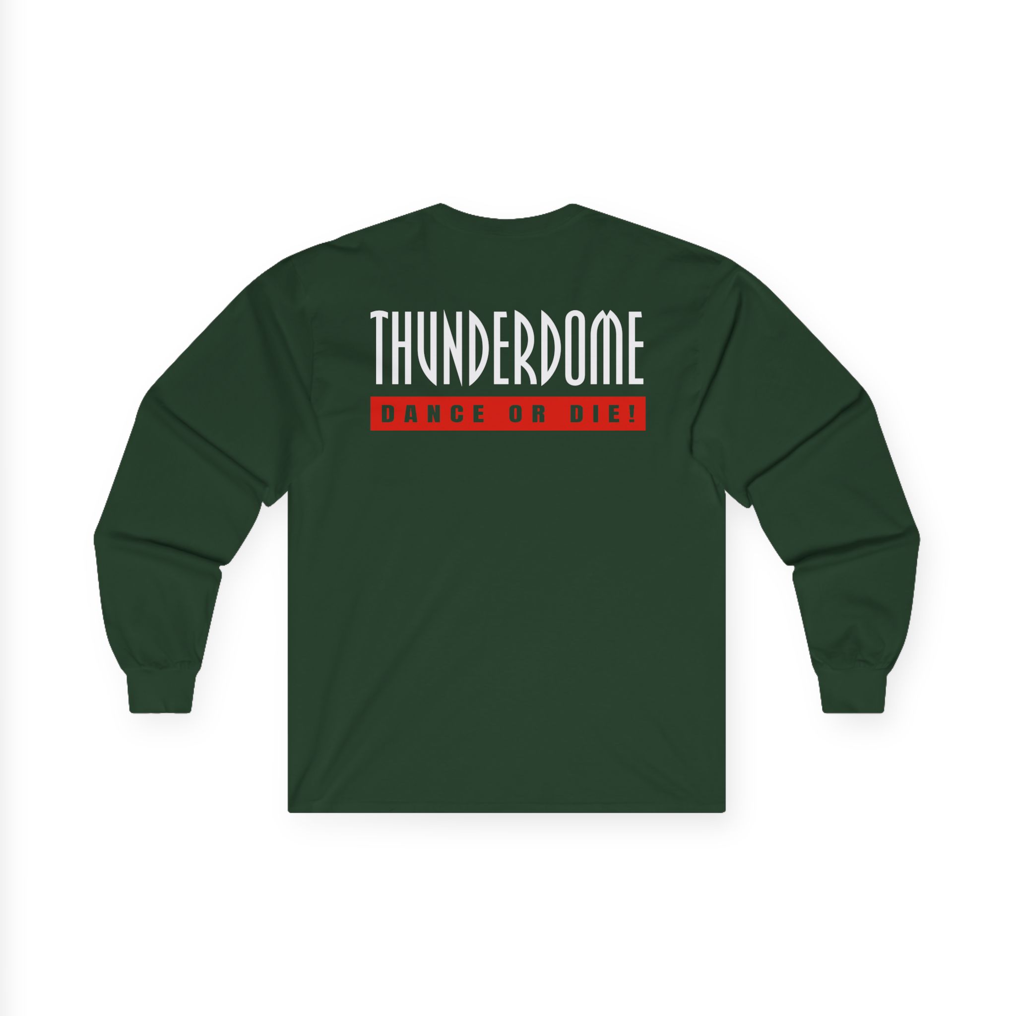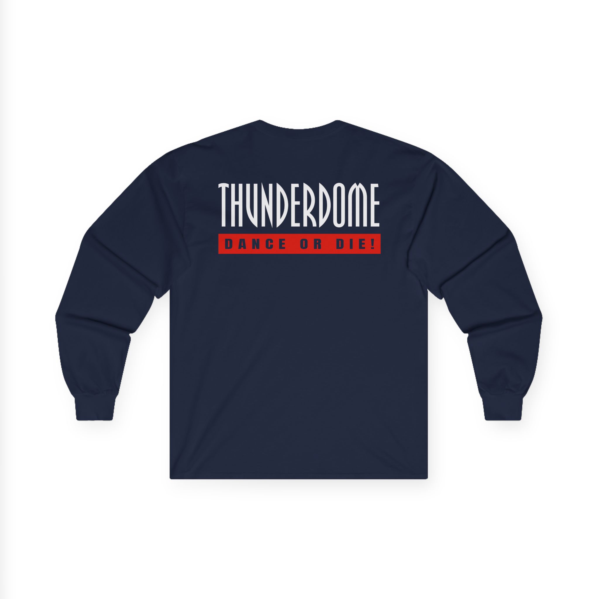 This Thunderdome Dance Or Die long-sleeve tee brings vintage concert vibes to everyday wear. Soft yet substantial cotton and a classic, slightly boxy fit create a lived-in feel that layers well under jackets r stands alone. The front art—bold mirrored sunglasses, a painted blue nose and red lips—feels like a snapshot from an ’80s tour poster. Wear it to record-store hangs, low-key gigs, or when you want a guarded nod to music history without shouting. It’s the kind of shirt that feels like it already remembers a hundred nights out.