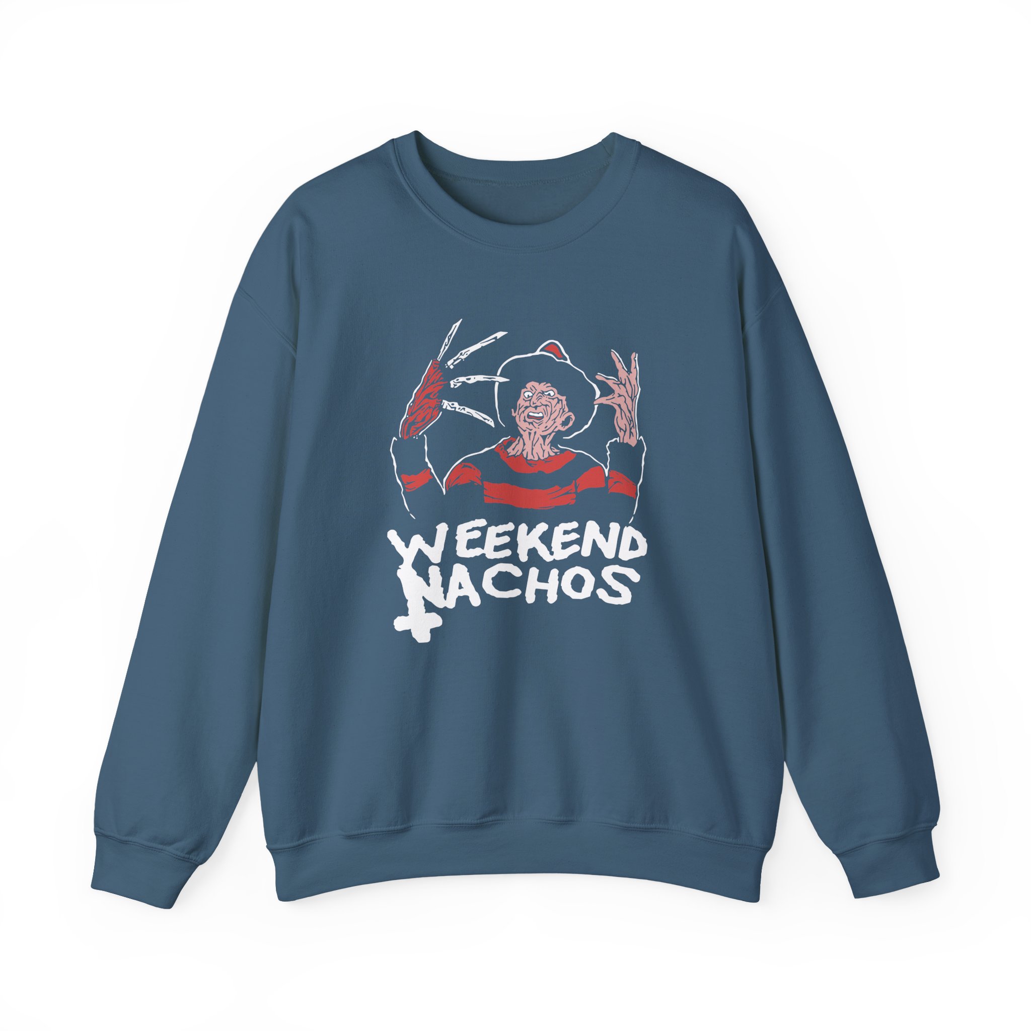 The Gildan 18000 sweatshirt is a Weekend Nachos Freddy unisex heavy blend crewneck made from a 50/50 cotton-polyester fabric, combining softness with lasting durability. Its smooth surface supports crisp, vibrant prints and embroidery, while the ribbed-knit collar and reinforced cuffs help it keep its shape over time. A seamless body design reduces irritation and adds to overall comfort. Practical, sturdy, and print-friendly, the Gildan 18000 sweatshirt remains a top choice for custom apparel.