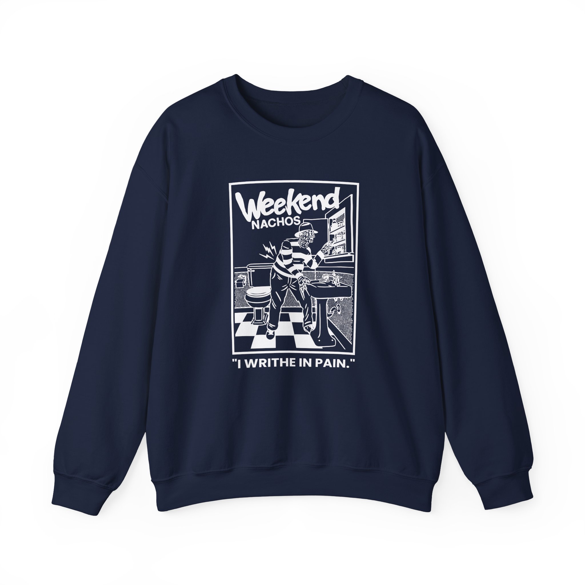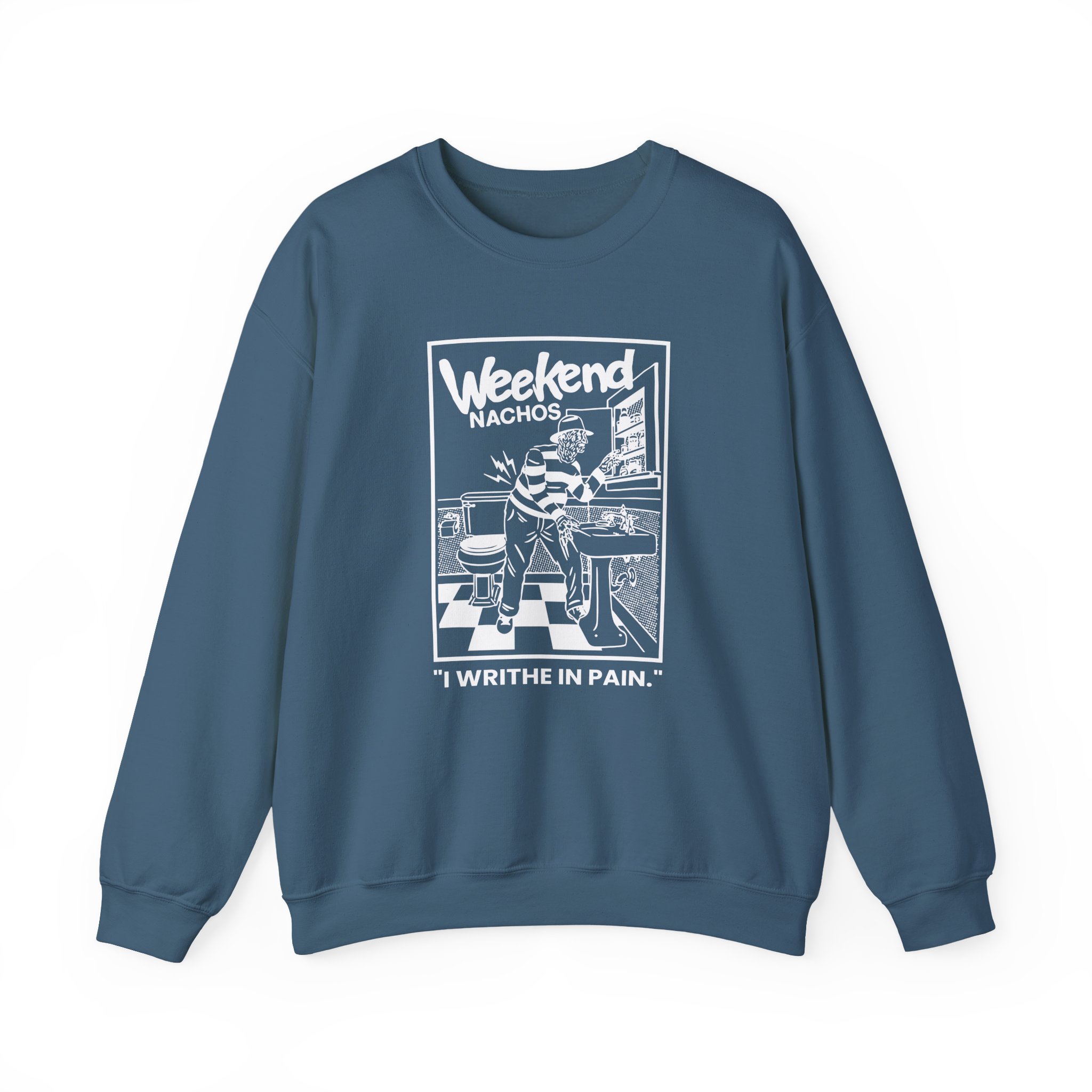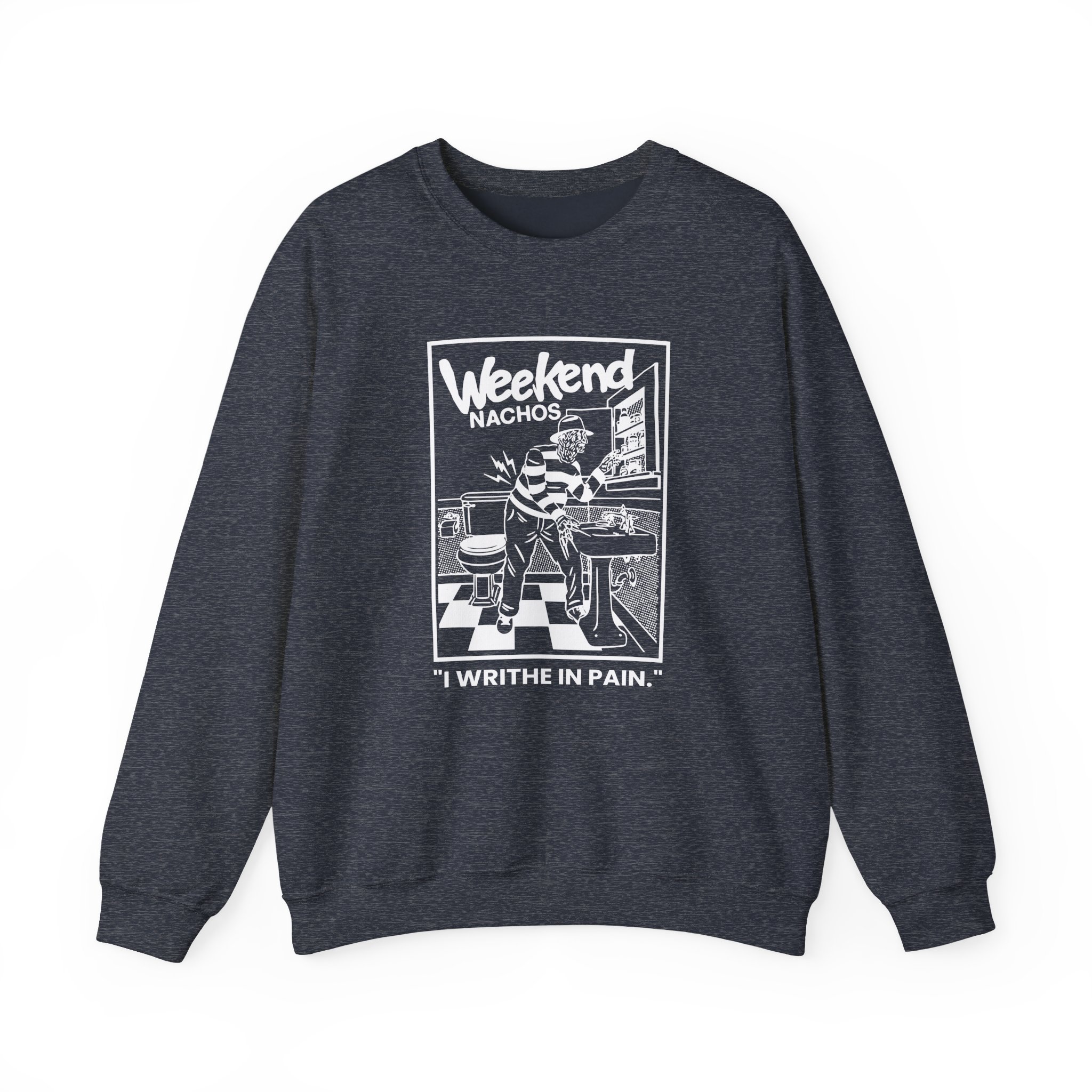 The Gildan 18000 sweatshirt is a Weekend Nachos I Writhe in Pain unisex heavy blend crewneck made from a 50/50 cotton-polyester fabric, combining softness with lasting durability. Its smooth surface supports crisp, vibrant prints and embroidery, while the ribbed-knit collar and reinforced cuffs help it keep its shape over time. A seamless body design reduces irritation and adds to overall comfort. Practical, sturdy, and print-friendly, the Gildan 18000 sweatshirt remains a top choice for custom apparel.