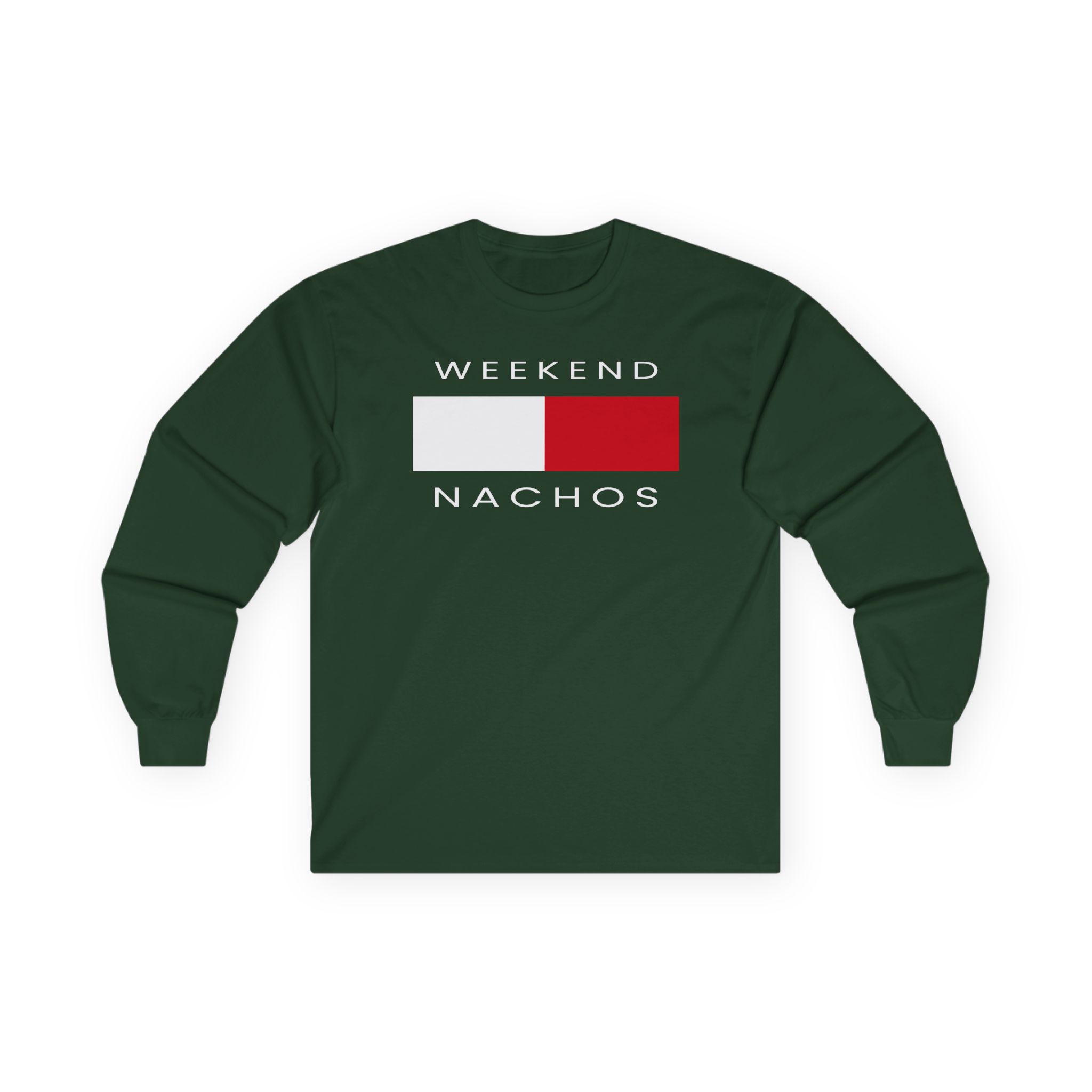 This Weekend Nachos long-sleeve tee brings vintage concert vibes to everyday wear. Soft yet substantial cotton and a classic, slightly boxy fit create a lived-in feel that layers well under jackets or stands alone. The front art—bold mirrored sunglasses, a painted blue nose and red lips—feels like a snapshot from an ’80s tour poster. Wear it to record-store hangs, low-key gigs, or when you want a guarded nod to music history without shouting. It’s the kind of shirt that feels like it already remembers a hundred nights out.